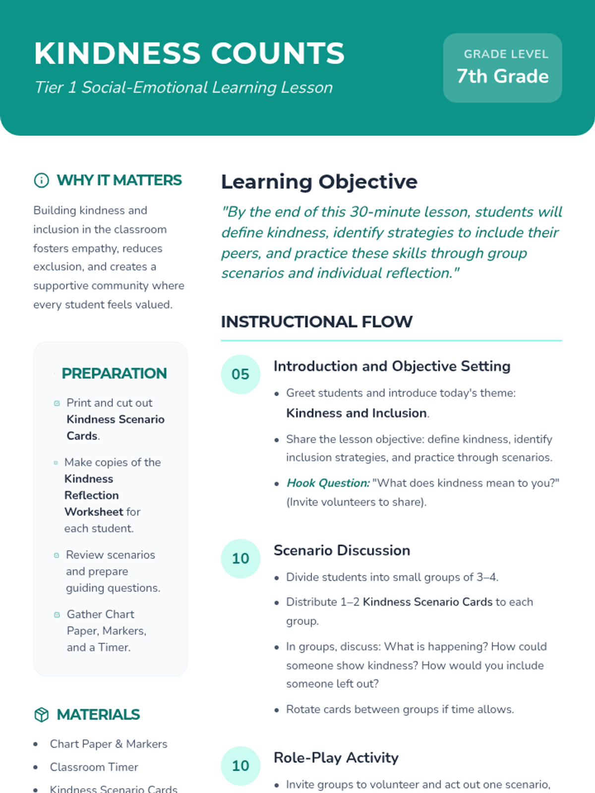 A 30-minute Tier 1 lesson for 7th graders focused on empathy, inclusive behavior, and practical strategies for fostering a kind classroom community.