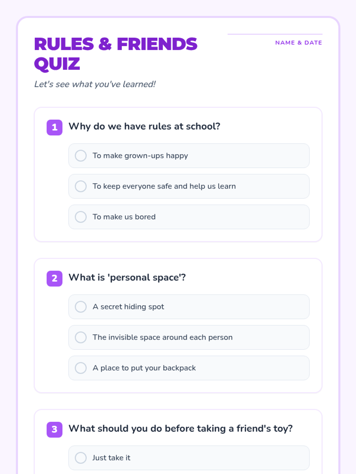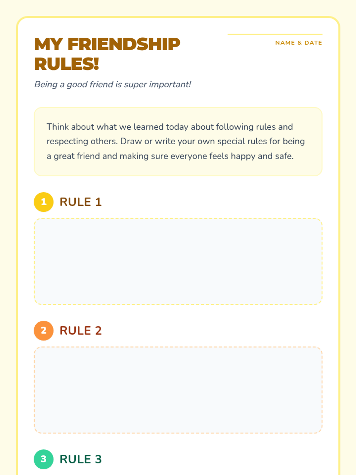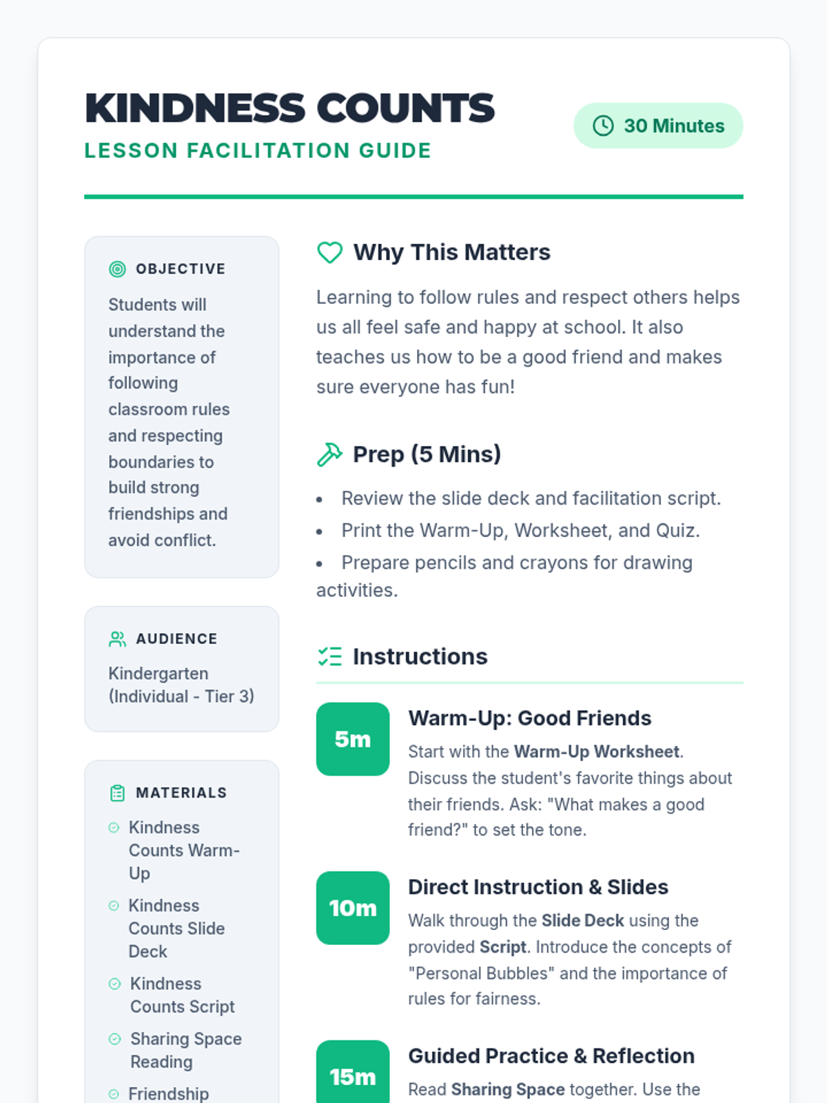 A 30-minute individual lesson for Kindergarten students focused on understanding classroom rules and respecting personal boundaries to build strong friendships.