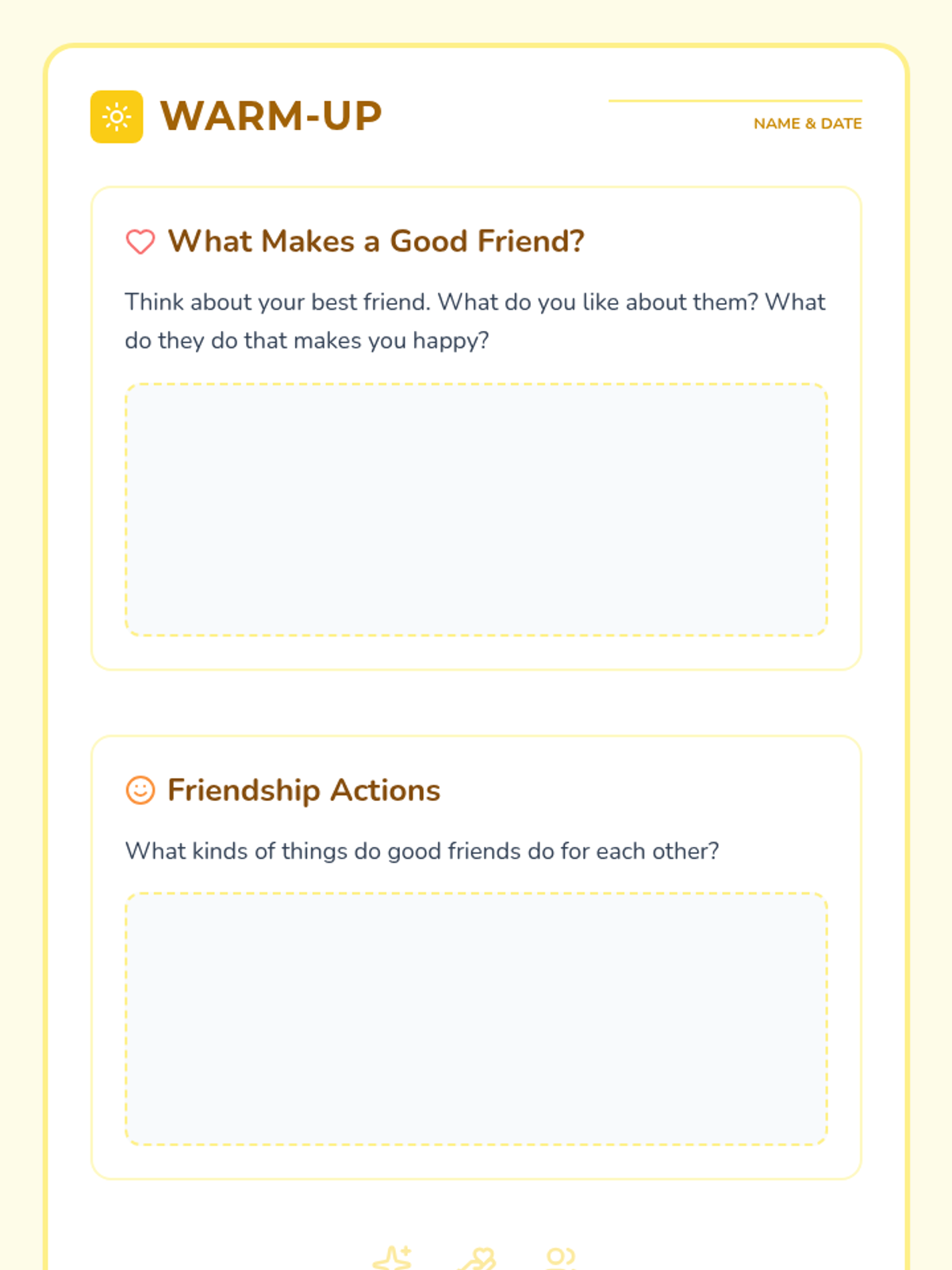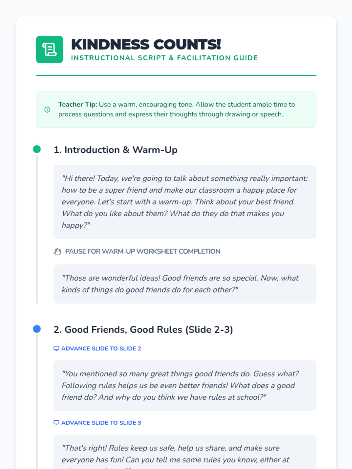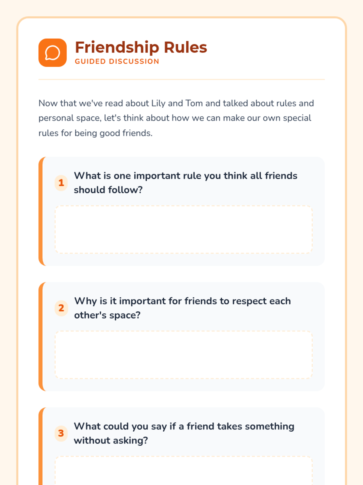A 30-minute individual lesson for Kindergarten students focused on understanding classroom rules and respecting personal boundaries to build strong friendships.