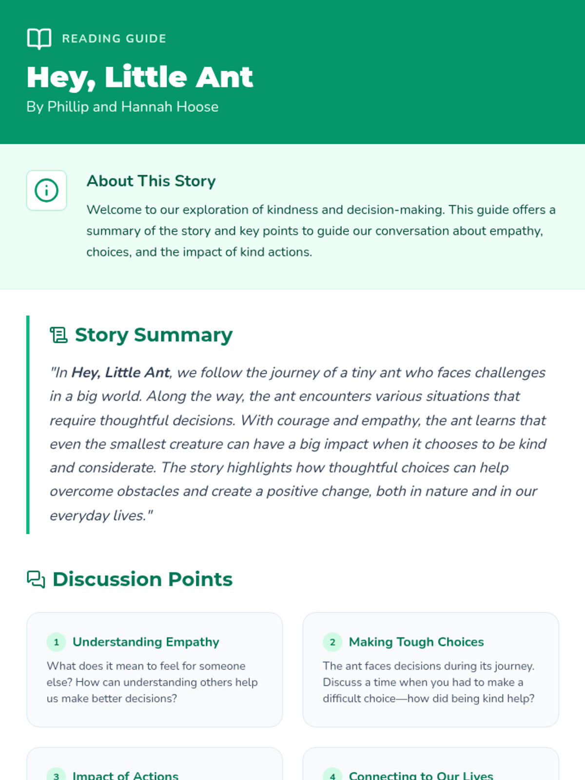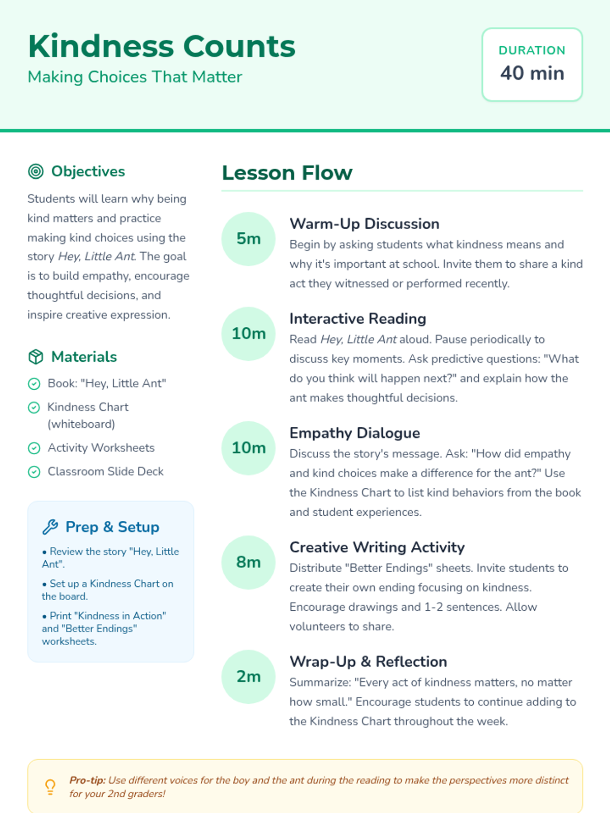 A Grade 2 social-emotional learning lesson centered on the book 'Hey, Little Ant', focusing on empathy, kindness, and making thoughtful choices. Students engage in interactive reading, group discussions, and creative writing to explore the impact of their actions.