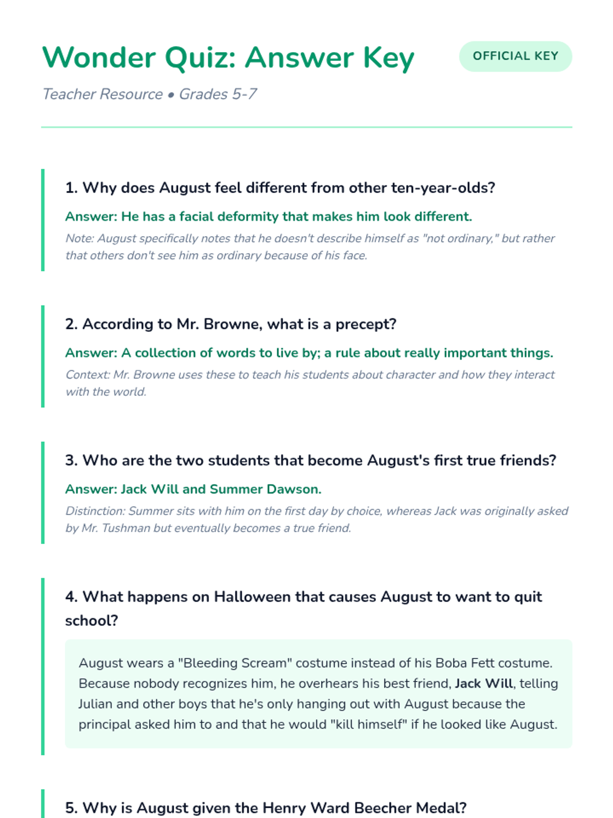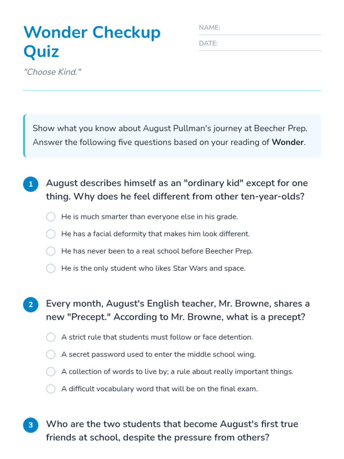 A short assessment and review session focused on basic comprehension of the novel Wonder by R.J. Palacio, emphasizing key plot points and character growth.