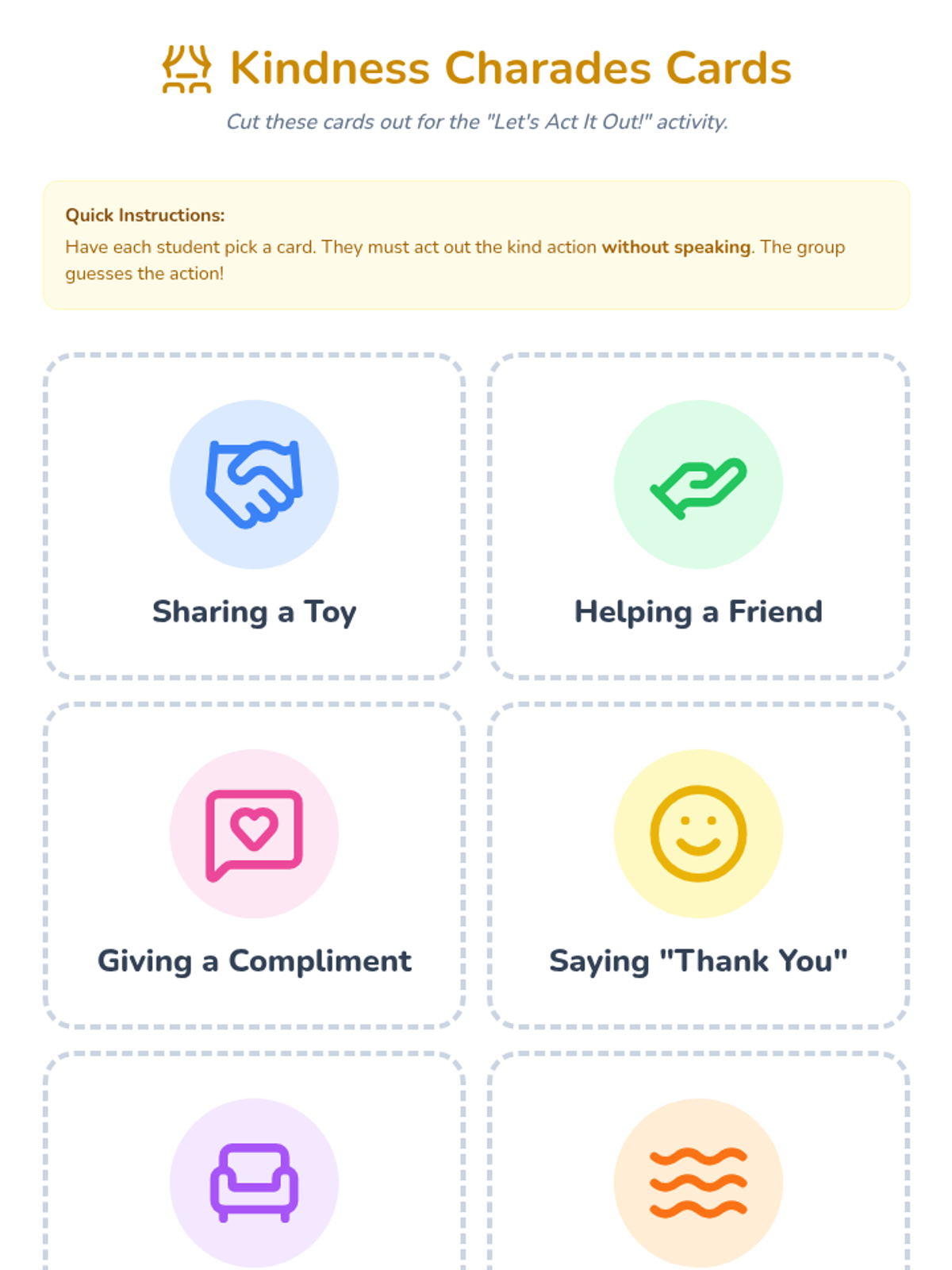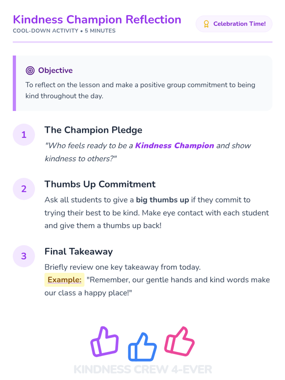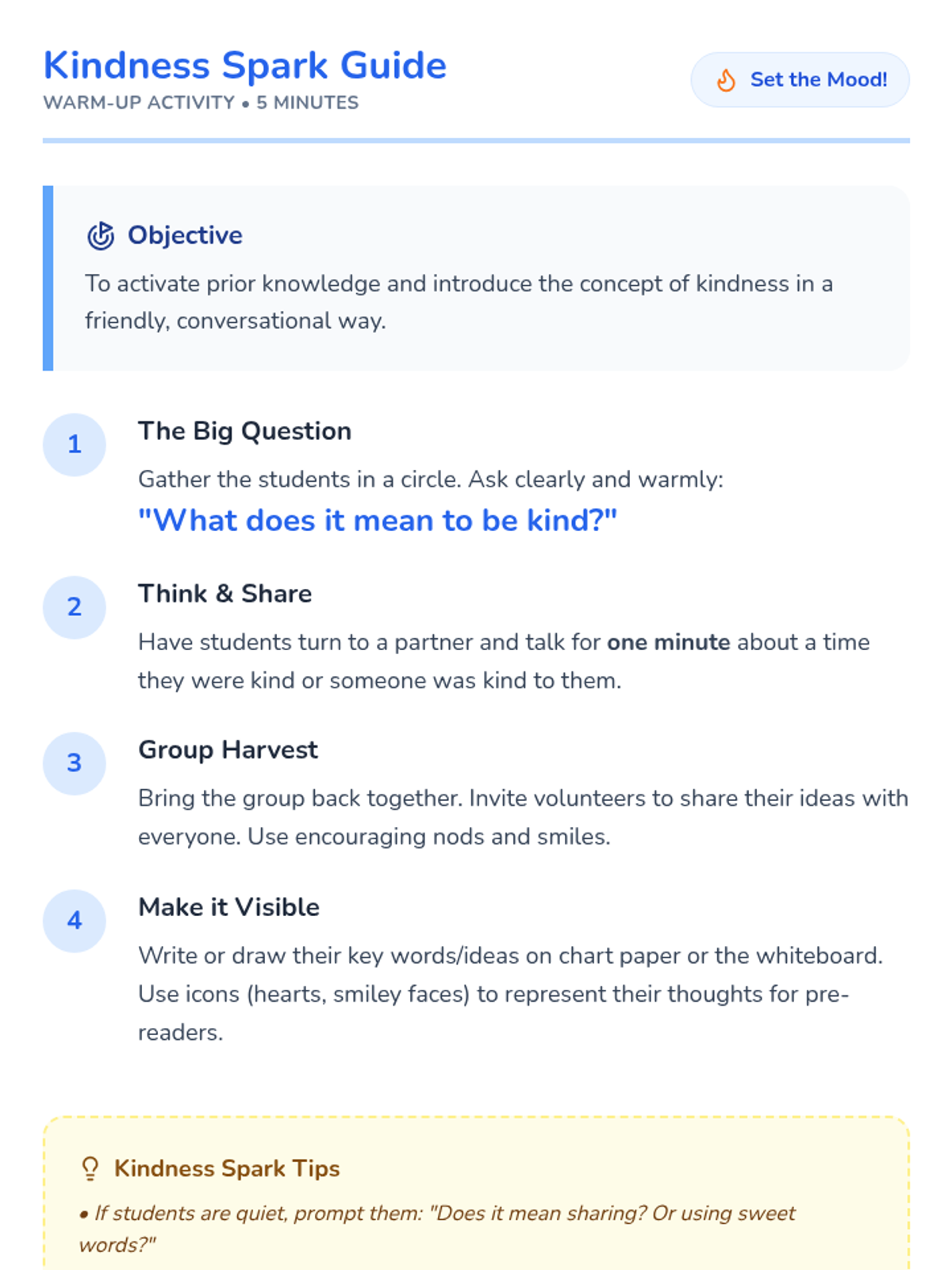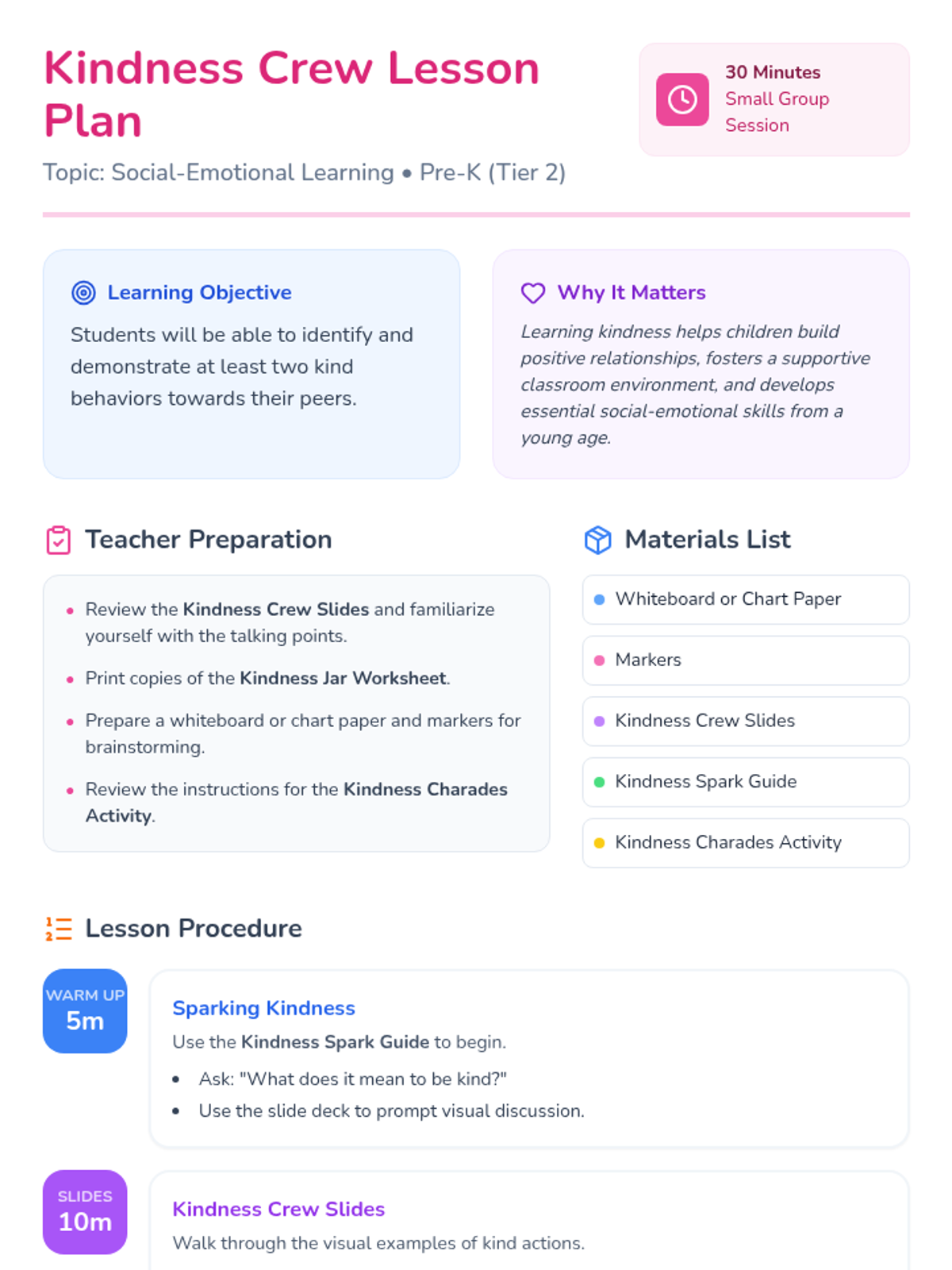 A small group lesson for Pre-Kindergarten students focused on identifying and practicing kind behaviors through discussion, play, and creative expression.