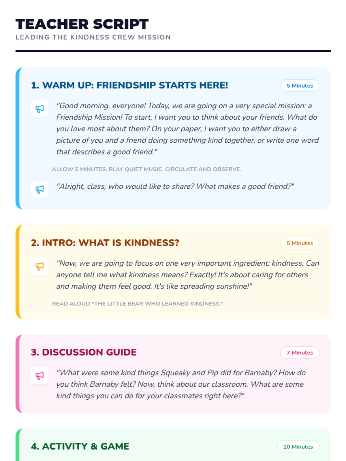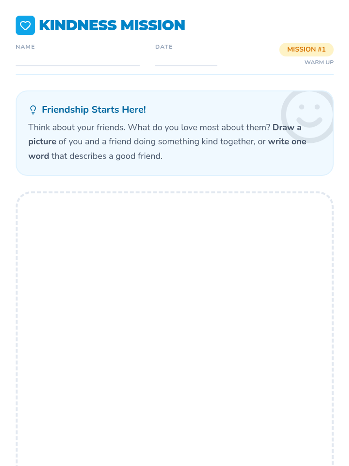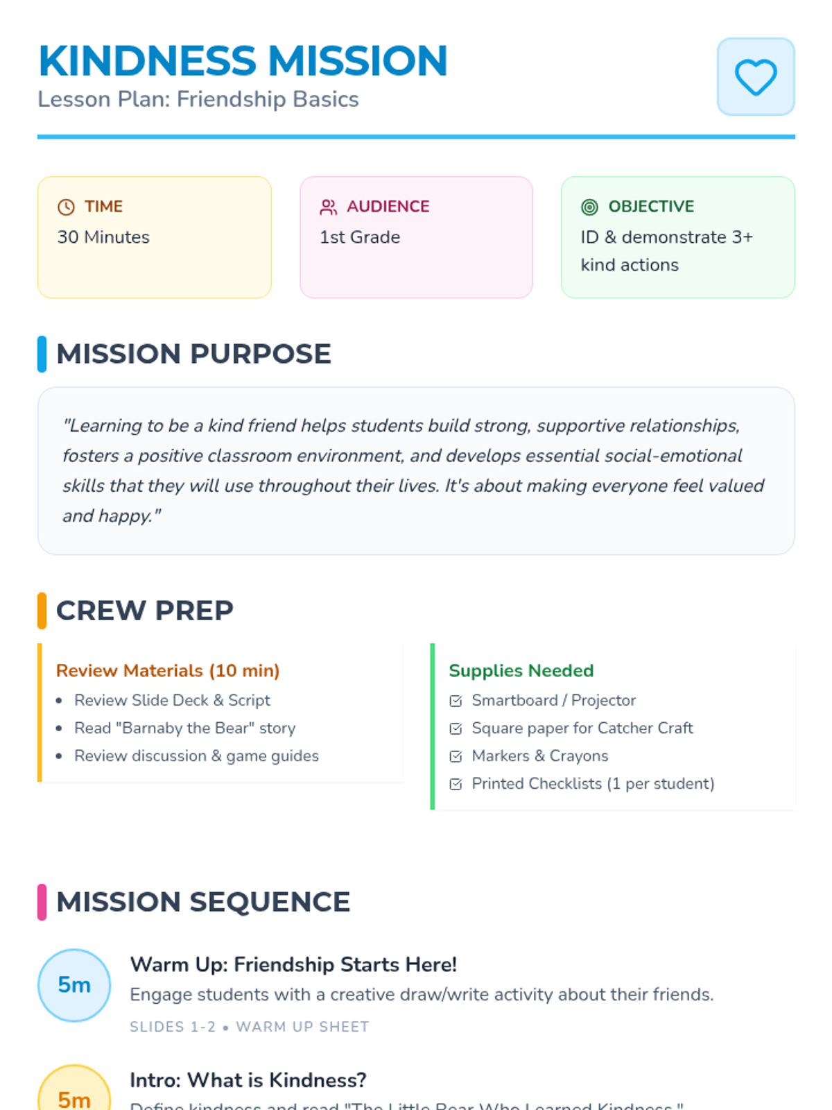 A 30-minute lesson for first-grade students focused on identifying and practicing kind behaviors to build strong friendships and a positive classroom community.