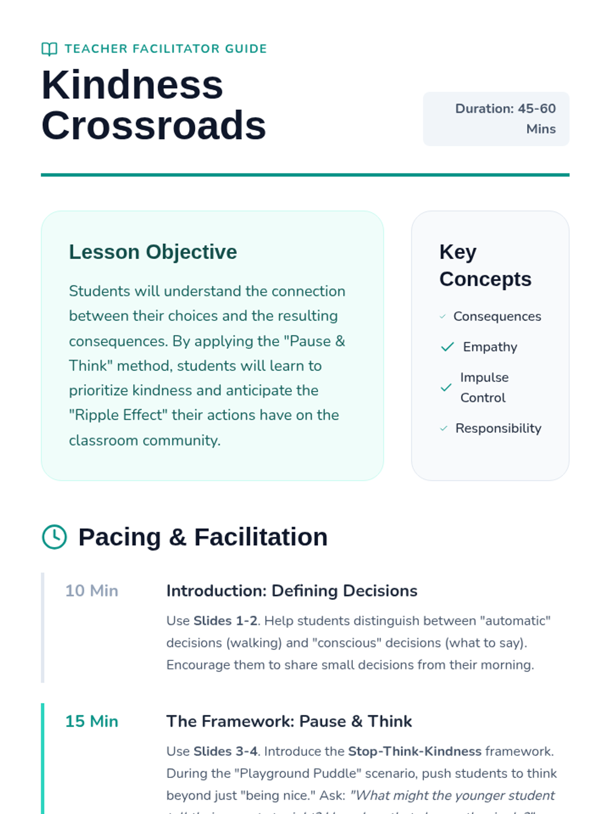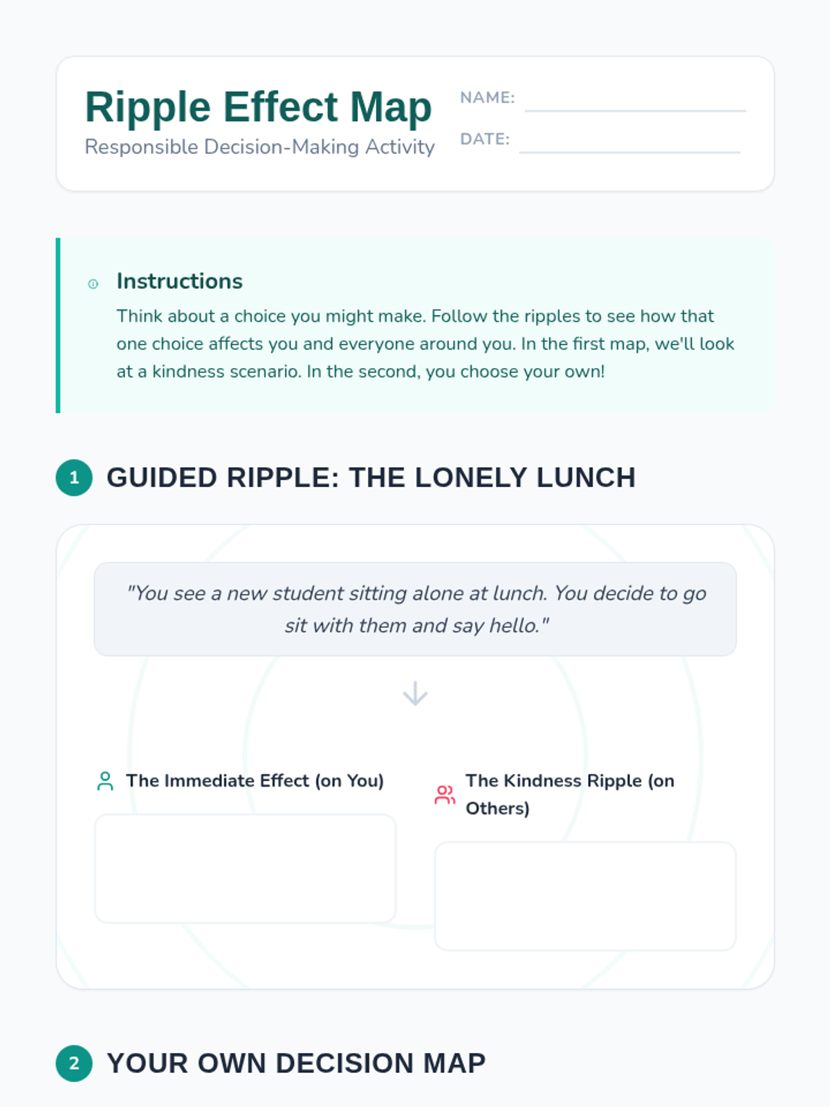 A lesson focusing on responsible decision-making, where students learn to evaluate consequences and prioritize kindness through the 'Ripple Effect' framework. Includes interactive scenarios and a mapping activity to visualize the impact of choices.