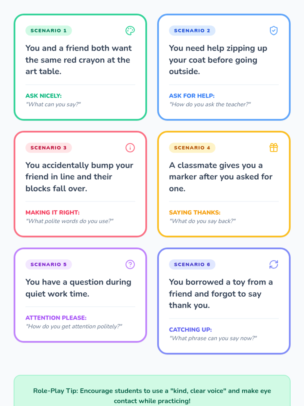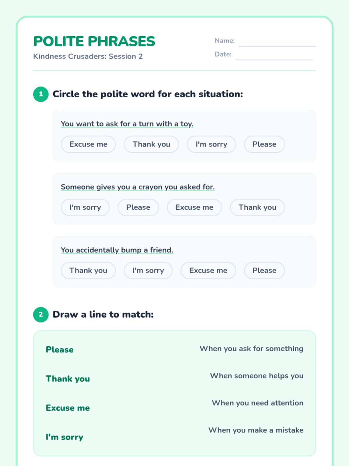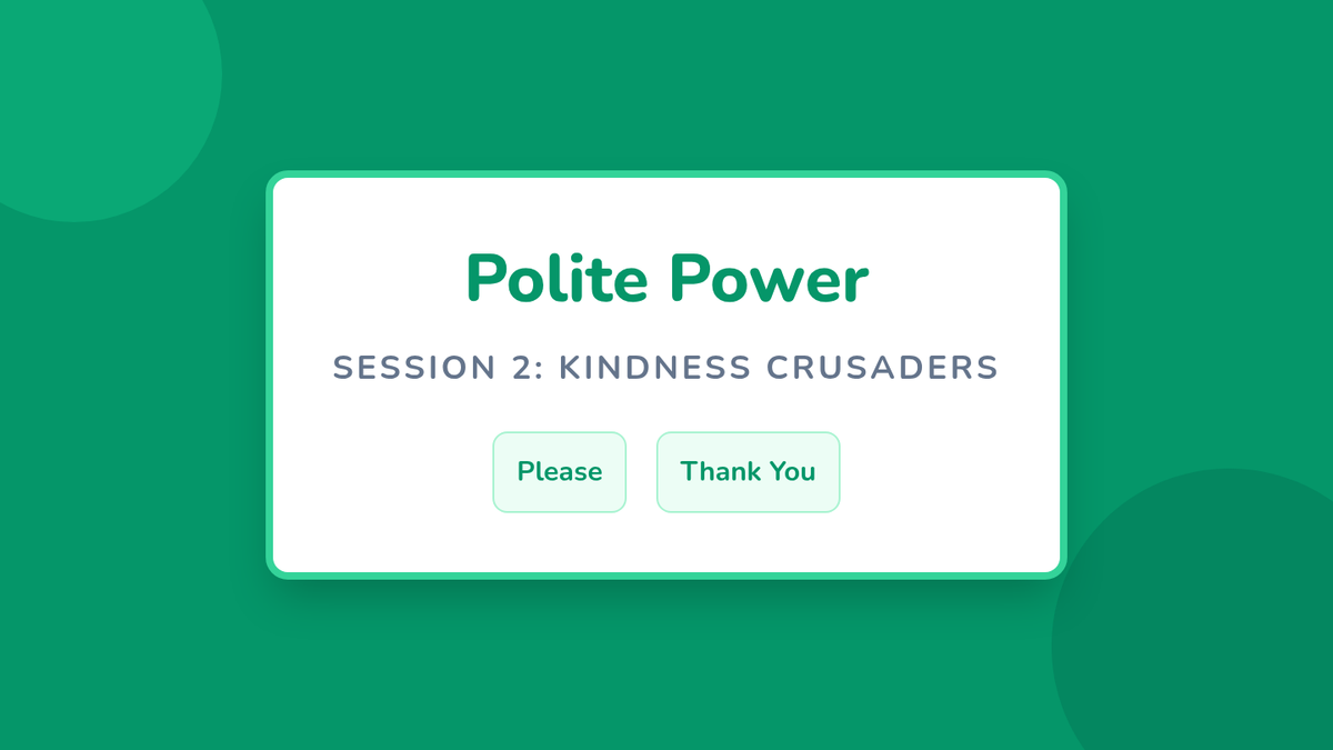 Students will learn and practice four polite phrases (please, thank you, excuse me, I'm sorry) and use role-play to solve common social problems.