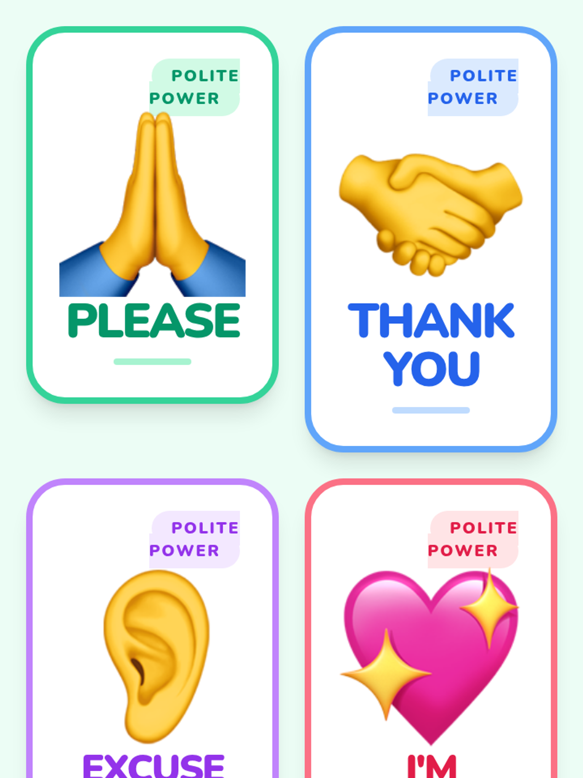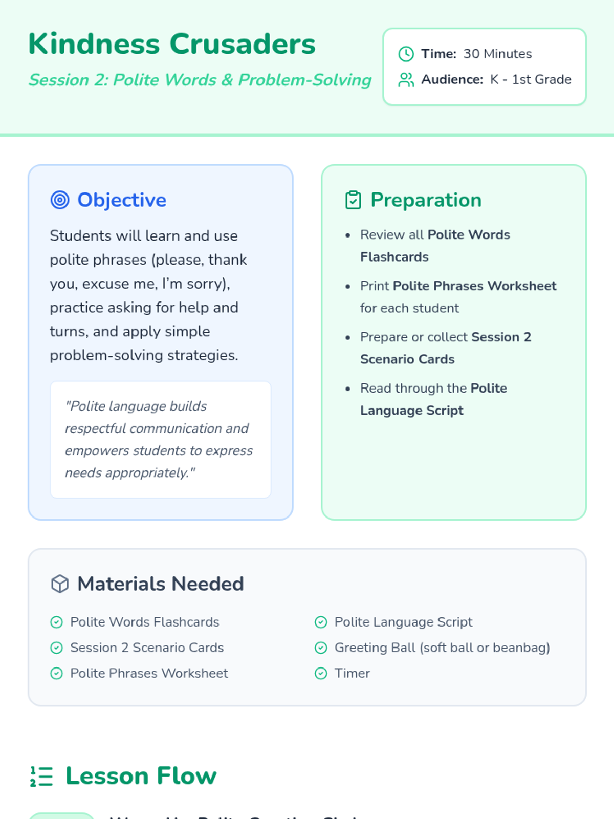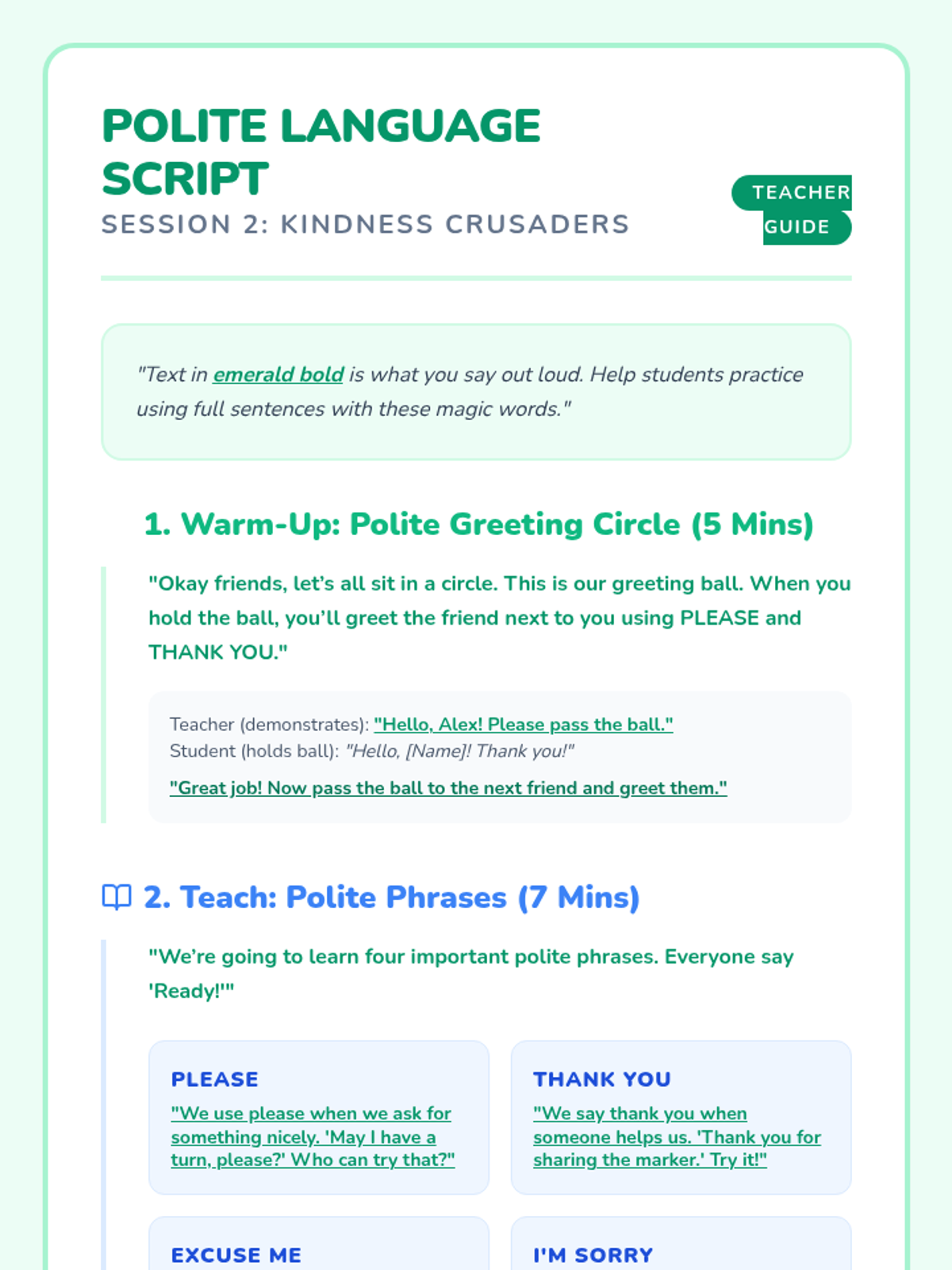 Students will learn and practice four polite phrases (please, thank you, excuse me, I'm sorry) and use role-play to solve common social problems.