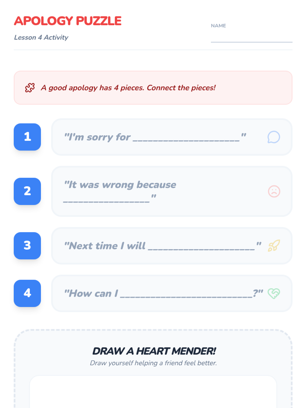 A comprehensive lesson designed to help students identify different types of bullying (physical, verbal, cyber) and develop empathy through scenario analysis and role-playing activities. Students will learn to recognize the impact of their actions and cultivate a culture of respect.