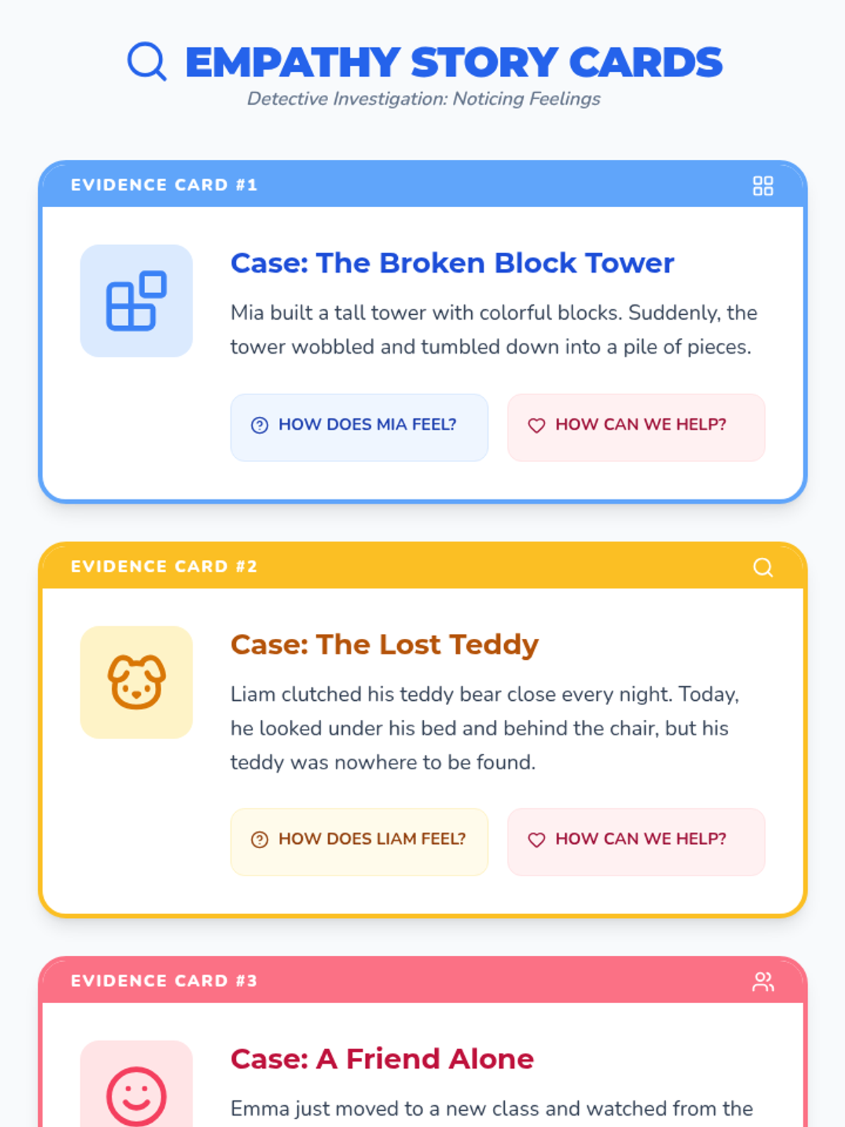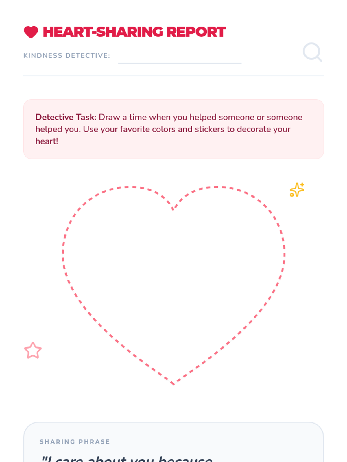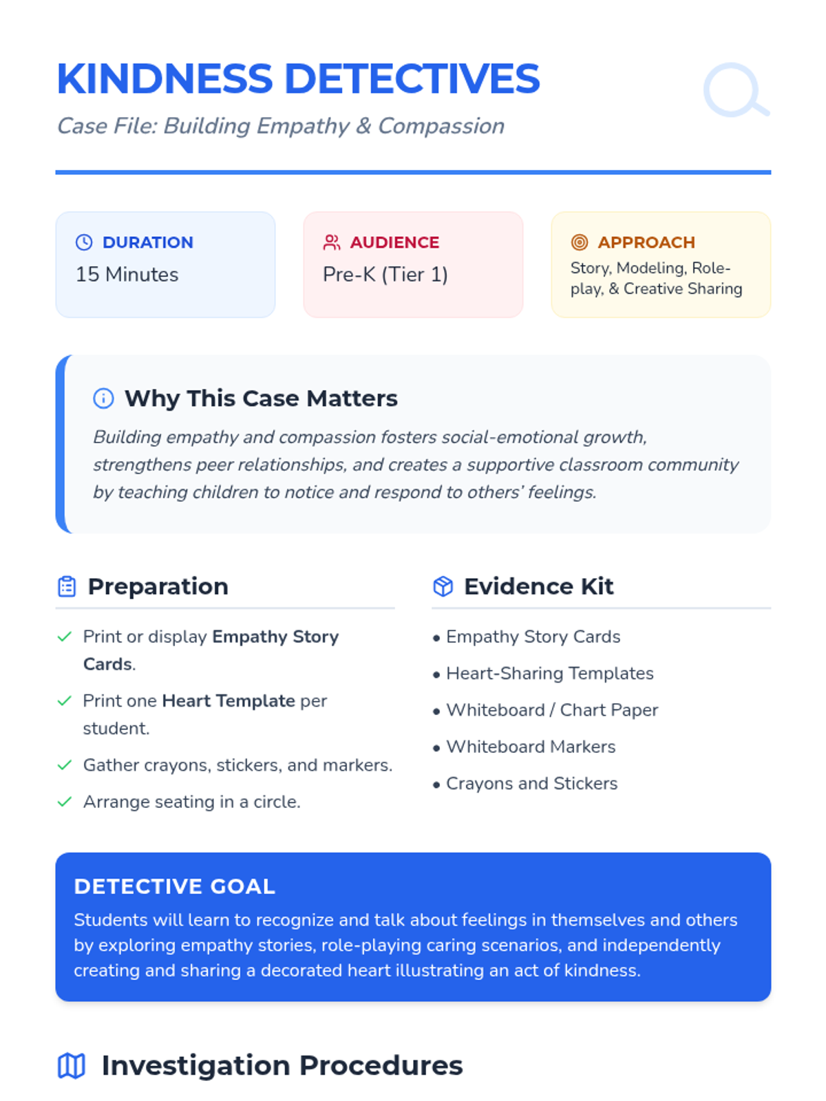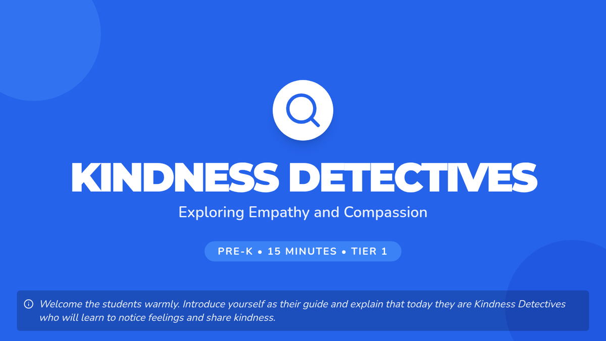 A 15-minute Pre-K lesson focusing on empathy and compassion through stories, role-play, and a creative heart-sharing activity. Students learn to recognize feelings and practice kindness as 'Kindness Detectives'.