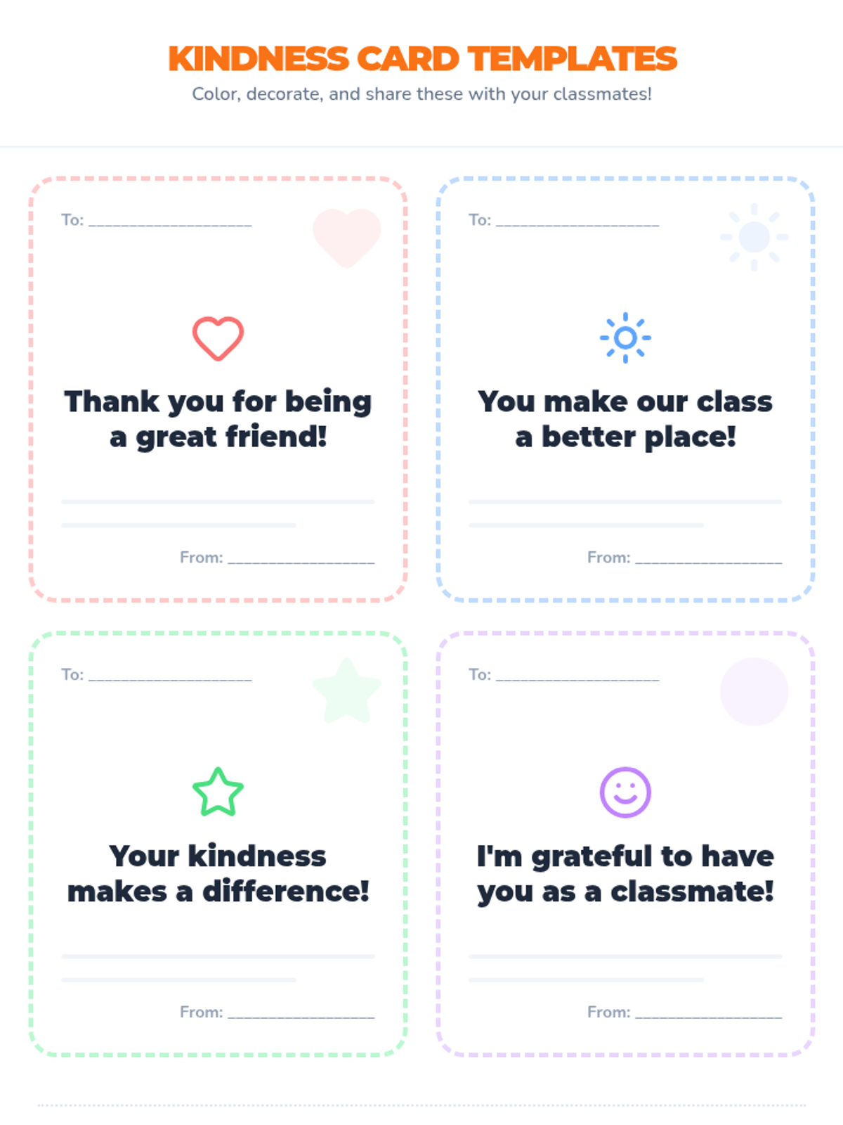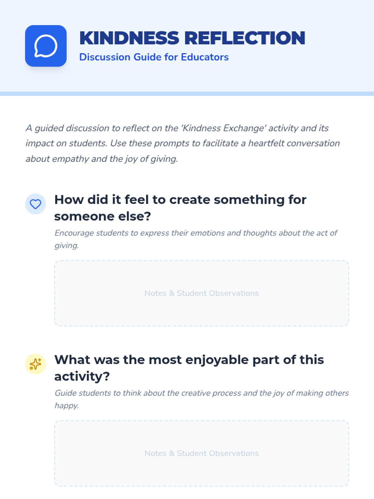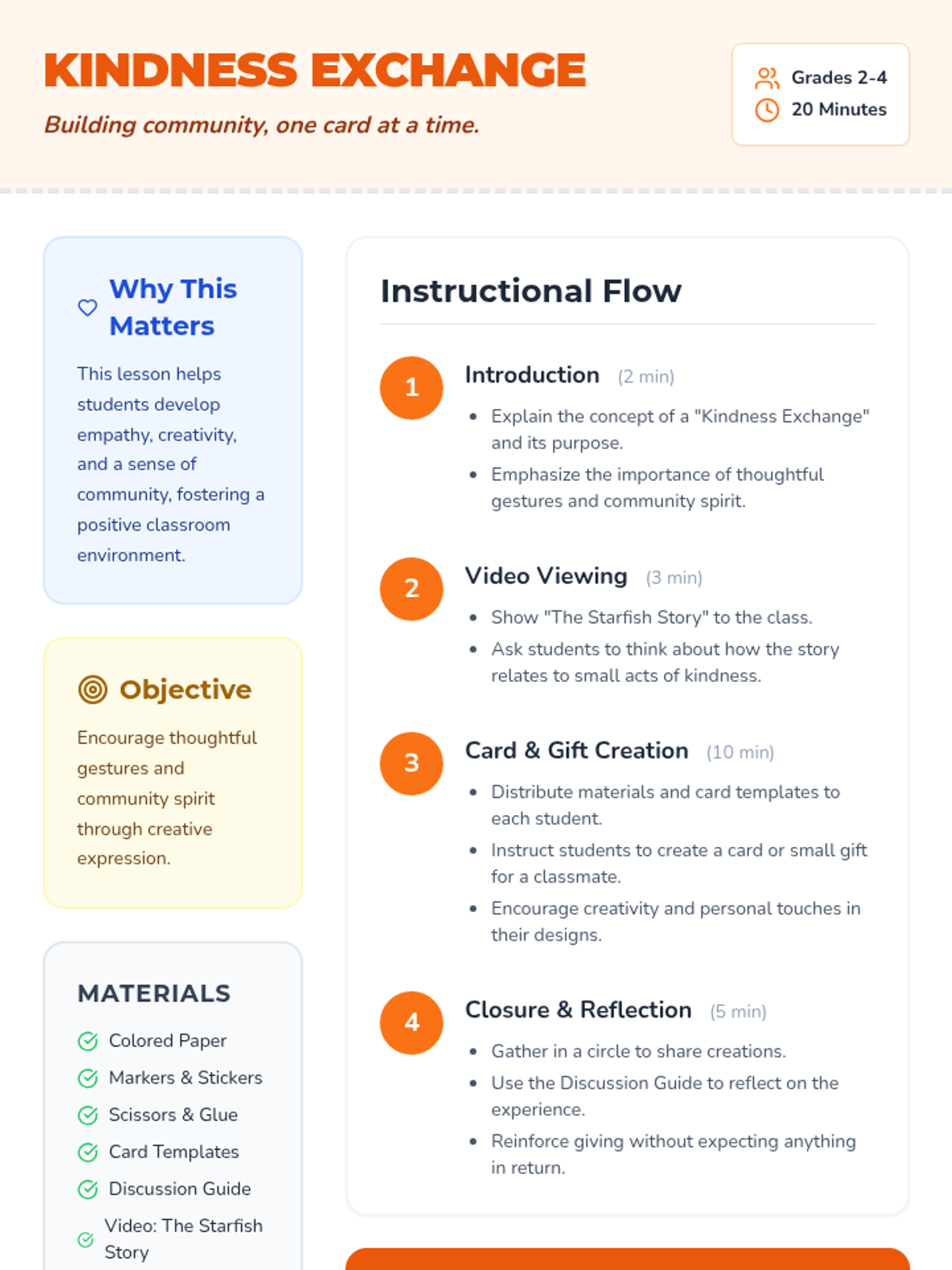 A heartfelt lesson where students create kindness cards and gifts for their peers, fostering empathy and community spirit through small, meaningful gestures.