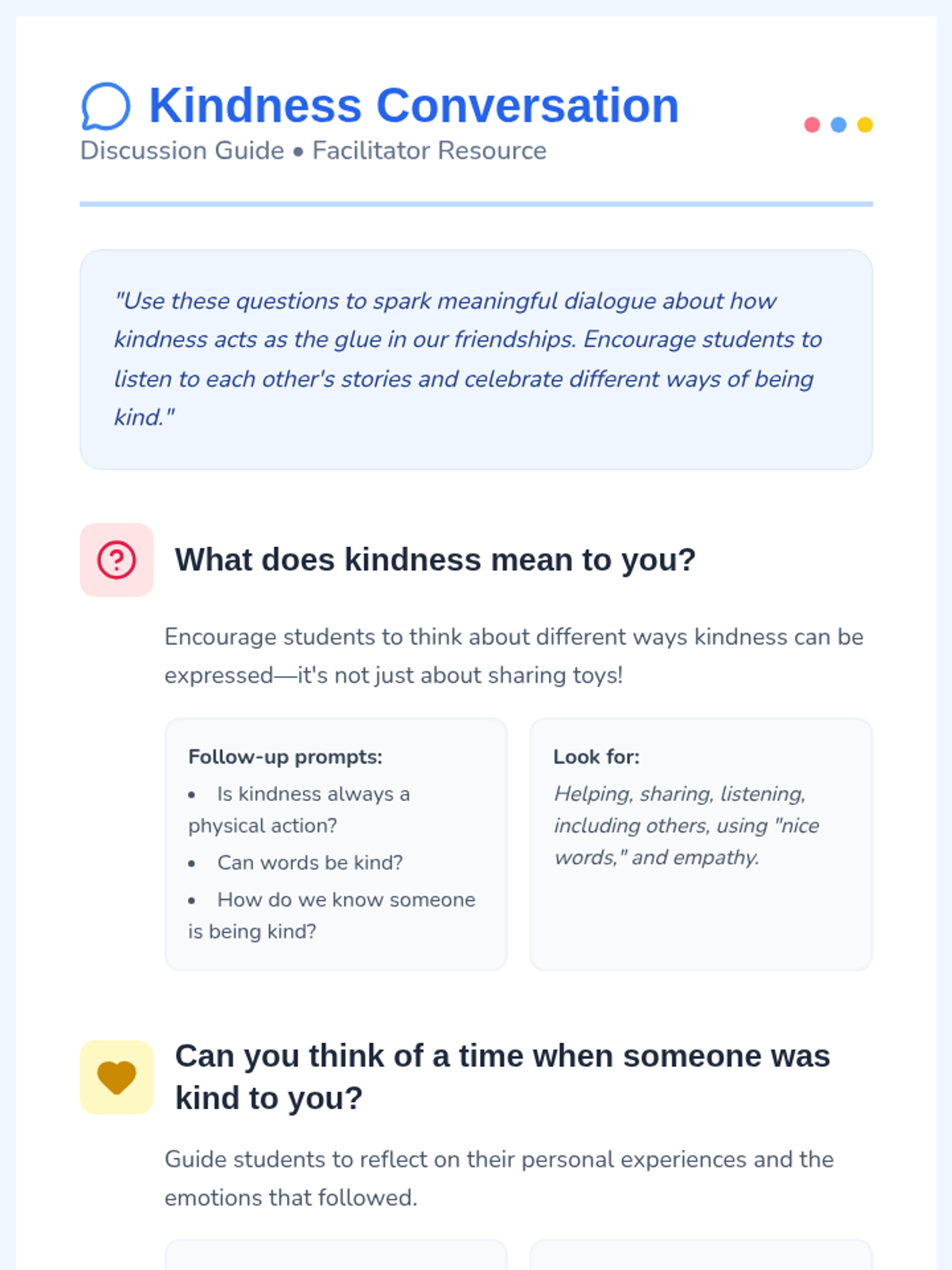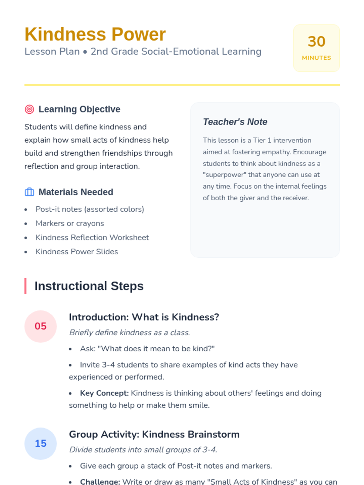 A Tier 1 classroom lesson for 2nd graders focused on exploring kindness and its impact on building strong friendships through reflection and group activities.