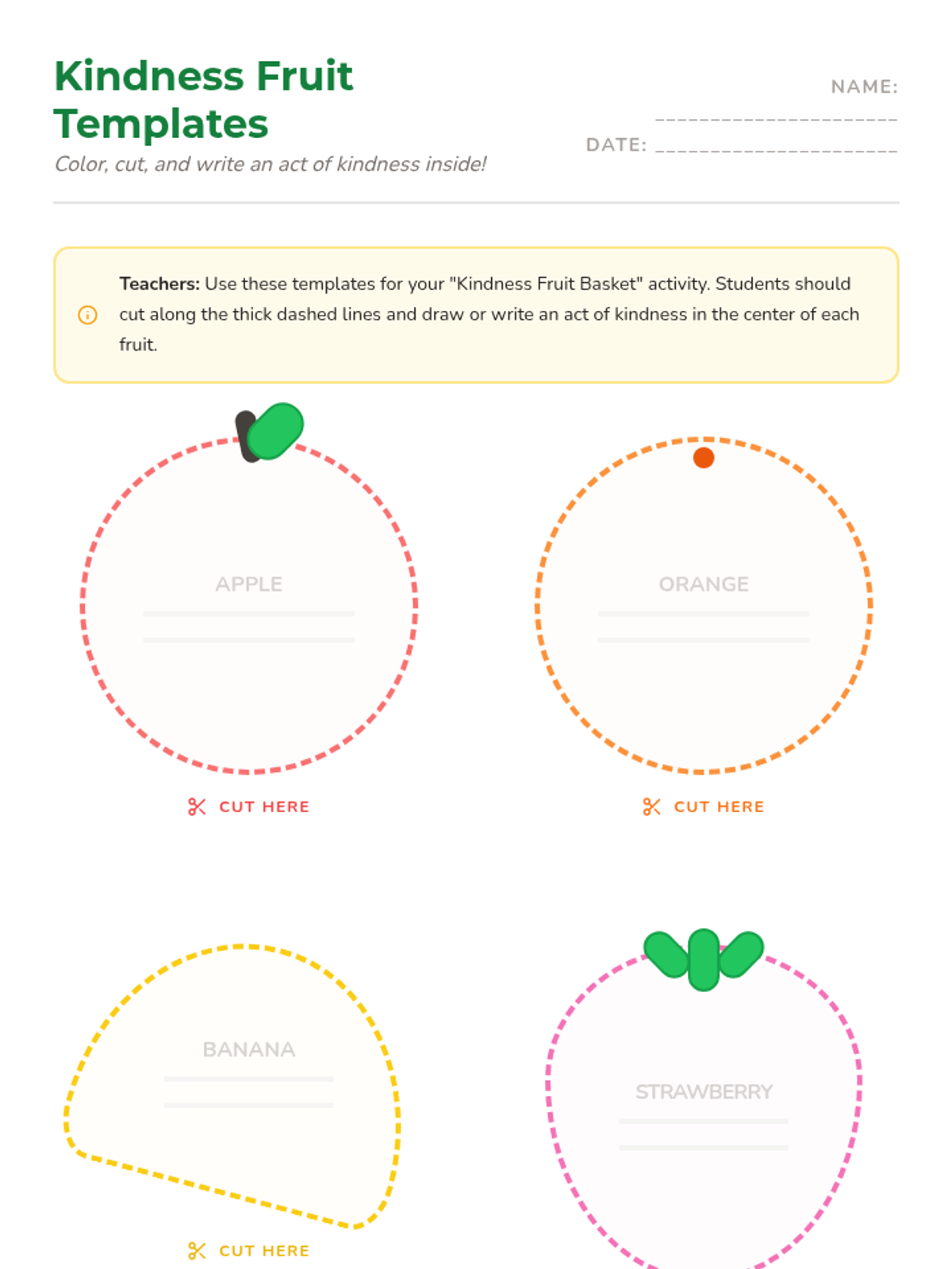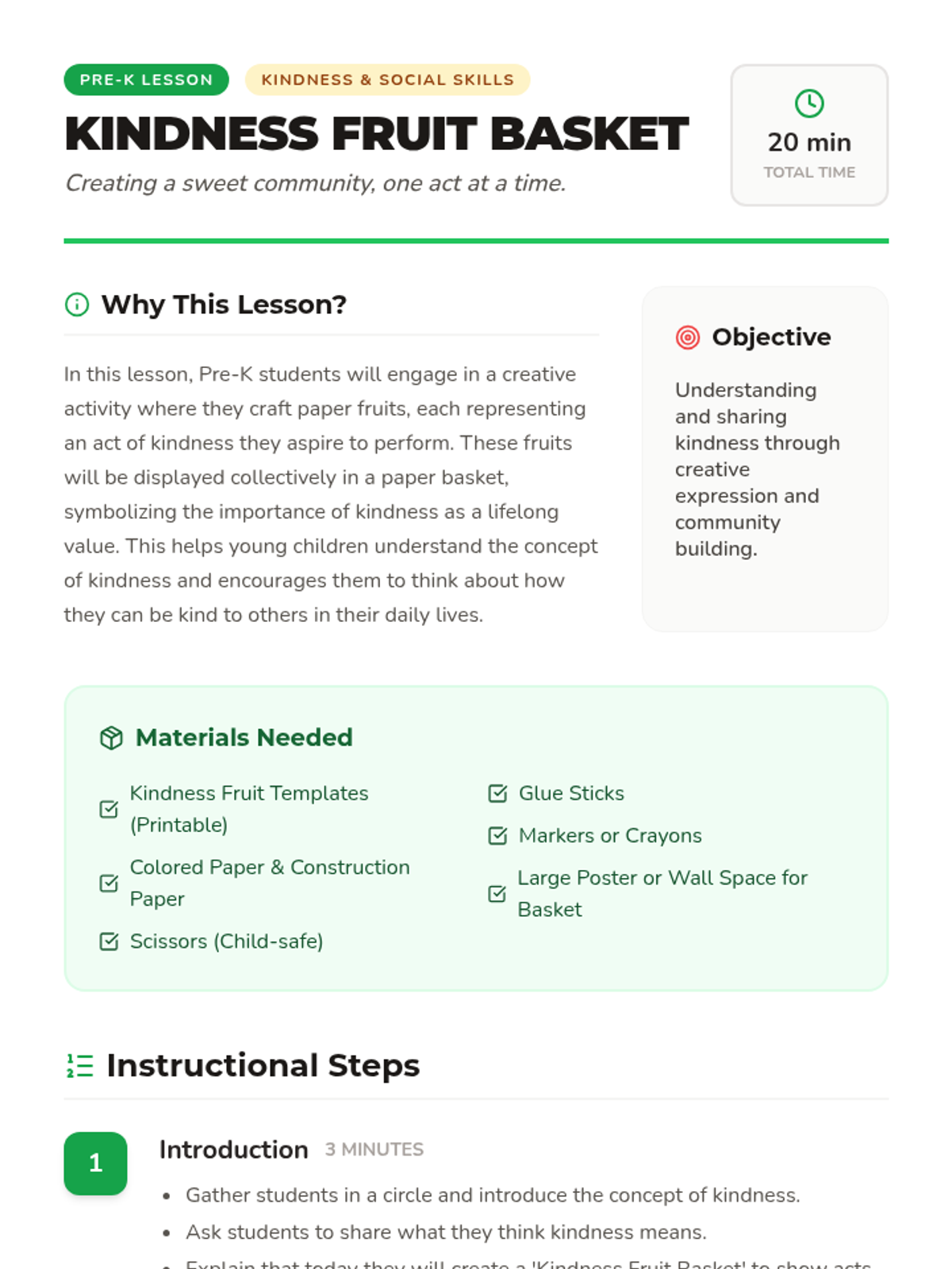 A creative Pre-K lesson where students craft paper fruits representing acts of kindness to build a collective 'Kindness Fruit Basket'.