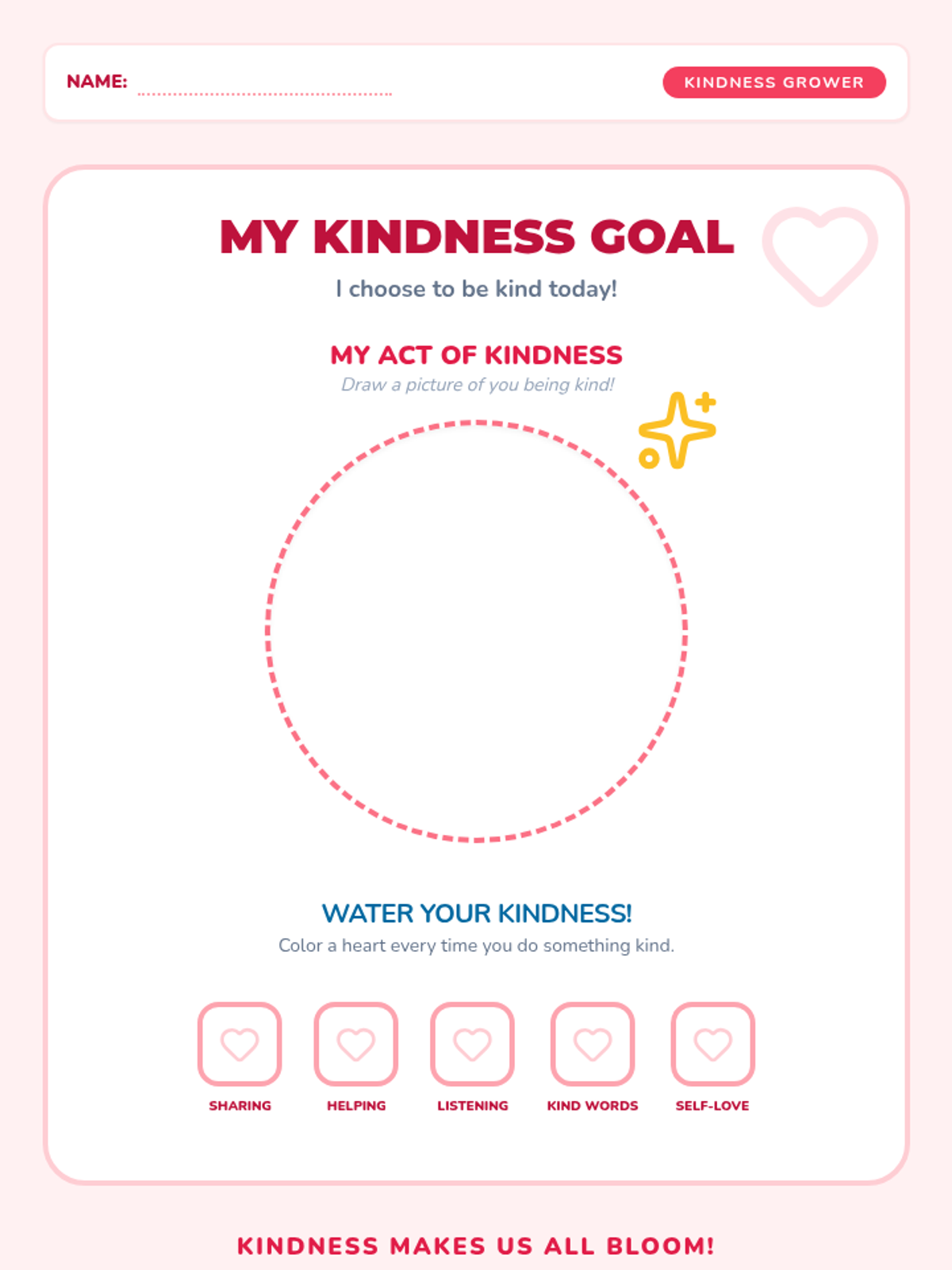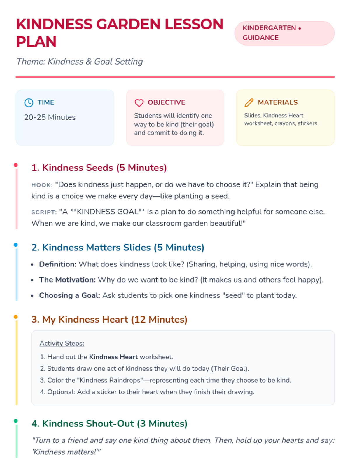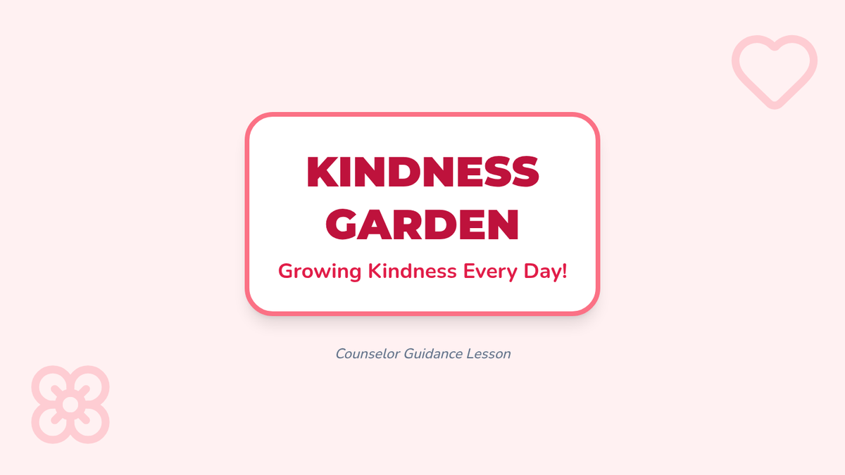 A kindergarten classroom guidance lesson focused on kindness and goal setting through the metaphor of growing a kindness garden. Students learn that kindness is a choice and they can set goals to be "Kindness Growers."