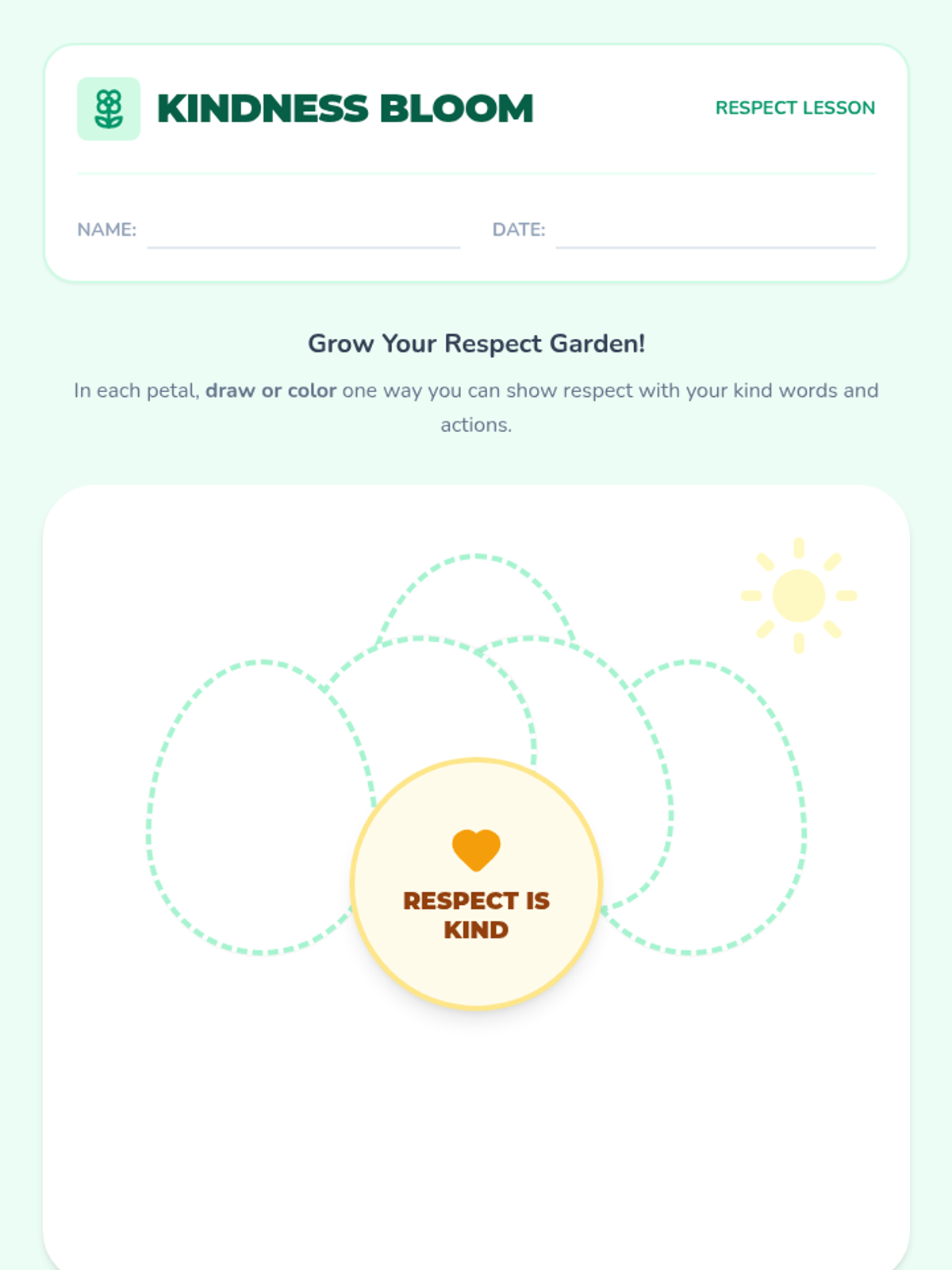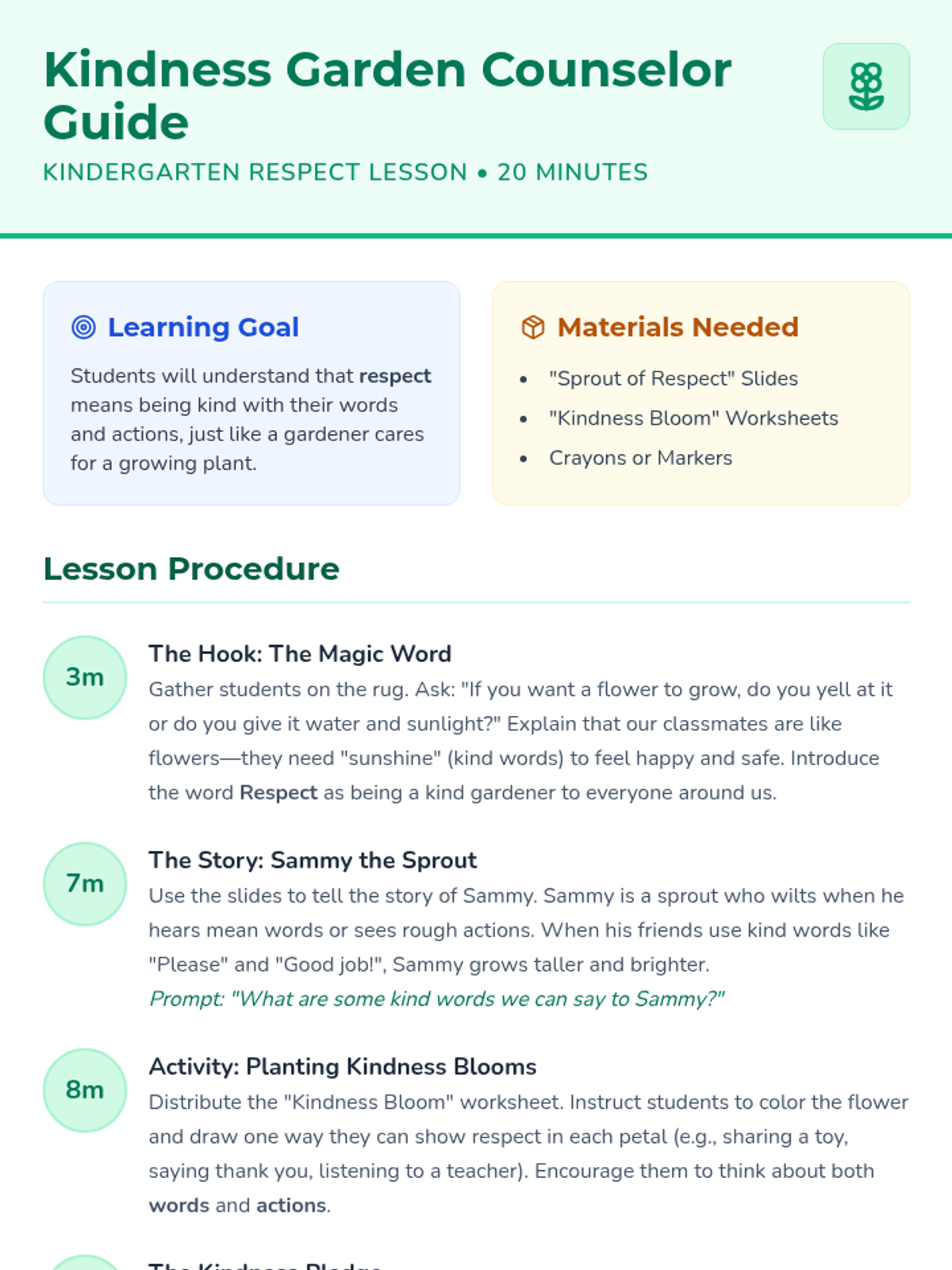 A 20-minute school counselor lesson for Kindergarten focused on respect through kind words and actions, using a 'Kindness Garden' theme.