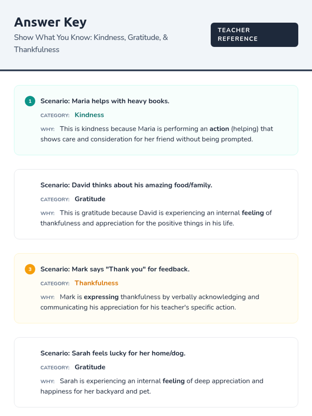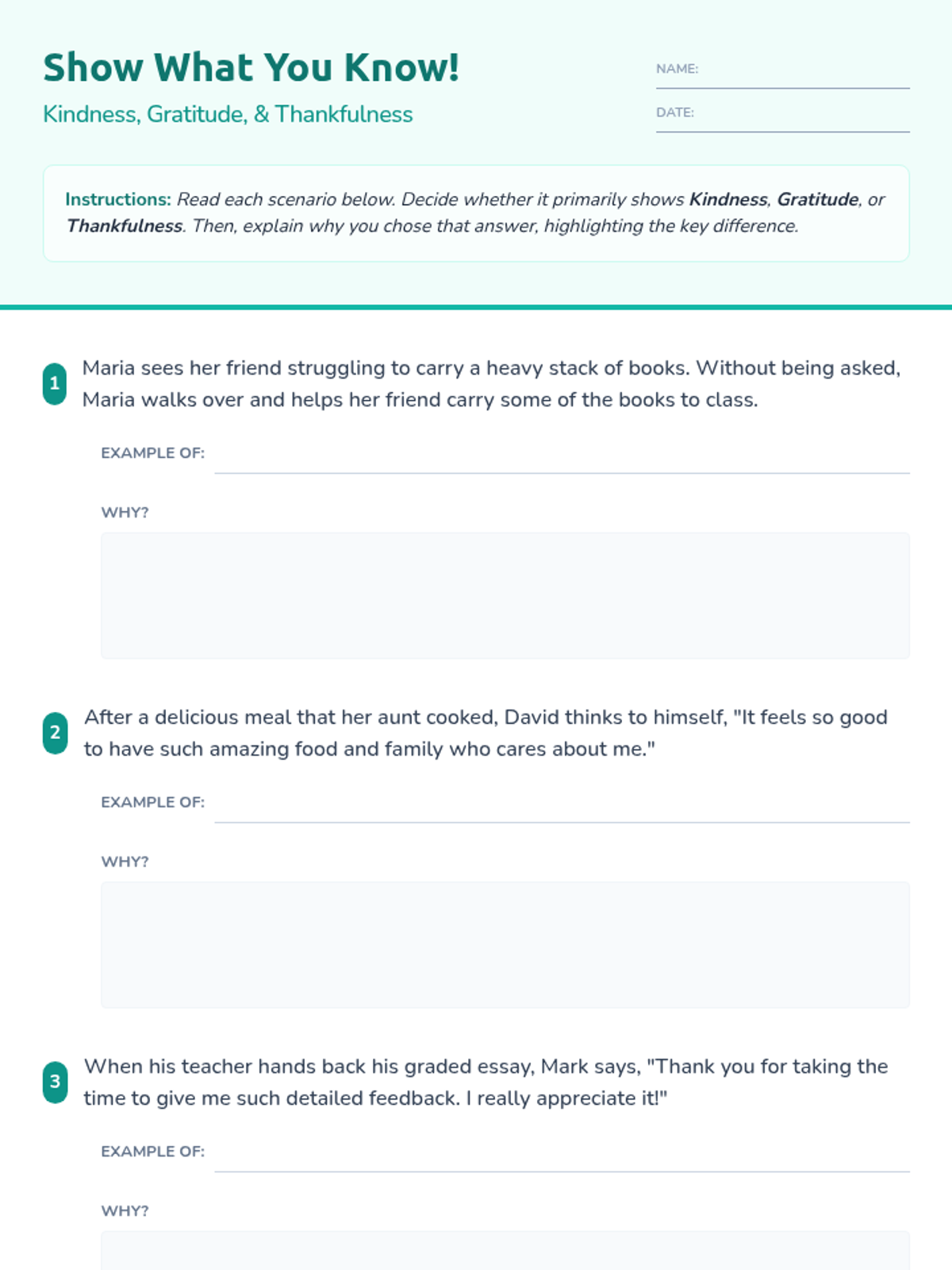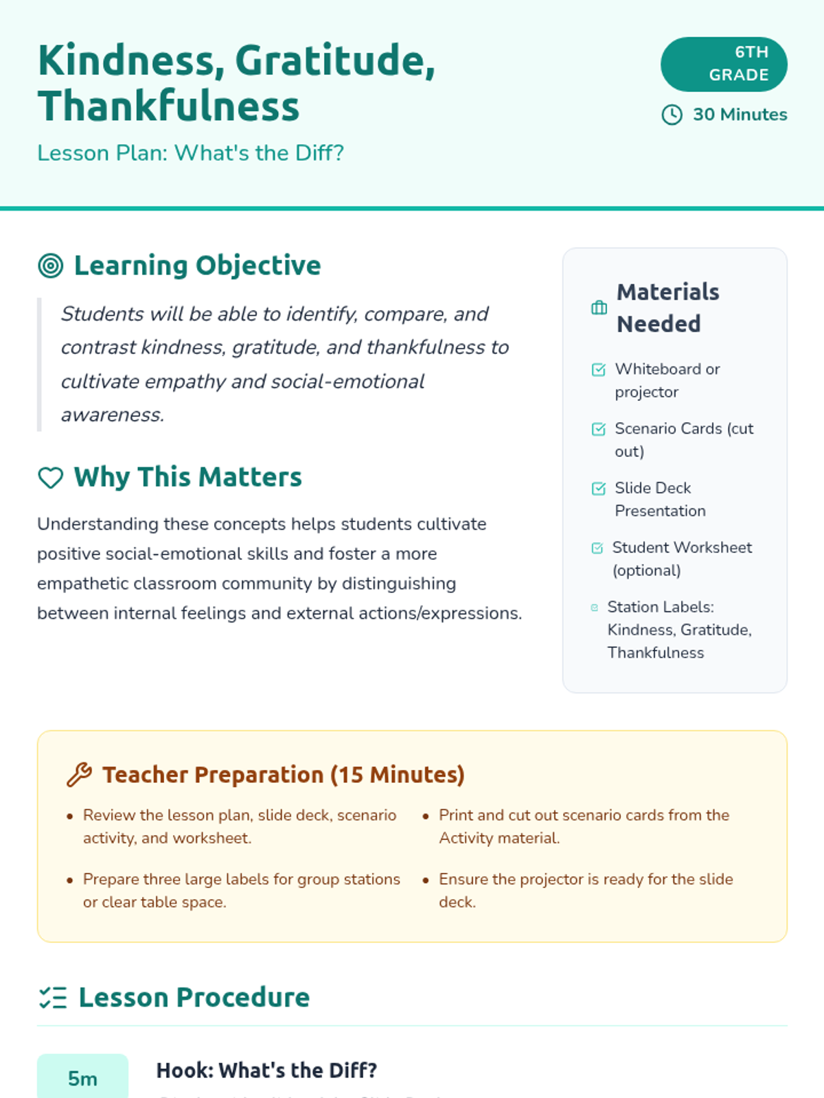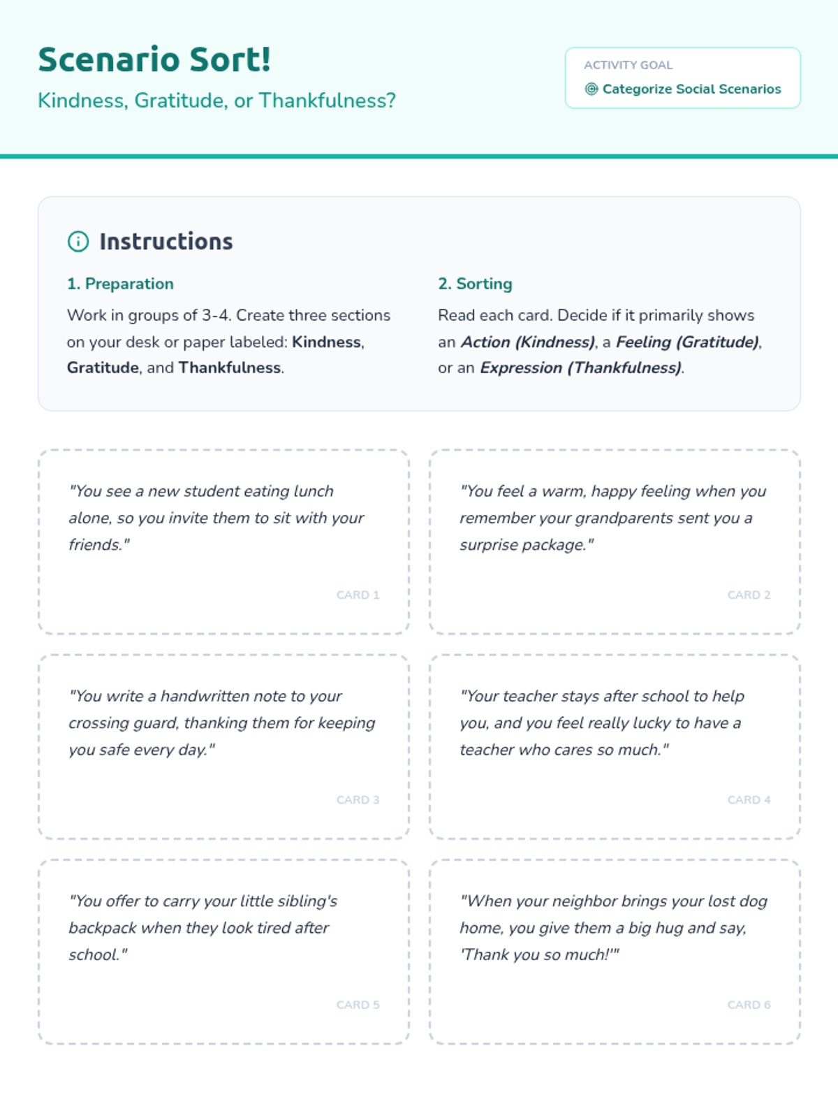 This 30-minute lesson for 6th-grade students helps them identify, compare, and contrast kindness, gratitude, and thankfulness. Through direct instruction and a hands-on sorting activity, students cultivate social-emotional skills and empathy.