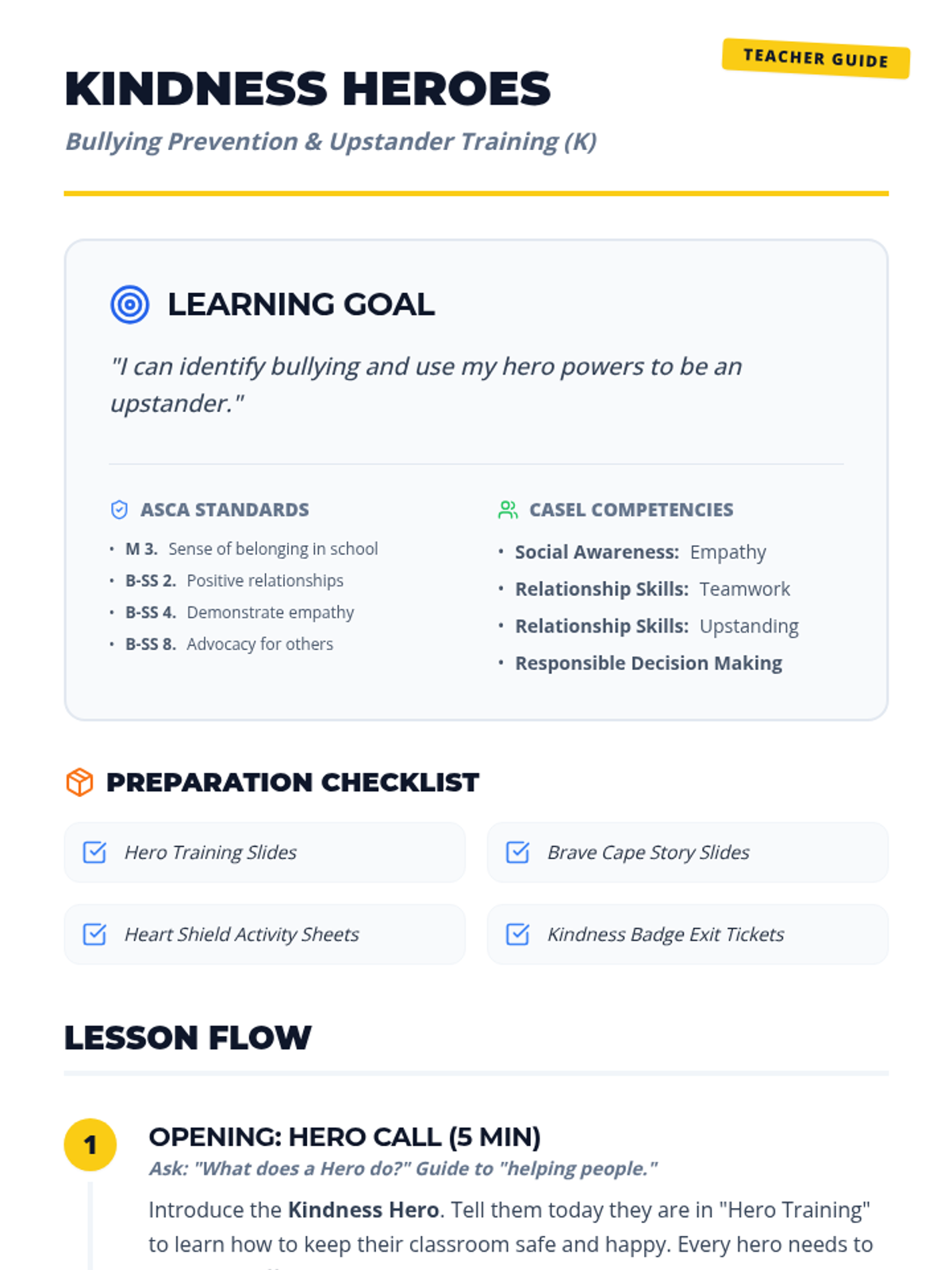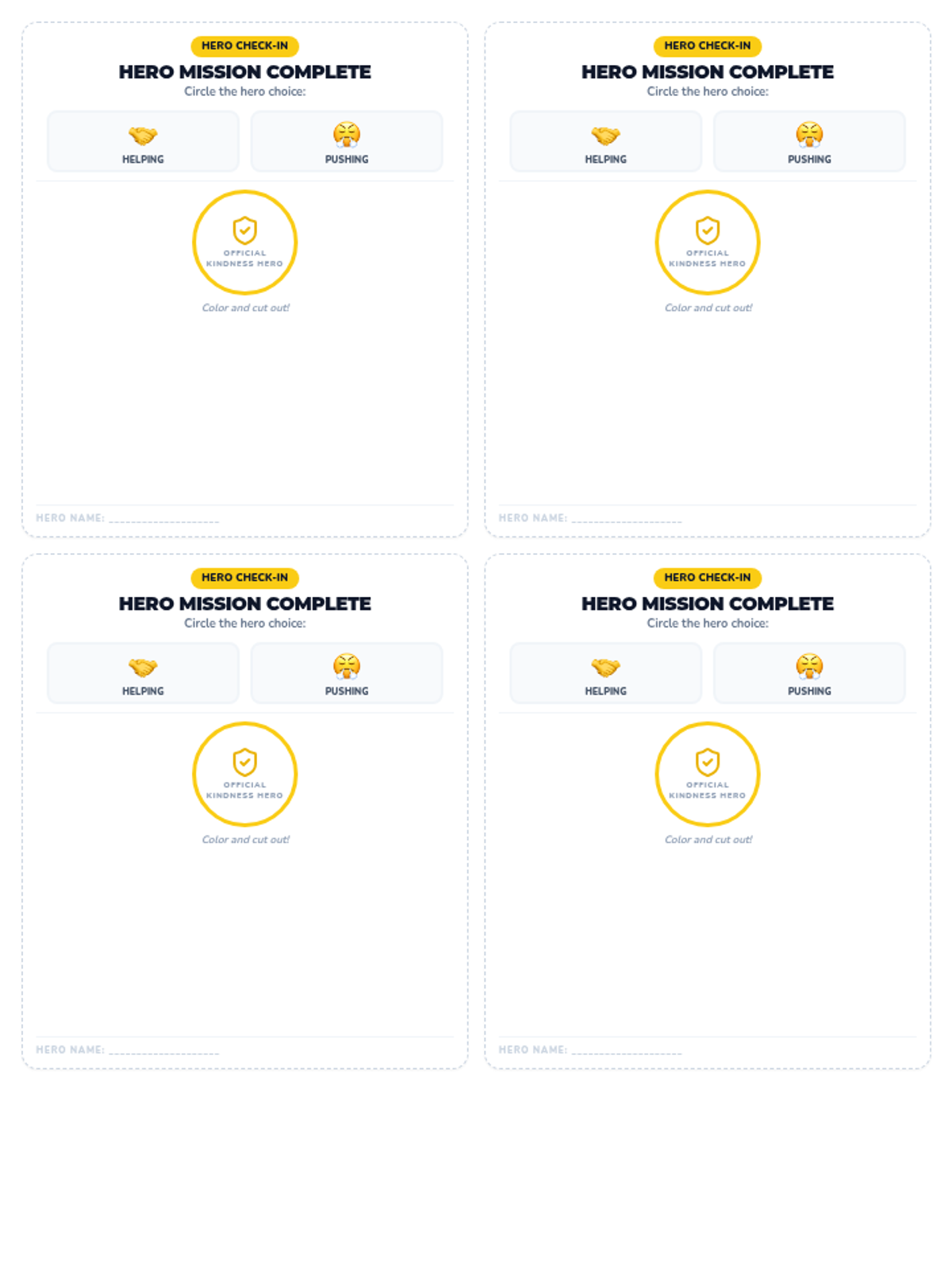 This lesson introduces kindergarteners to the concept of bullying through a 'Kindness Hero' lens. Students will learn to identify hurtful behaviors (physical and verbal) and practice being 'Upstanders' who help their friends.