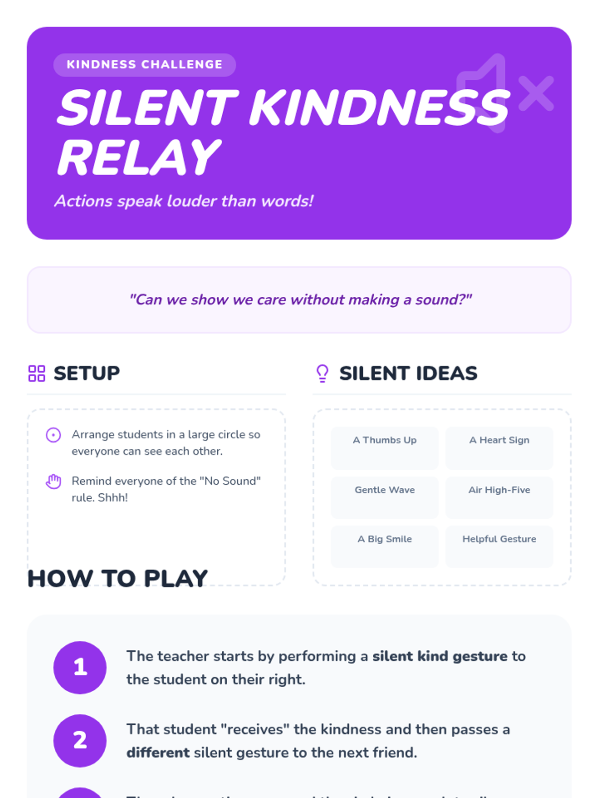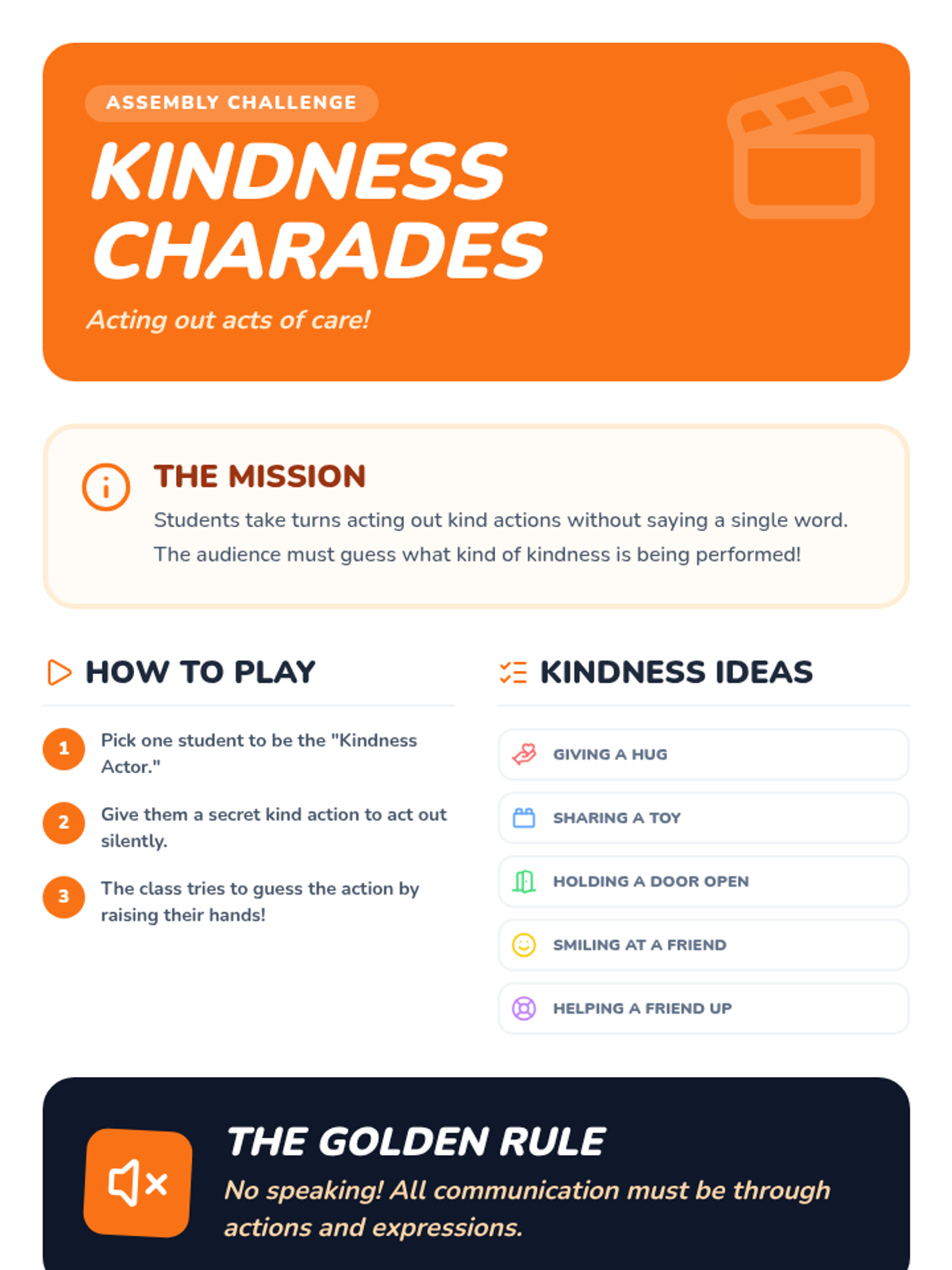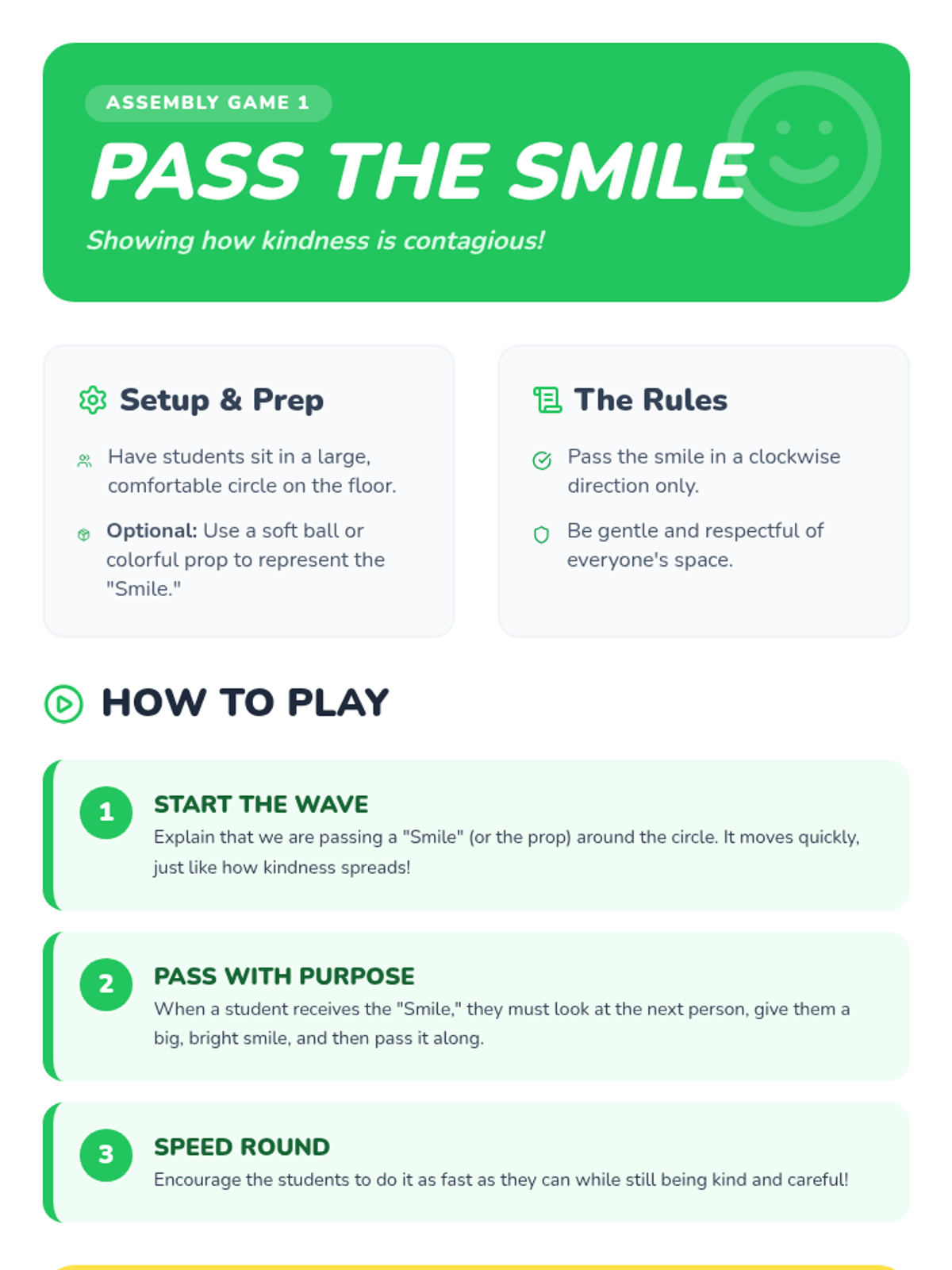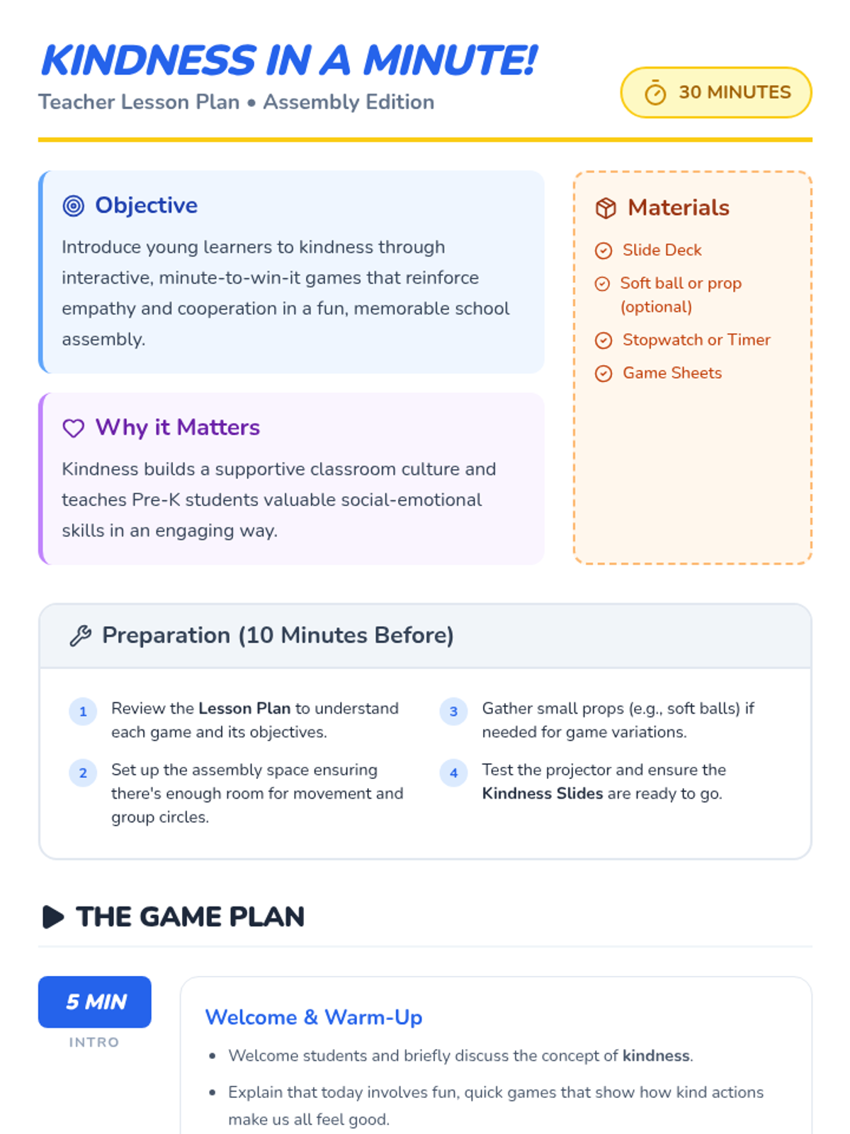 A high-energy Pre-K school assembly lesson that uses quick, fun games to teach the power of kindness and cooperation. Students engage in 'Minute to Win It' style challenges that reinforce empathy through smiles, compliments, and helpful actions.