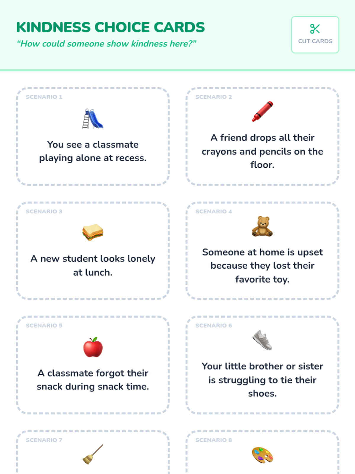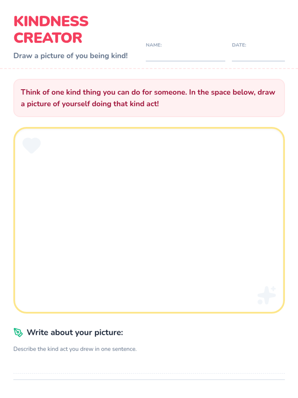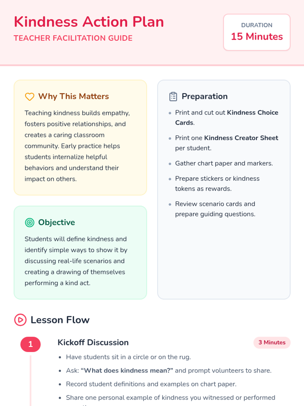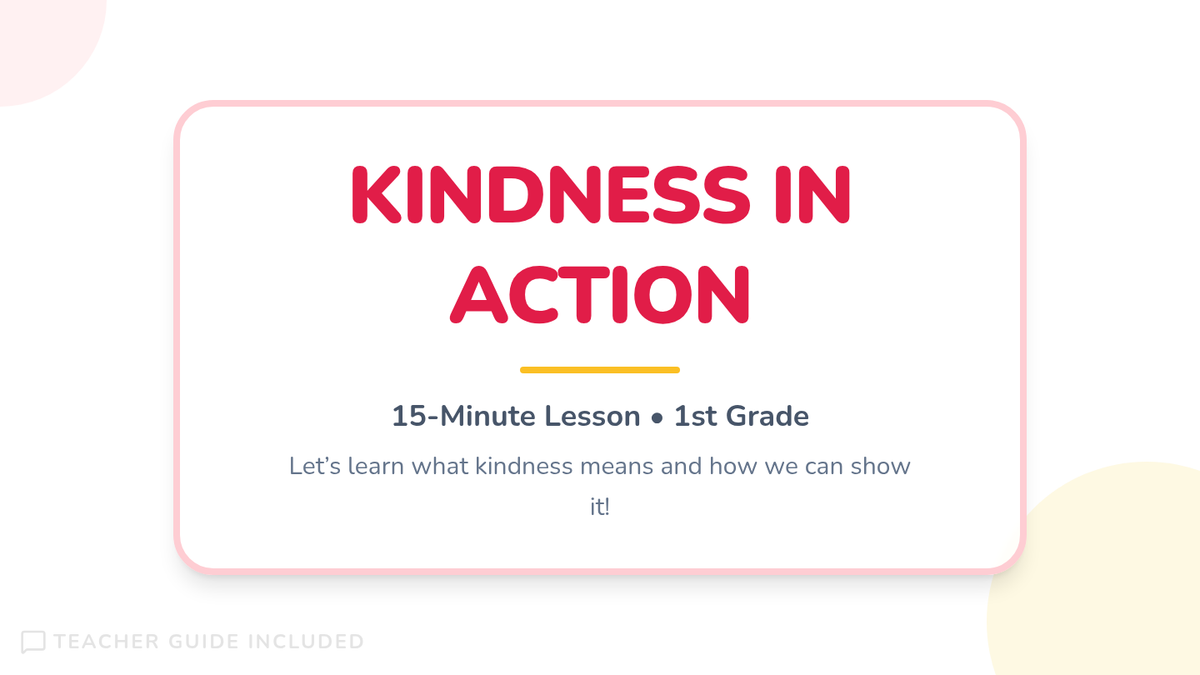 In this 15-minute, one-session lesson, first graders will explore what kindness means and how to show it in their classroom and at home. Students will discuss scenarios, identify kind actions, and create a personal kindness drawing to build empathy and a caring community.