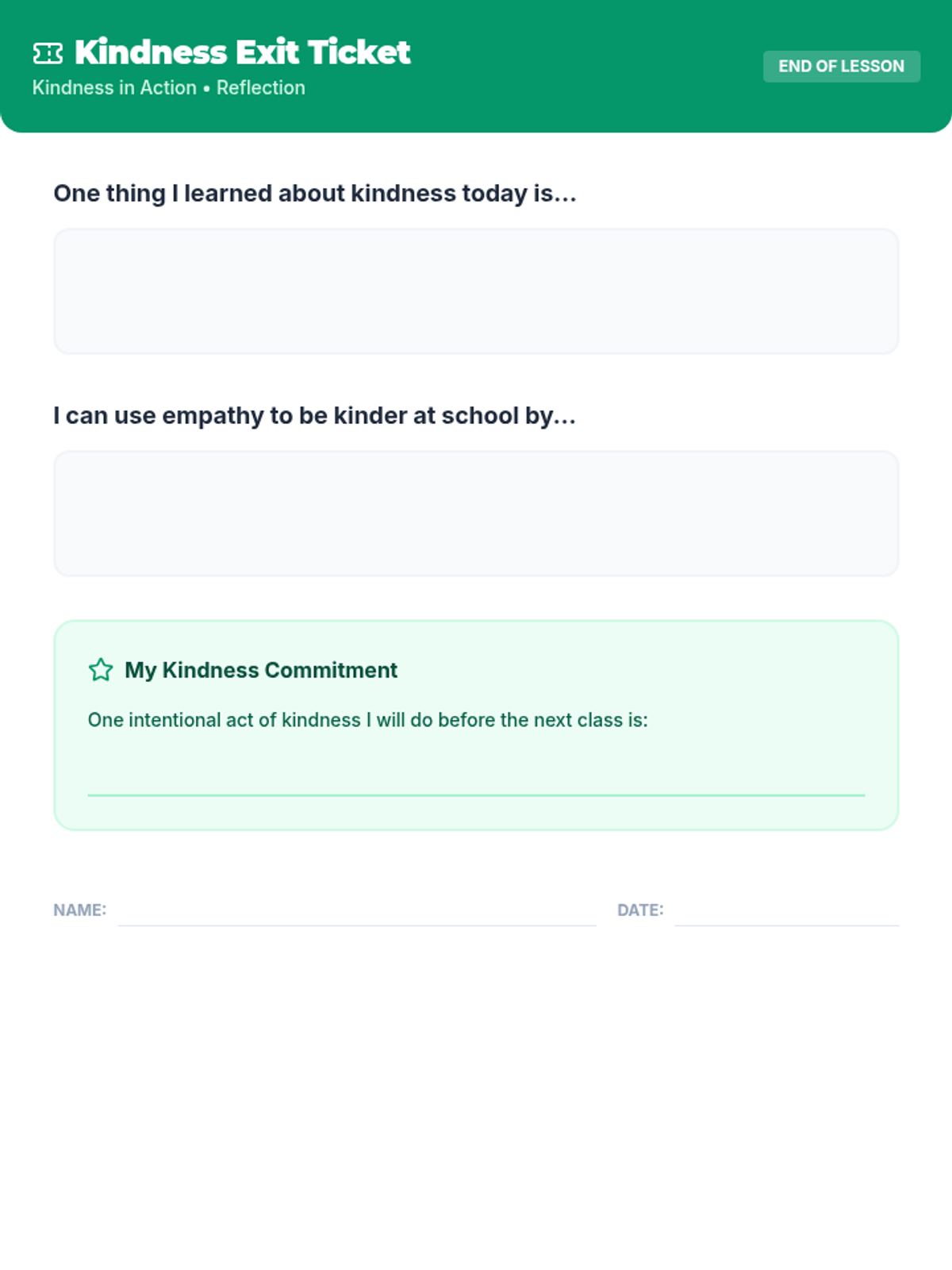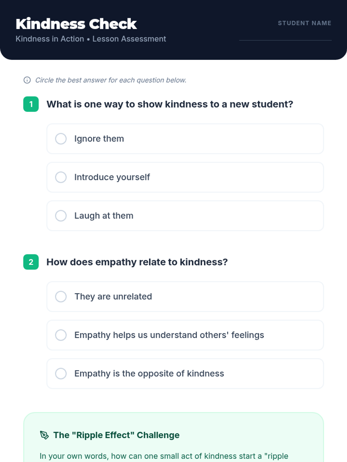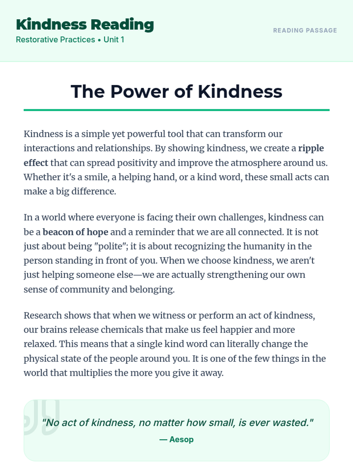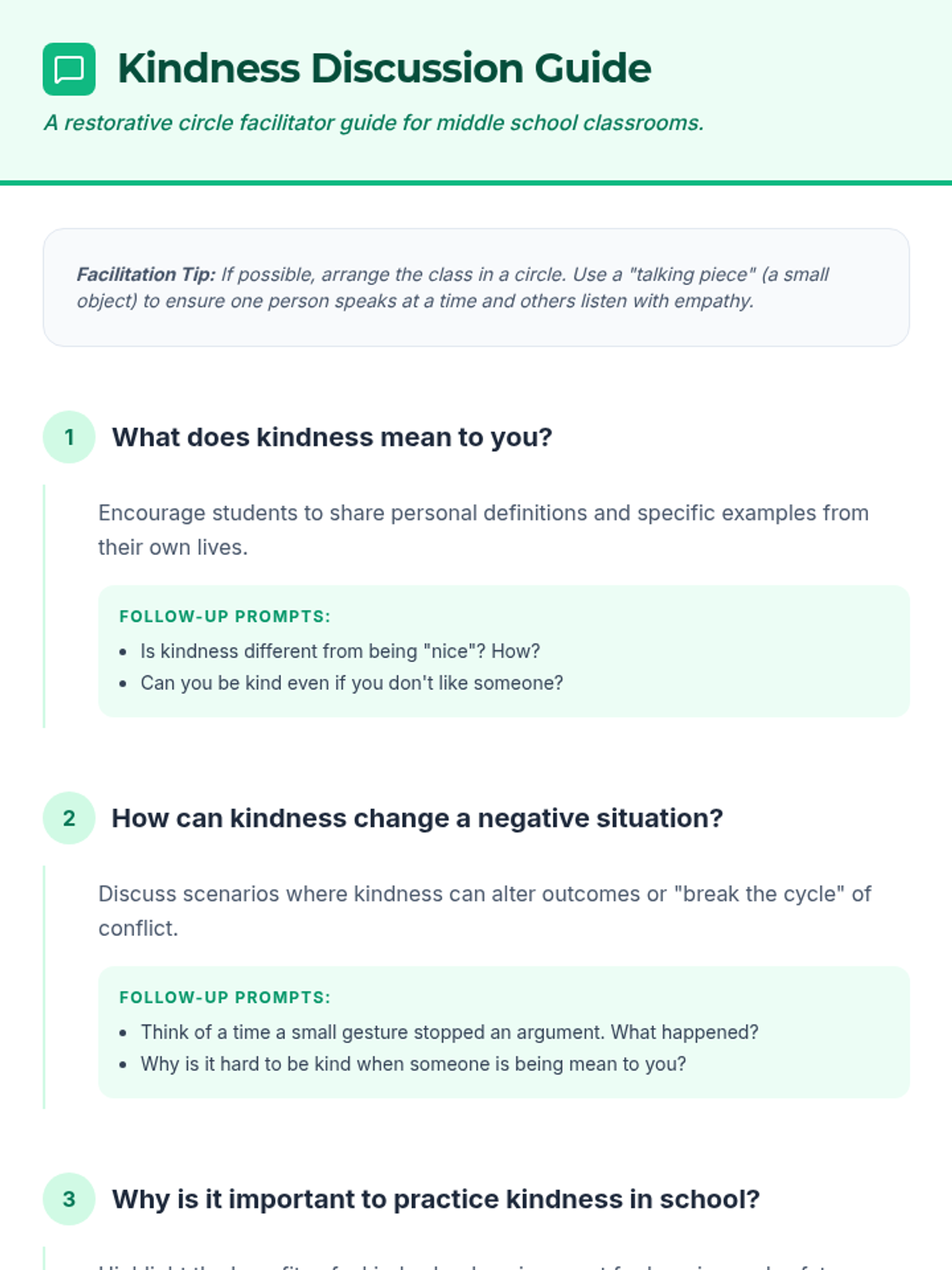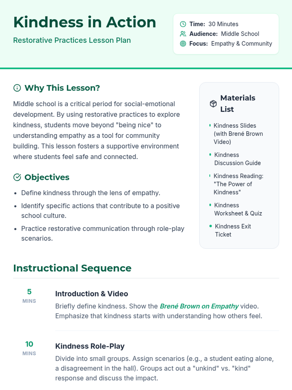 A restorative practices lesson for middle schoolers that explores empathy and kindness through role-play, discussion, and reflection. Students learn how small acts of kindness create a positive school community.