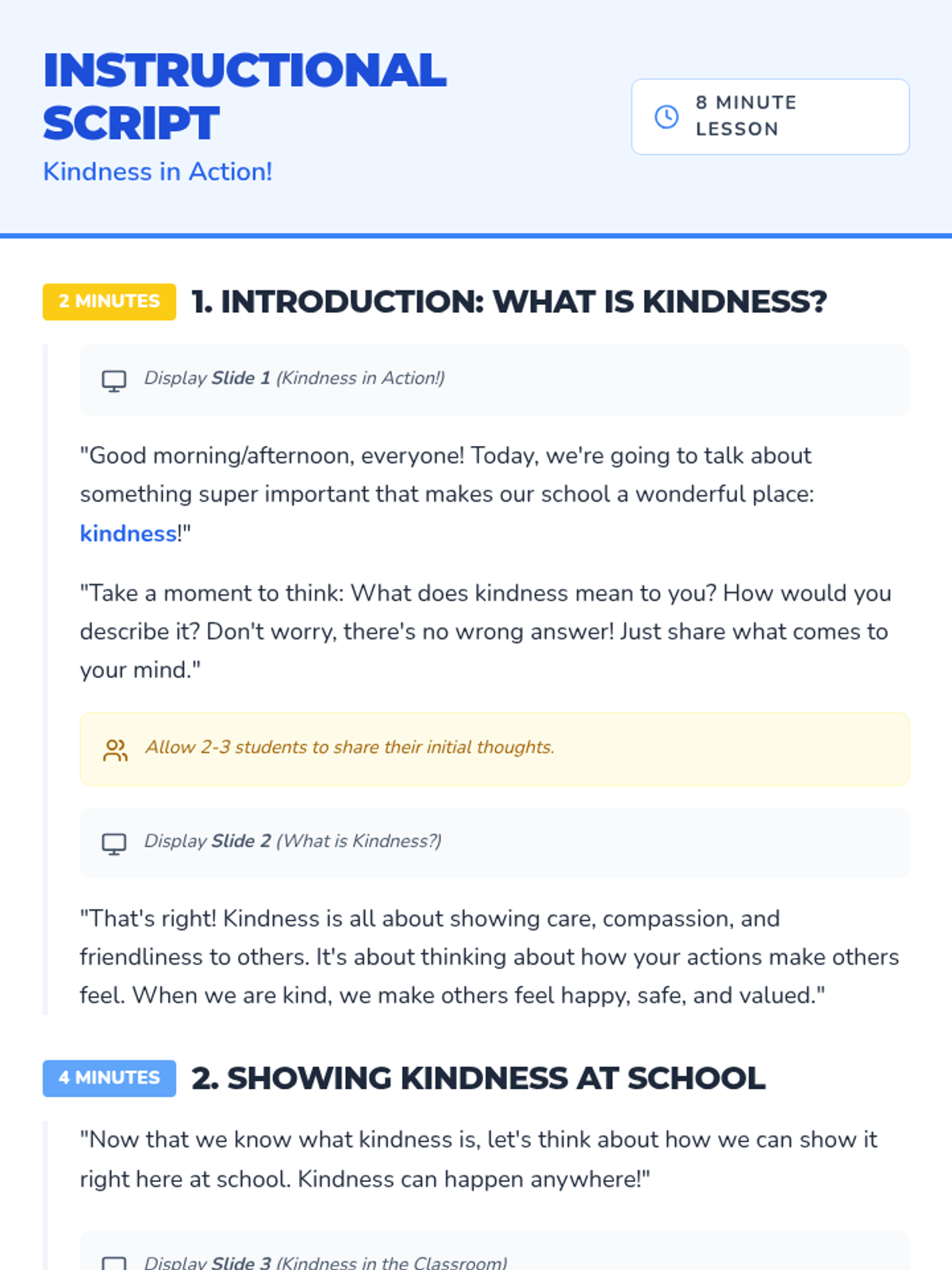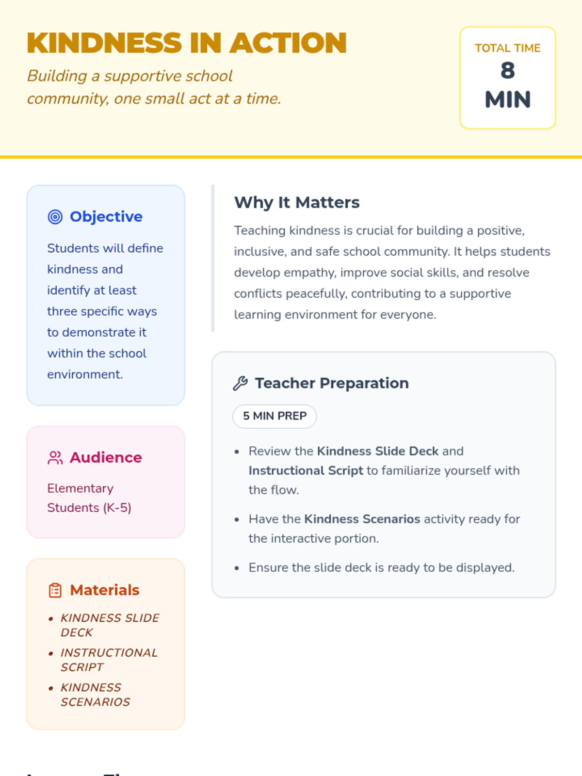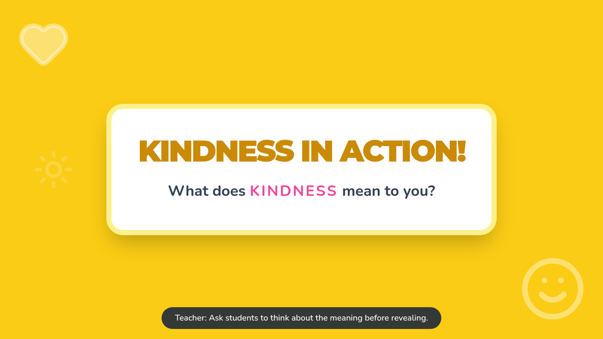 A quick, 8-minute interactive lesson for elementary students exploring the definition of kindness and practical ways to show care for others in the school environment.