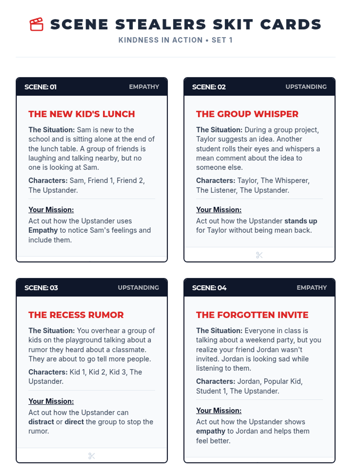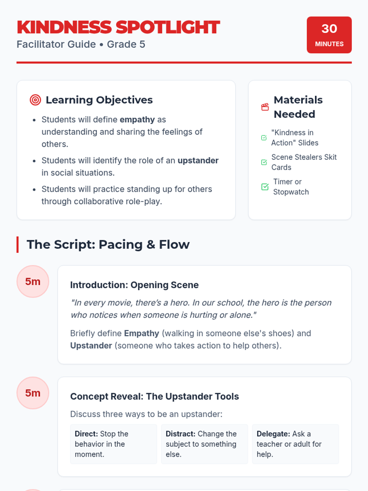 A 30-minute guidance lesson for 5th graders focused on kindness, empathy, and being an upstander through interactive role-play and small group skits.
