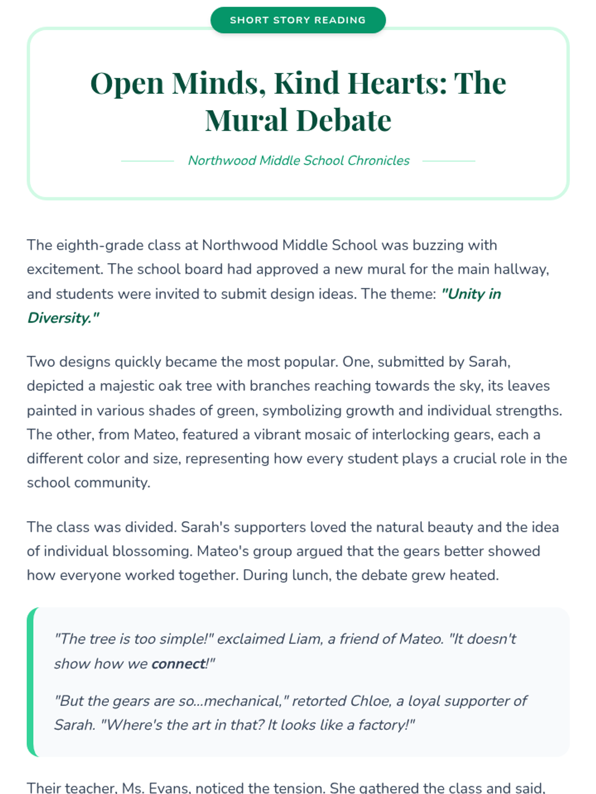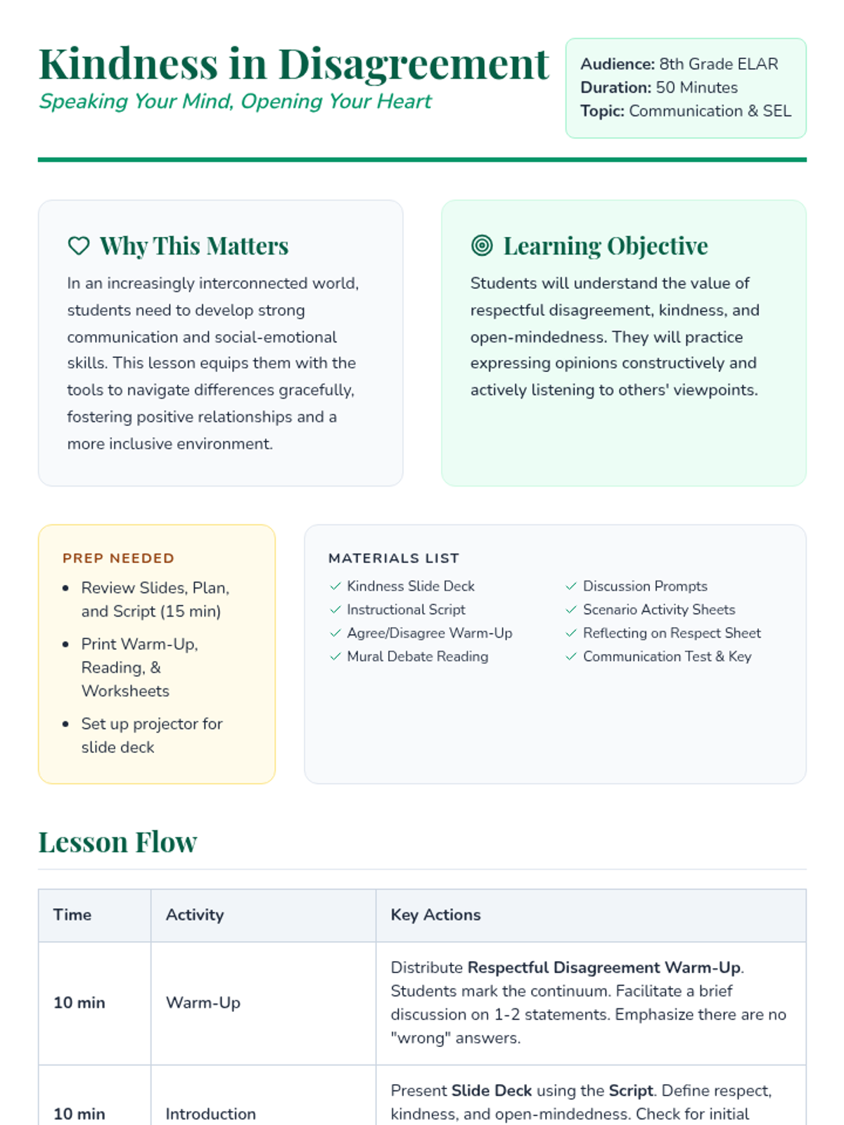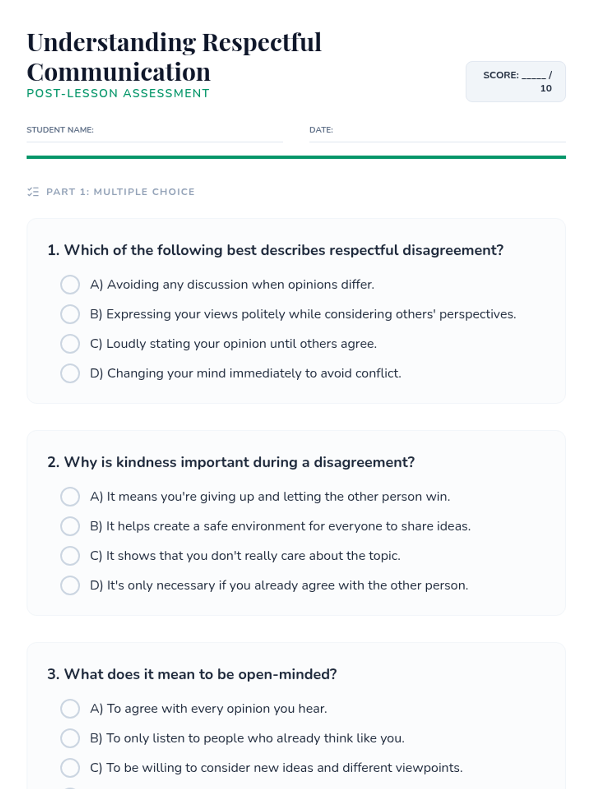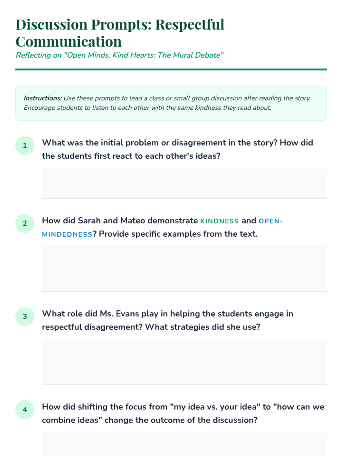 This lesson explores the essential life skills of respectful disagreement, kindness, and open-mindedness through the story of a school mural debate. Students will learn to engage in constructive discussions and appreciate diverse perspectives while practicing effective communication.