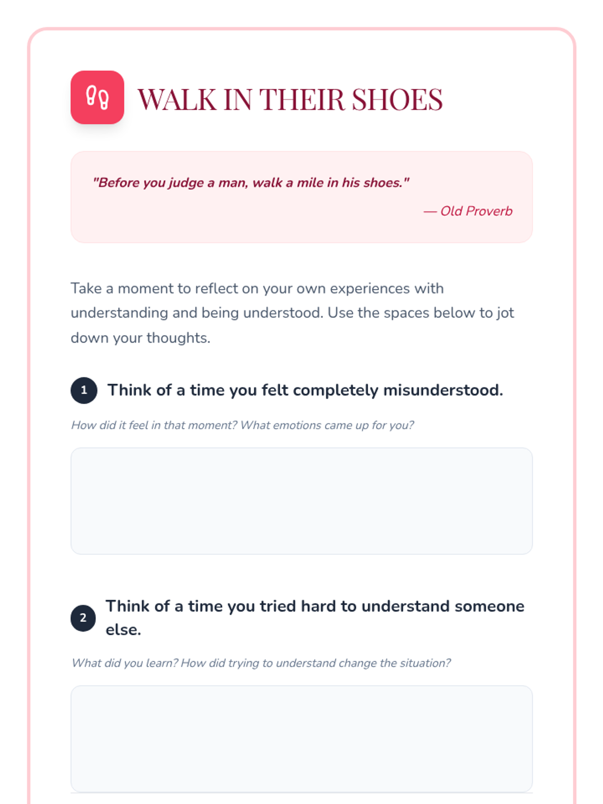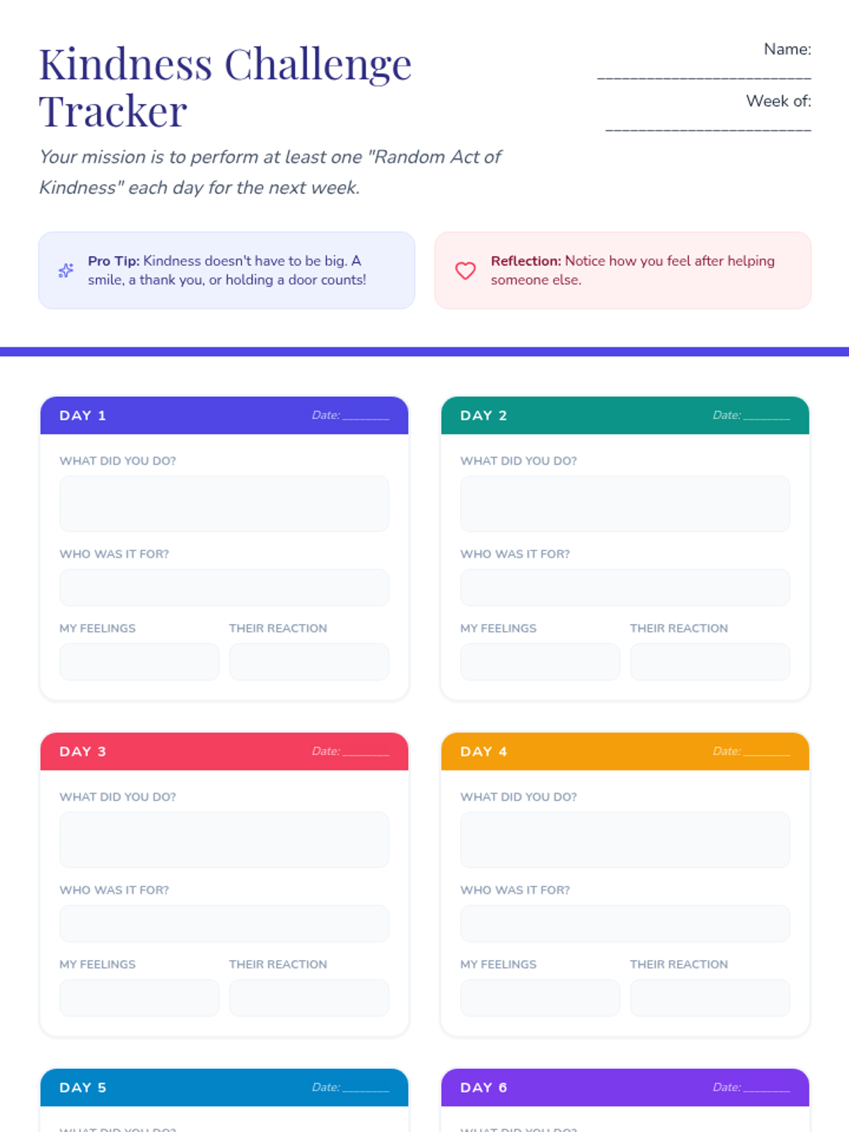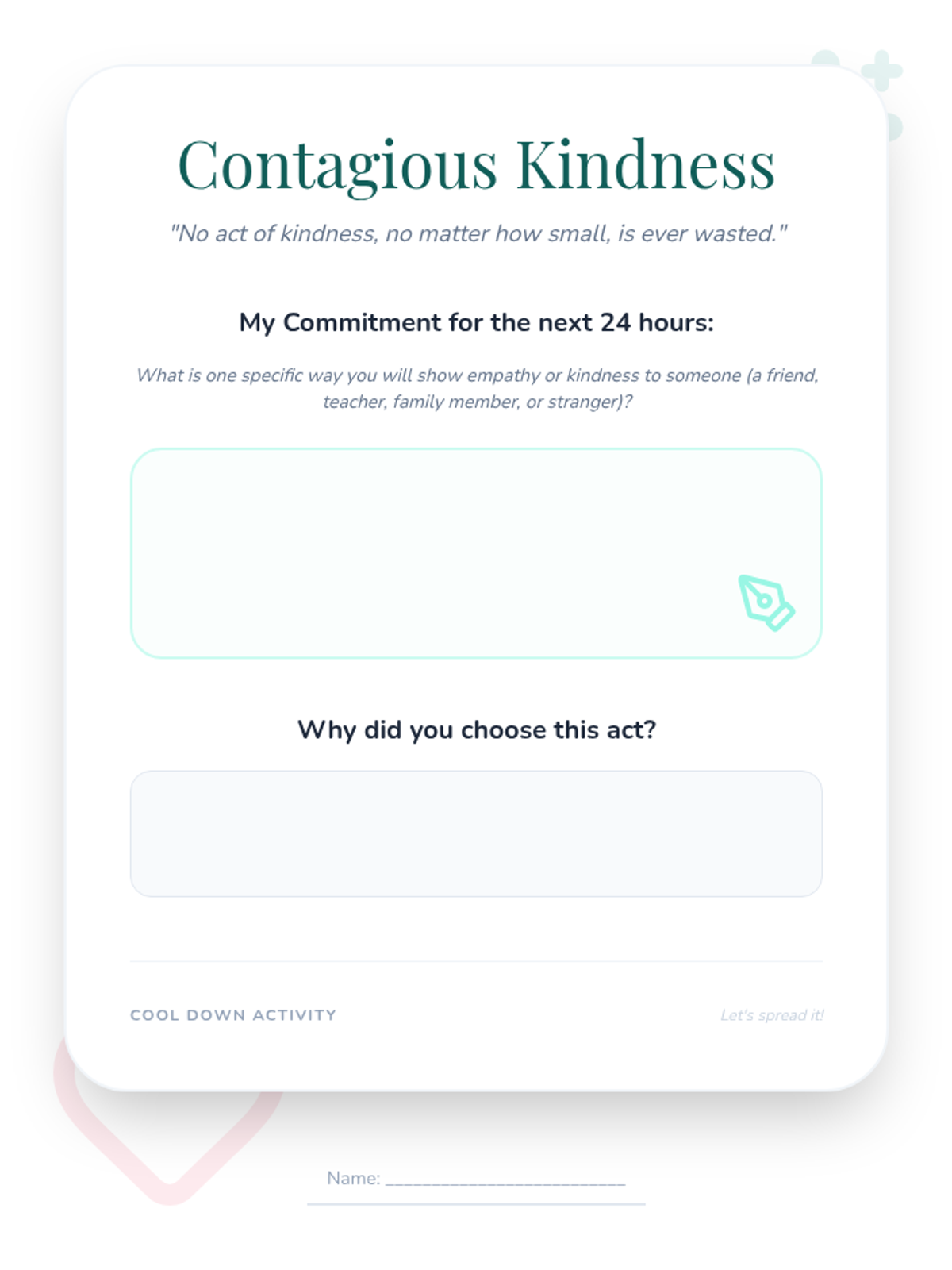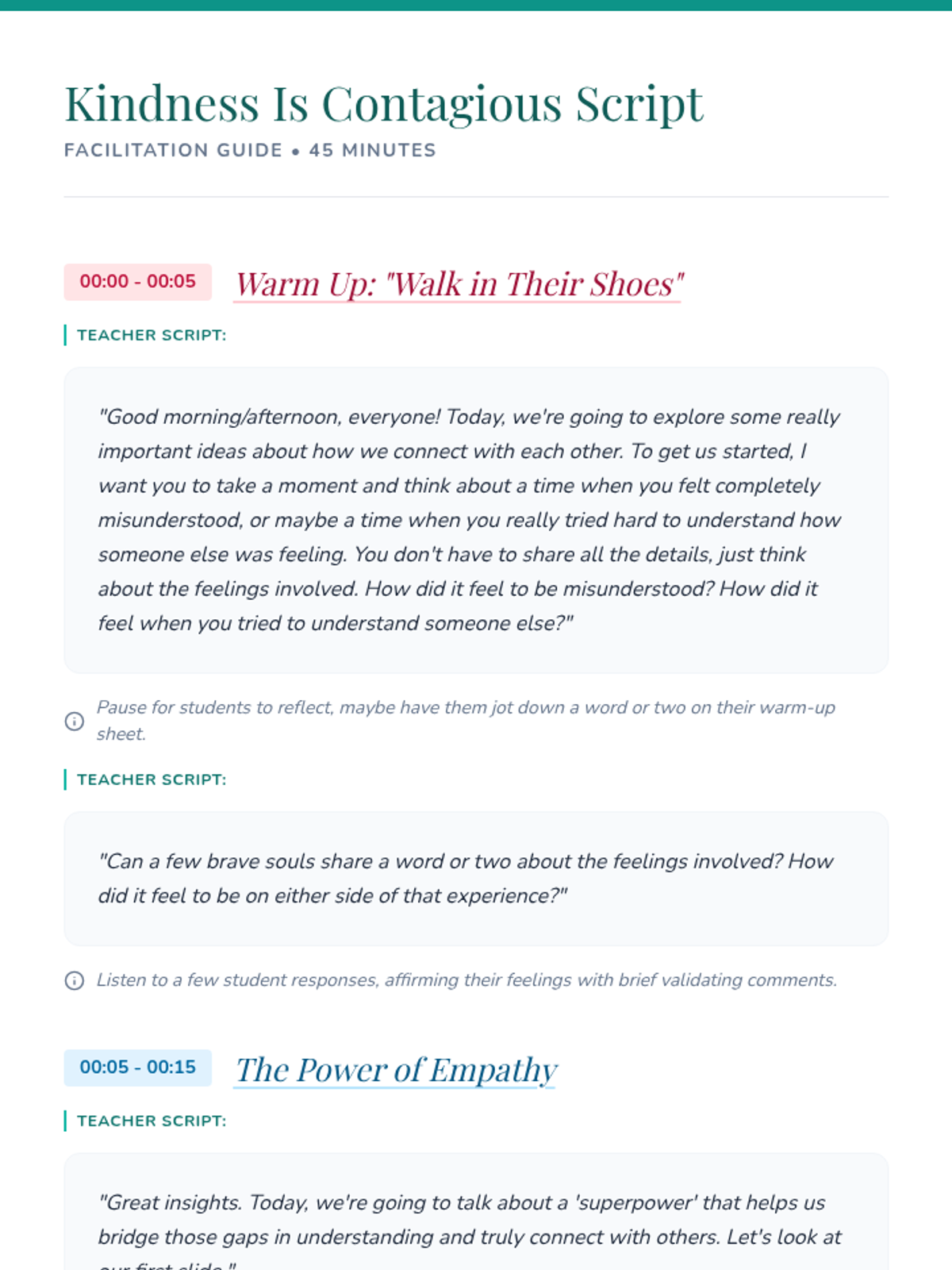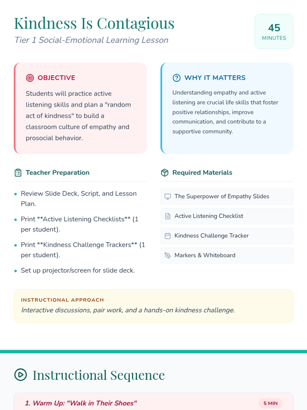 A 45-minute social-emotional learning lesson for 7th graders focused on empathy, active listening, and practicing random acts of kindness. Students distinguish between empathy and sympathy and commit to a week-long kindness challenge.