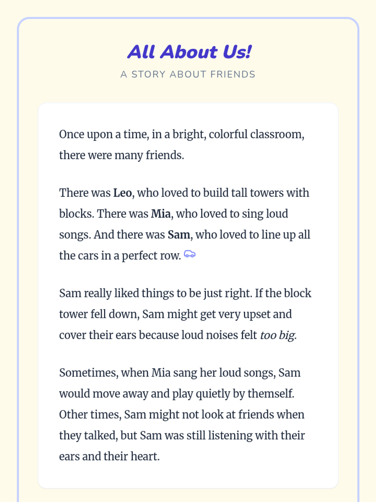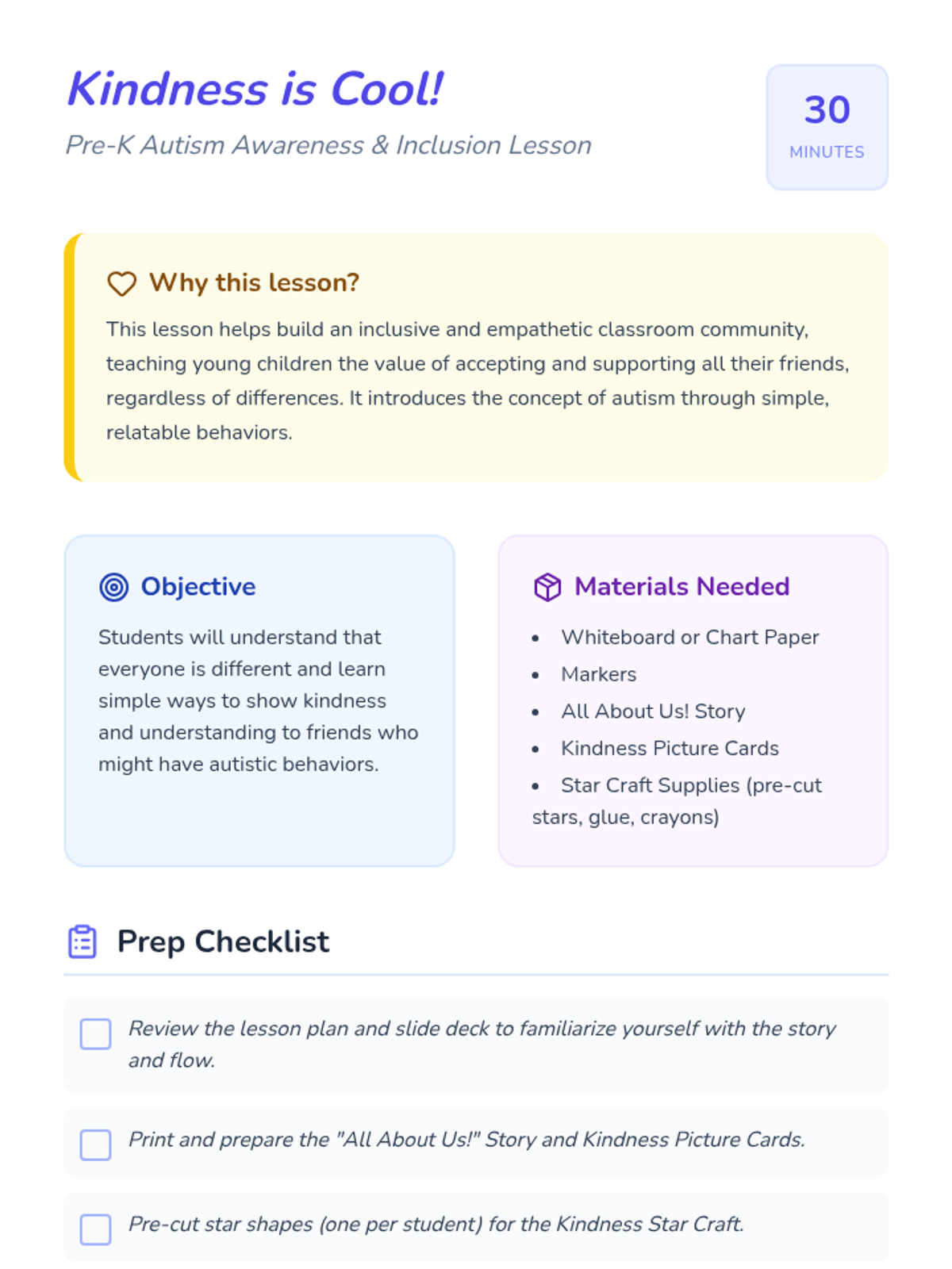 A Pre-K lesson introducing the concept of autism through storytelling and interactive activities, fostering empathy and an inclusive classroom environment.