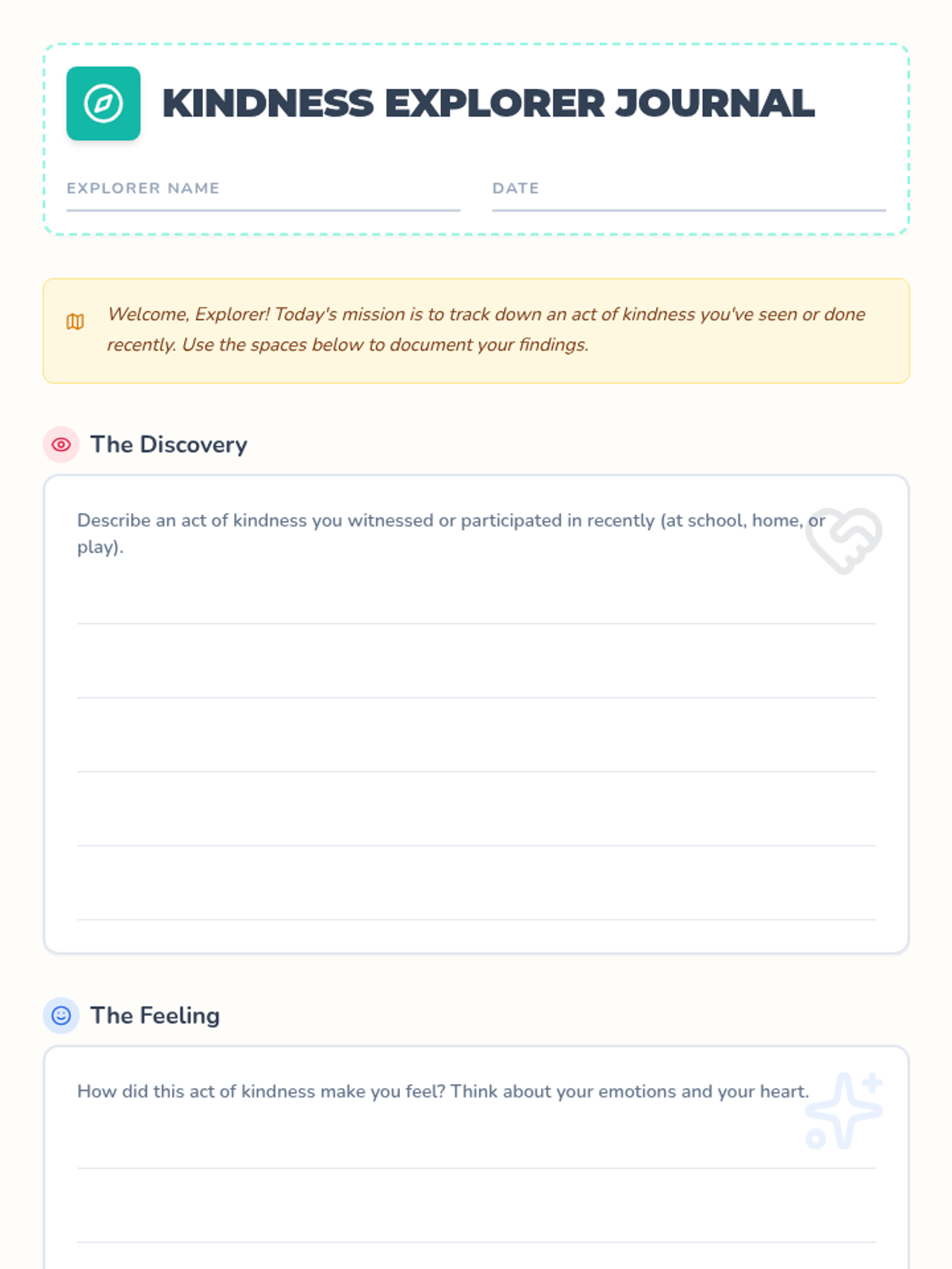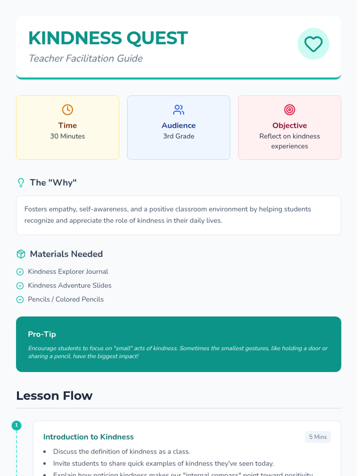 A reflective lesson where 3rd grade students explore and document acts of kindness through guided journaling to foster empathy and a positive classroom culture.