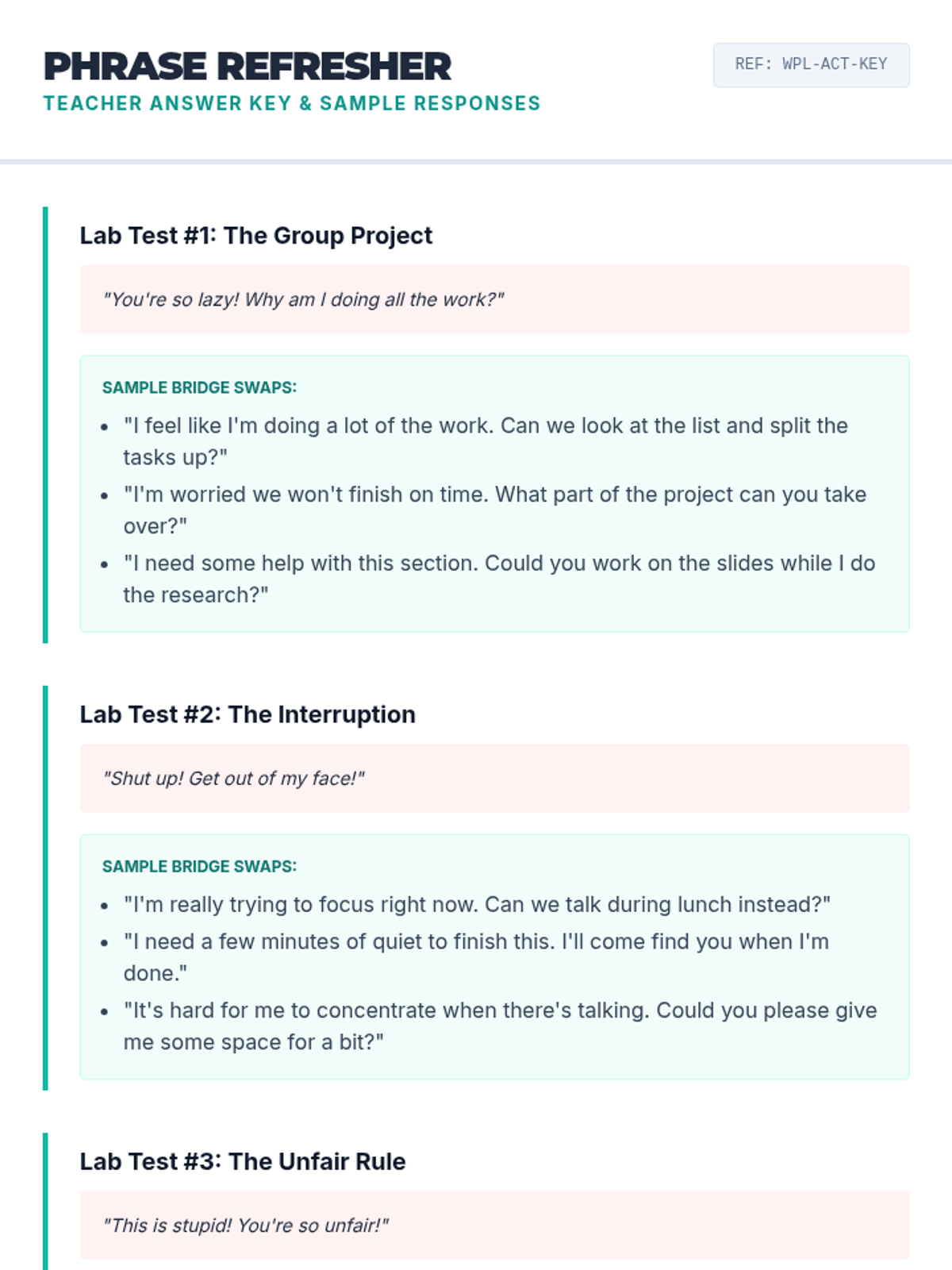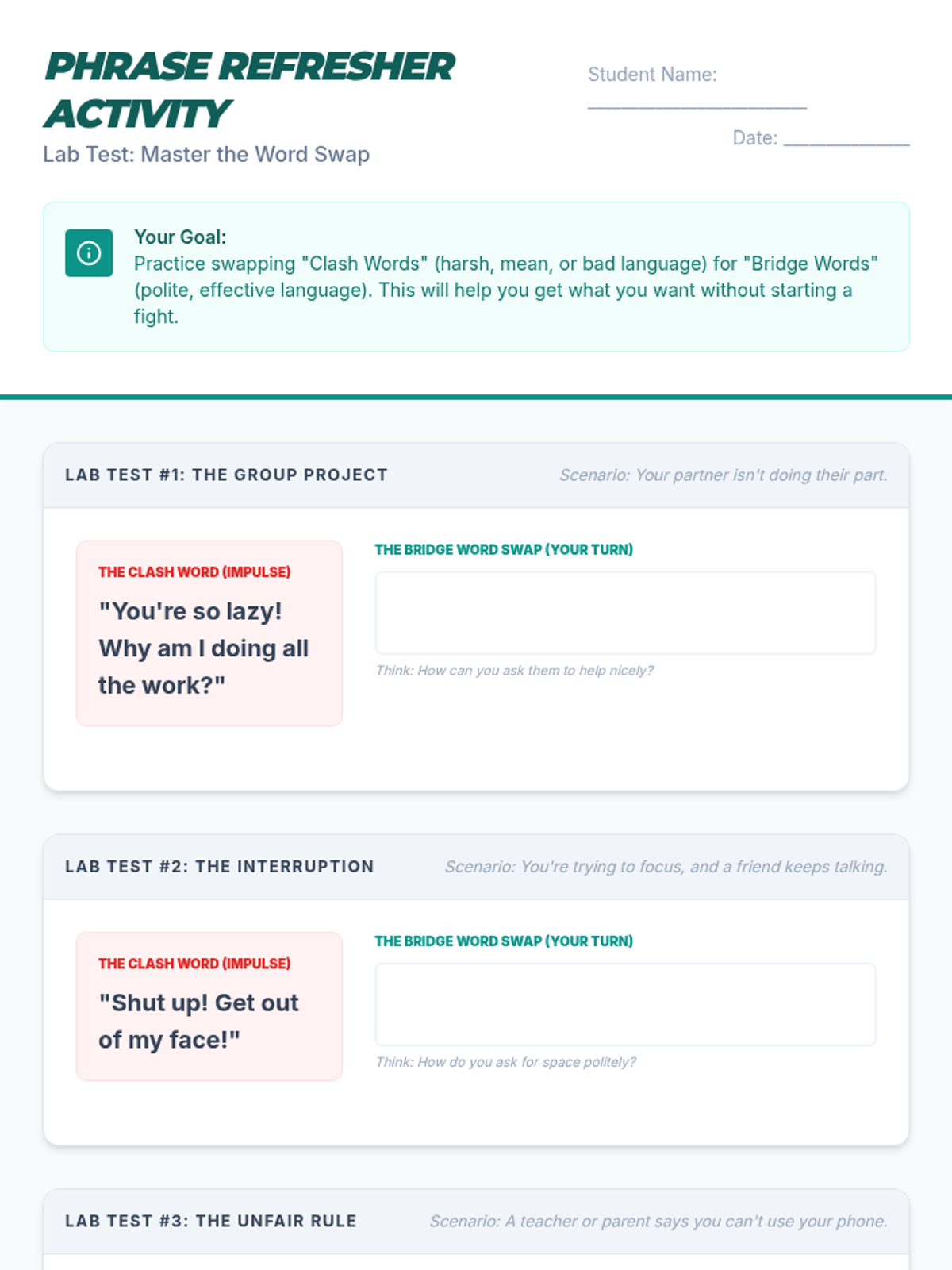 A mini-lesson focused on identifying the impact of harsh language and practicing polite, effective alternatives in social situations. Students learn the 'Word Swap' technique to transform 'clash words' into 'bridge words'.