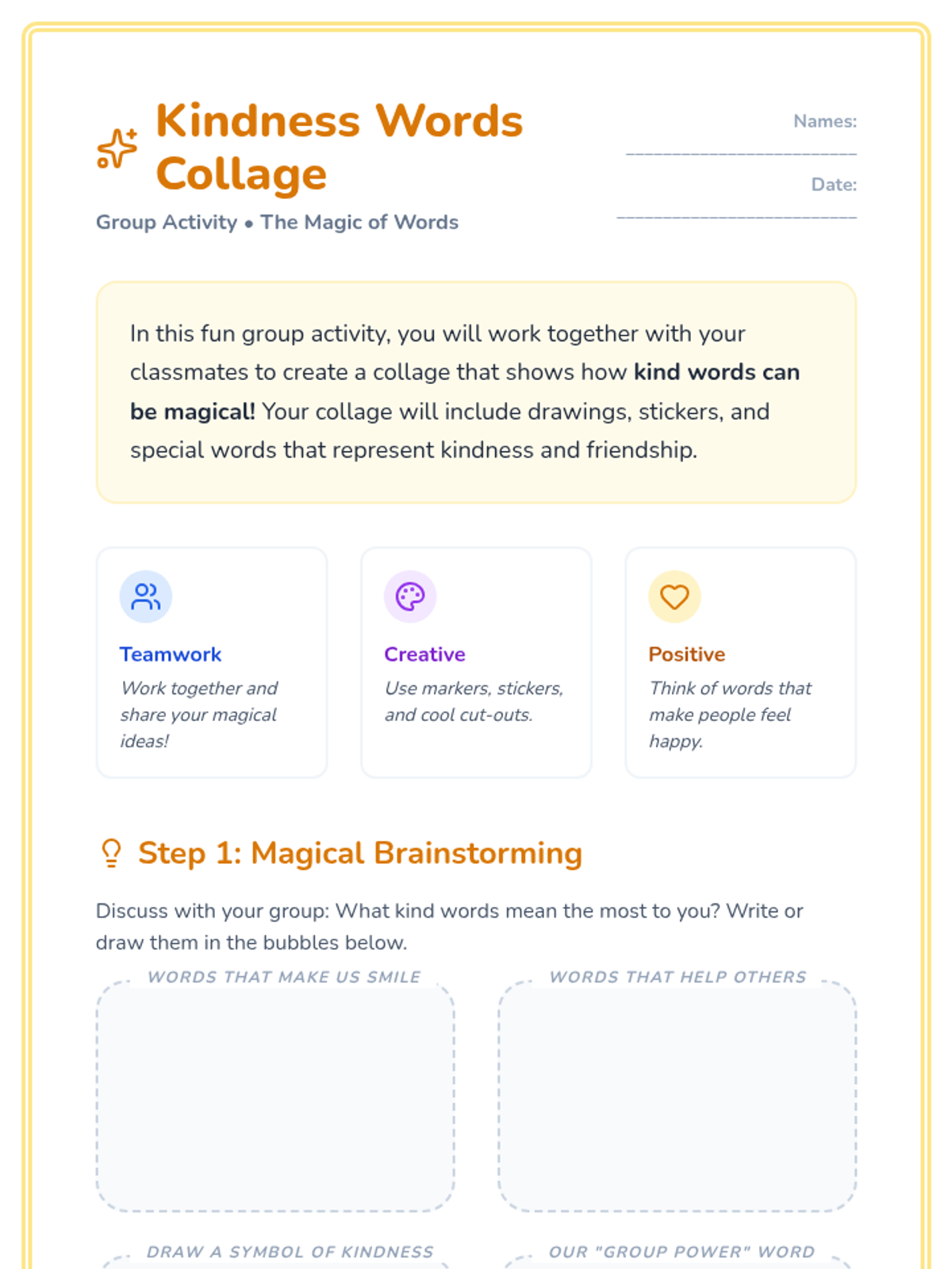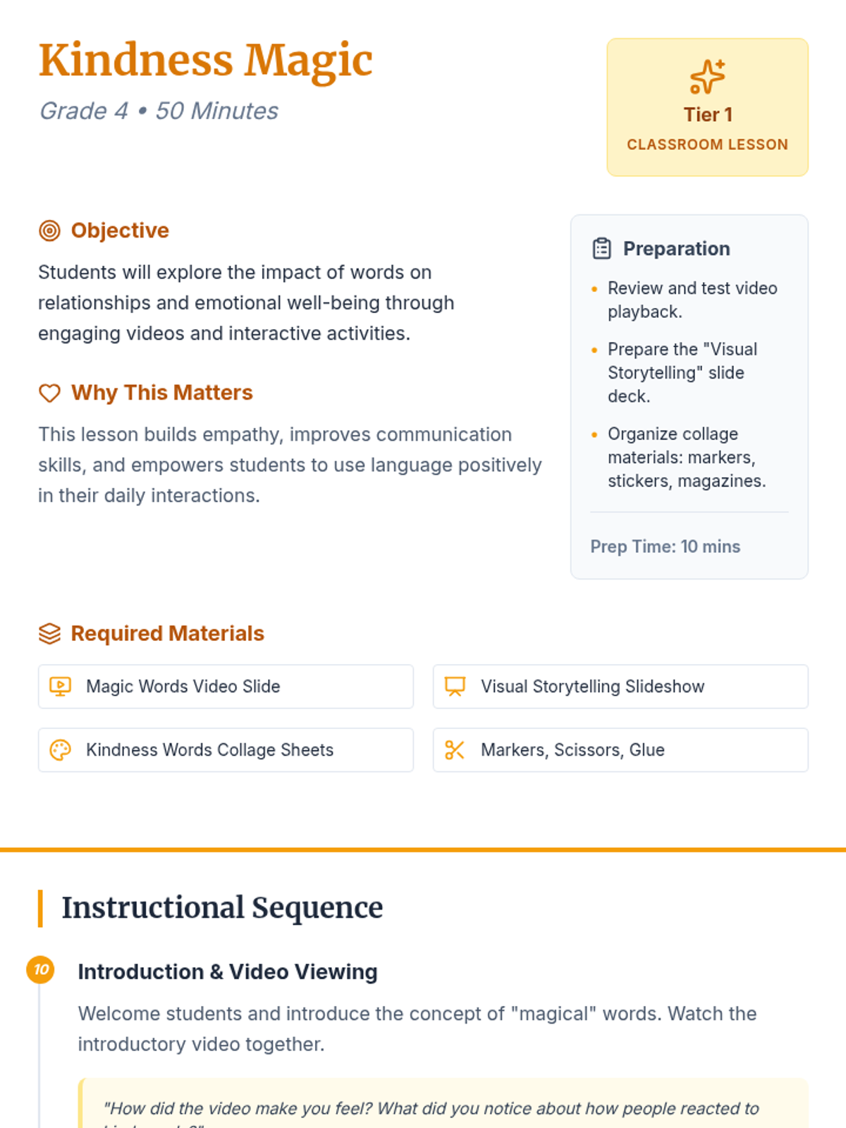 A foundational lesson for 4th-grade students focused on building empathy and understanding the 'magical' power of kind words. Through visual storytelling and a creative collage activity, students explore how positive language strengthens friendships.