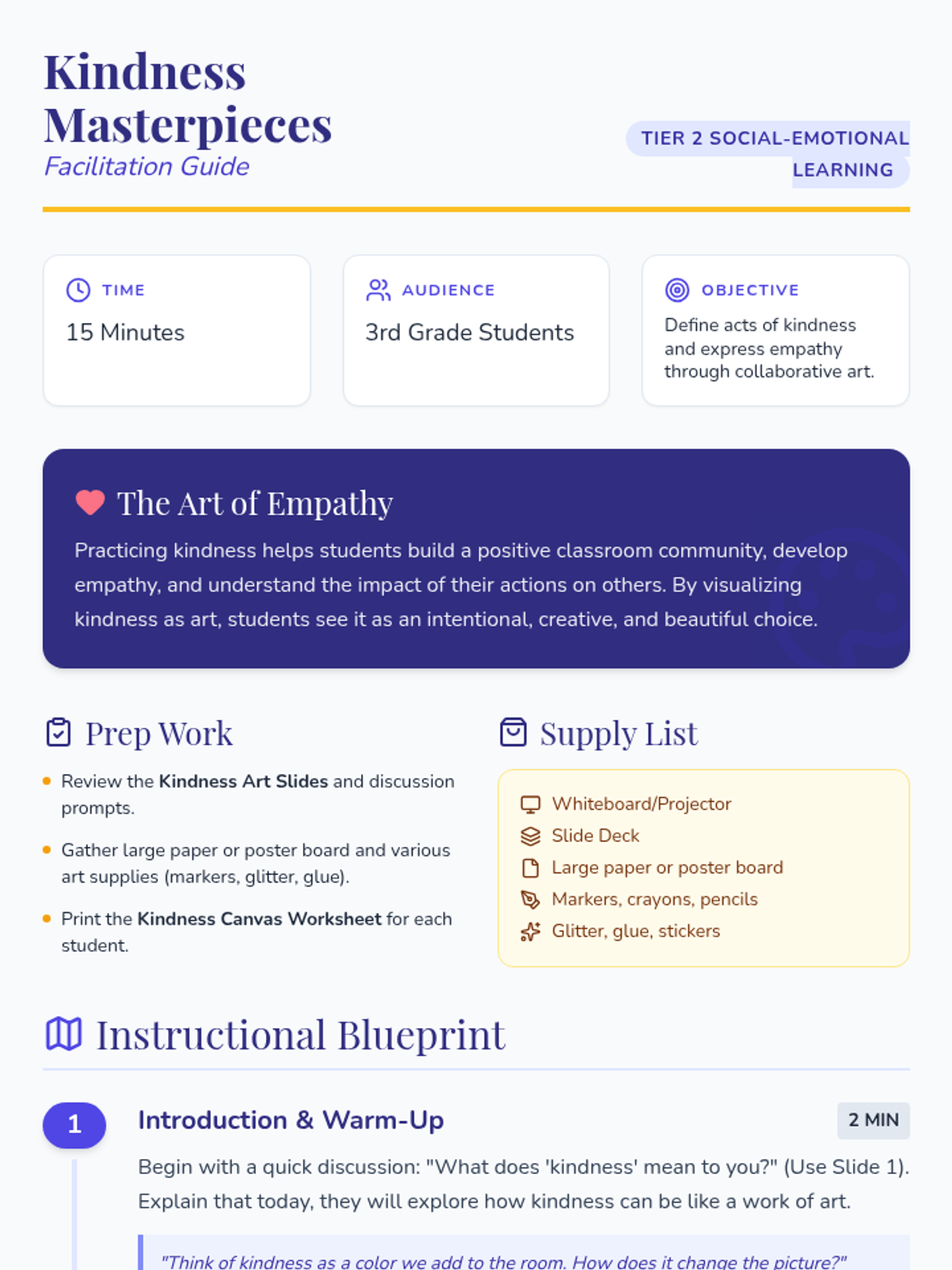 A 15-minute Tier 2 social-emotional learning lesson for 3rd graders that explores kindness through collaborative art, fostering empathy and positive social behaviors.