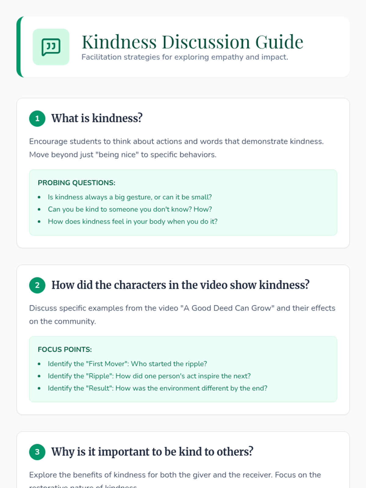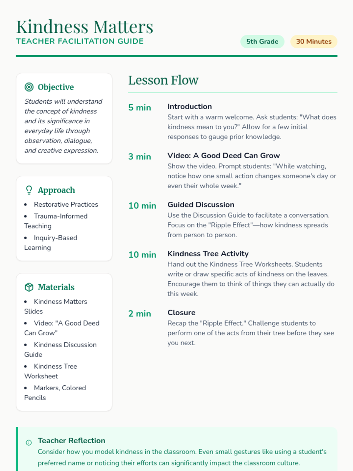A 30-minute lesson for 5th-grade students to explore the concept of kindness, its impact on others, and how small deeds can create a positive ripple effect. includes a video, guided discussion, and a creative activity.