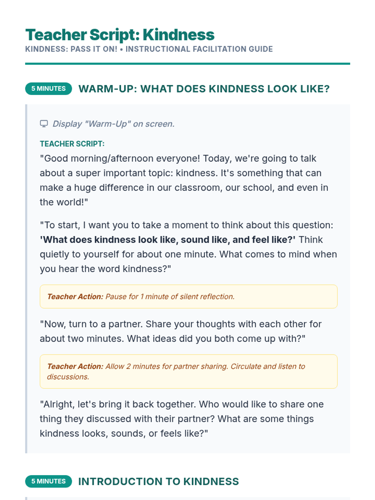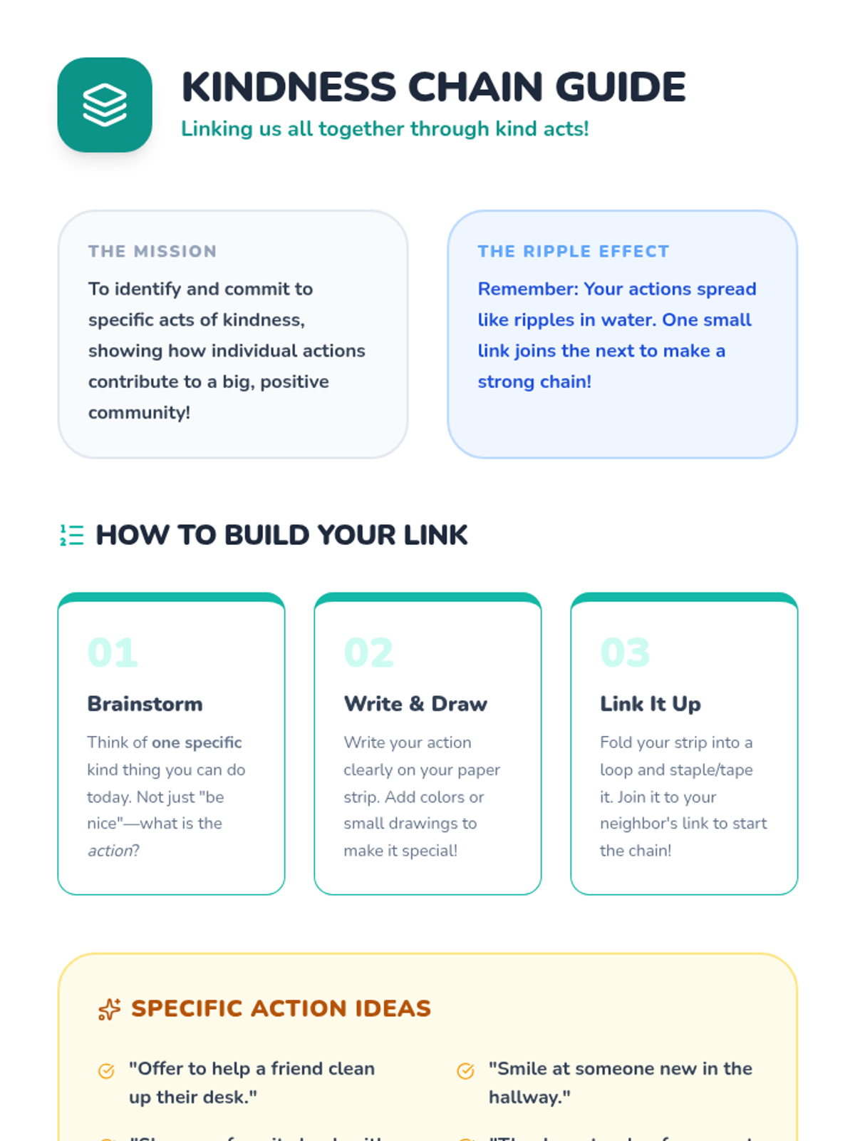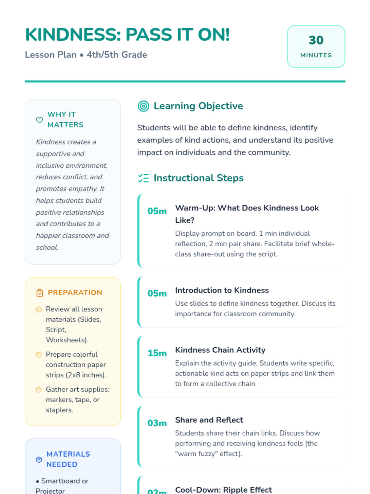 A 30-minute lesson for 4th and 5th graders focused on defining kindness, understanding the 'ripple effect,' and creating a collective kindness chain to foster a positive school environment.