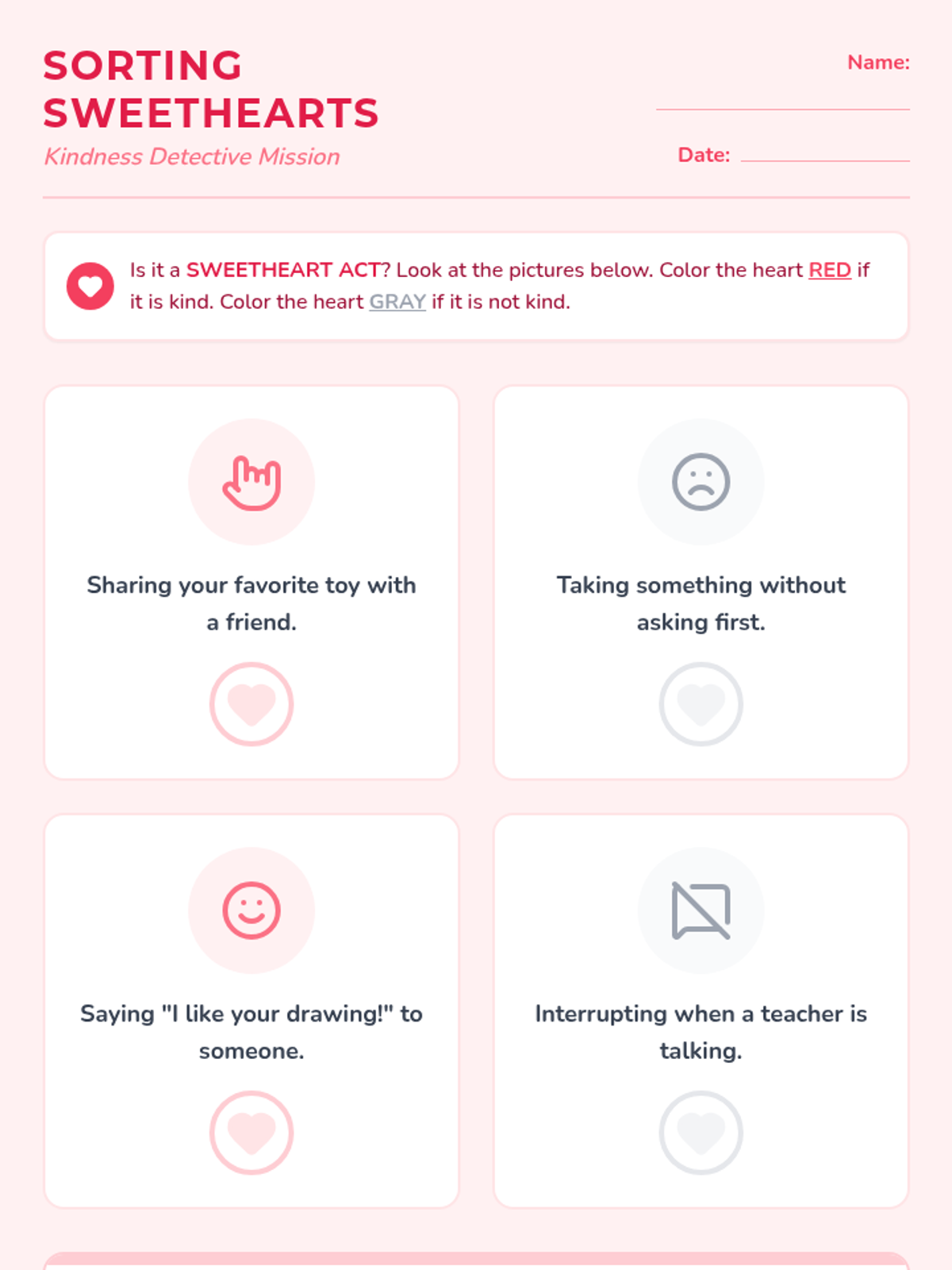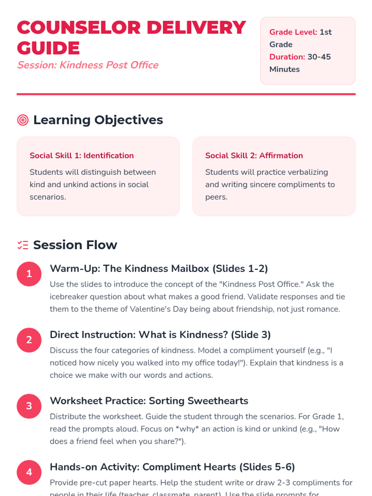 A counseling session focused on teaching Grade 1 students social skills through a Valentine's Day 'Kindness Post Office' theme, focusing on compliments and kind actions.