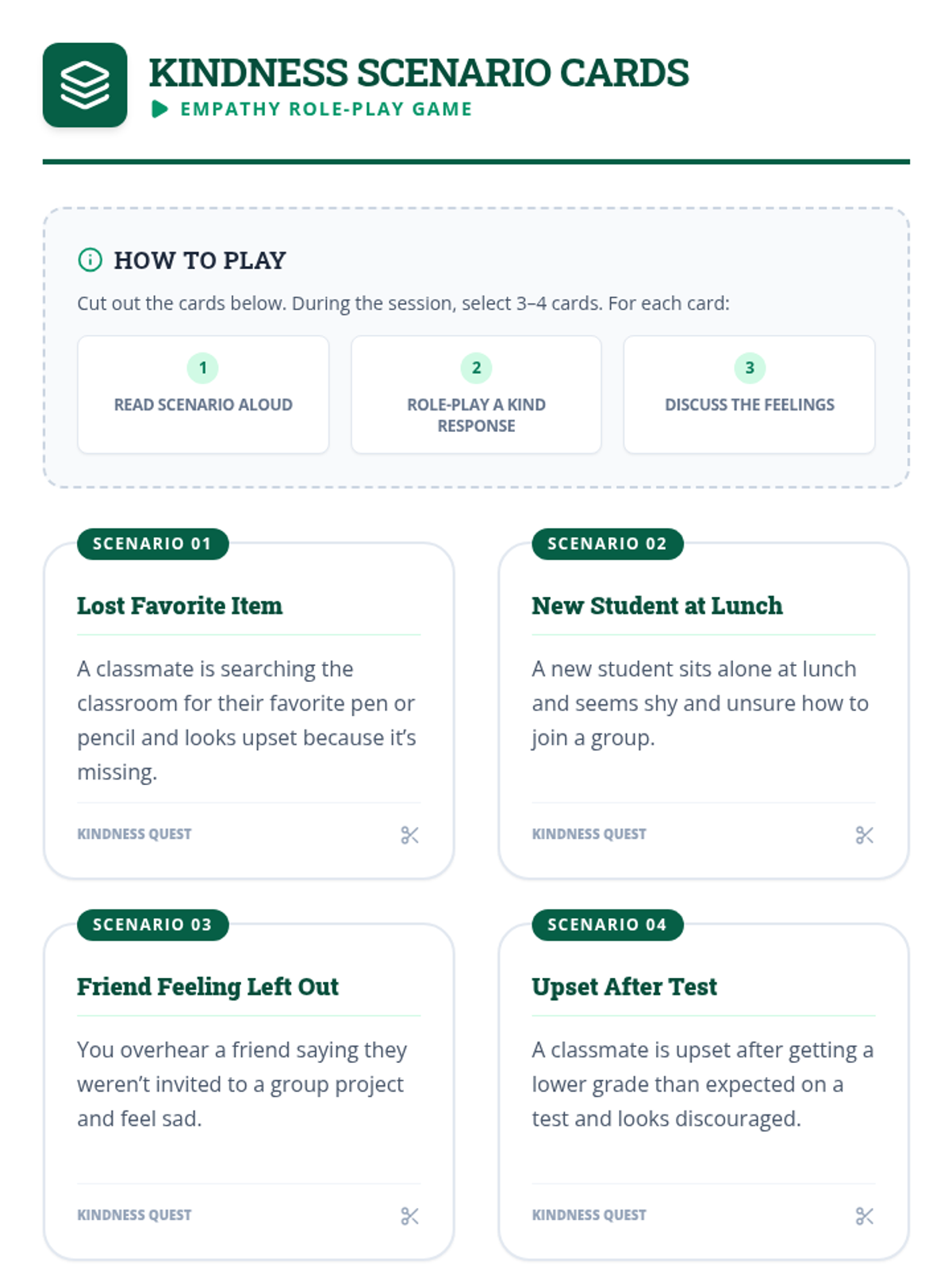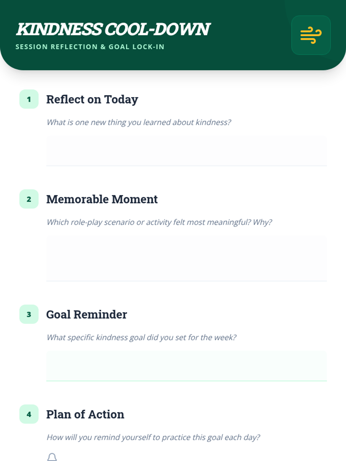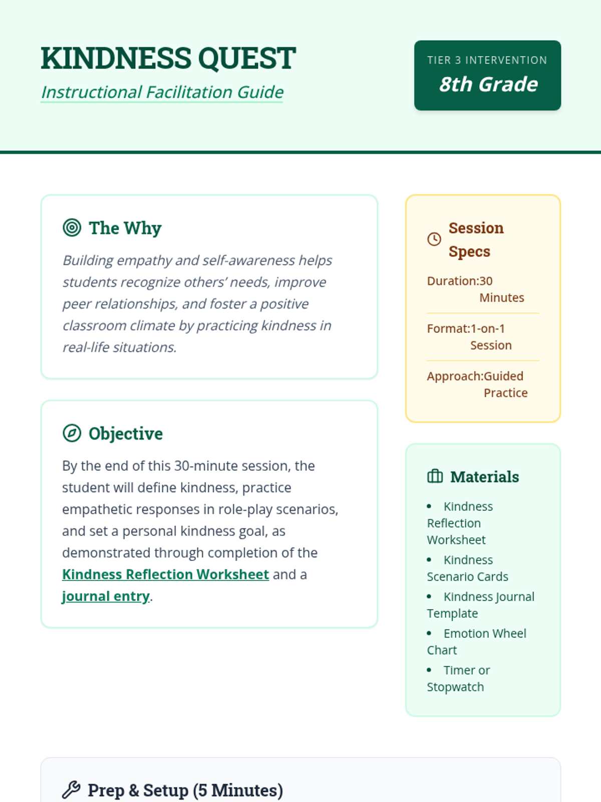 A one-on-one, 30-minute individual session for 8th graders to build empathy and self-awareness through reflection, scenario role-play, and journaling.