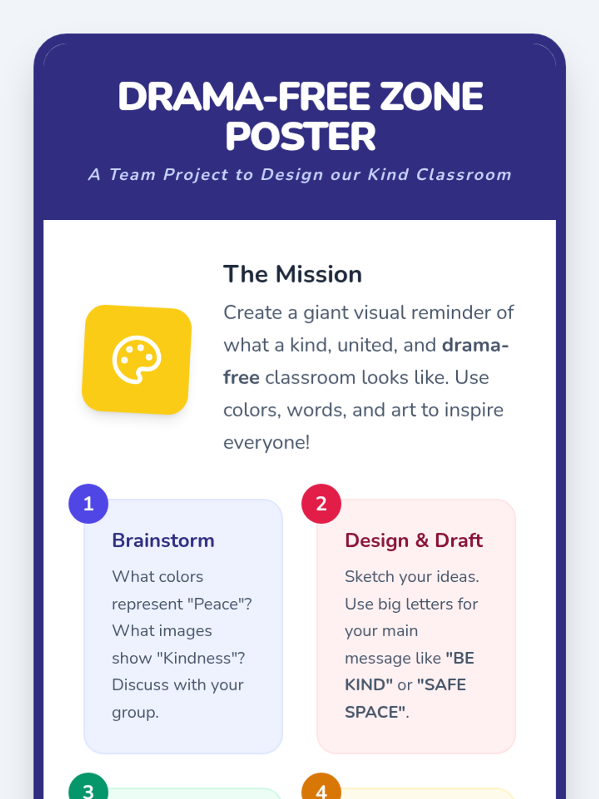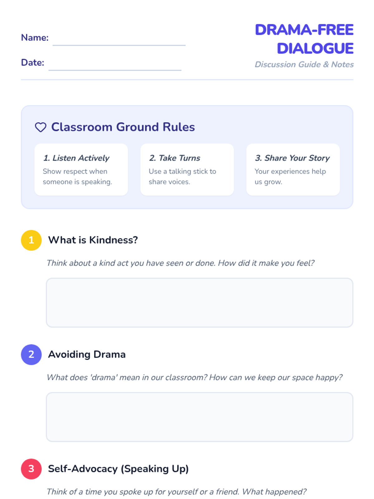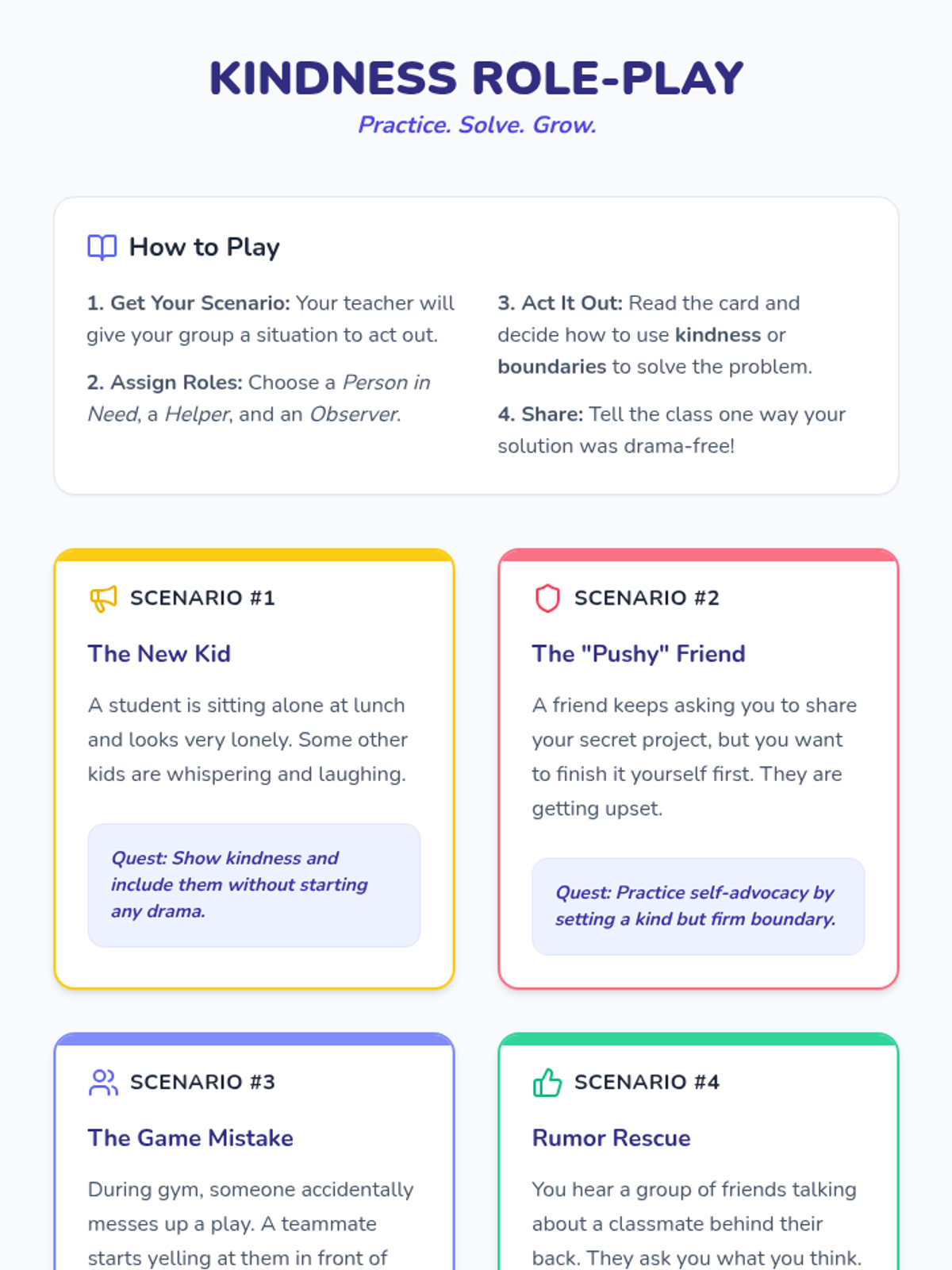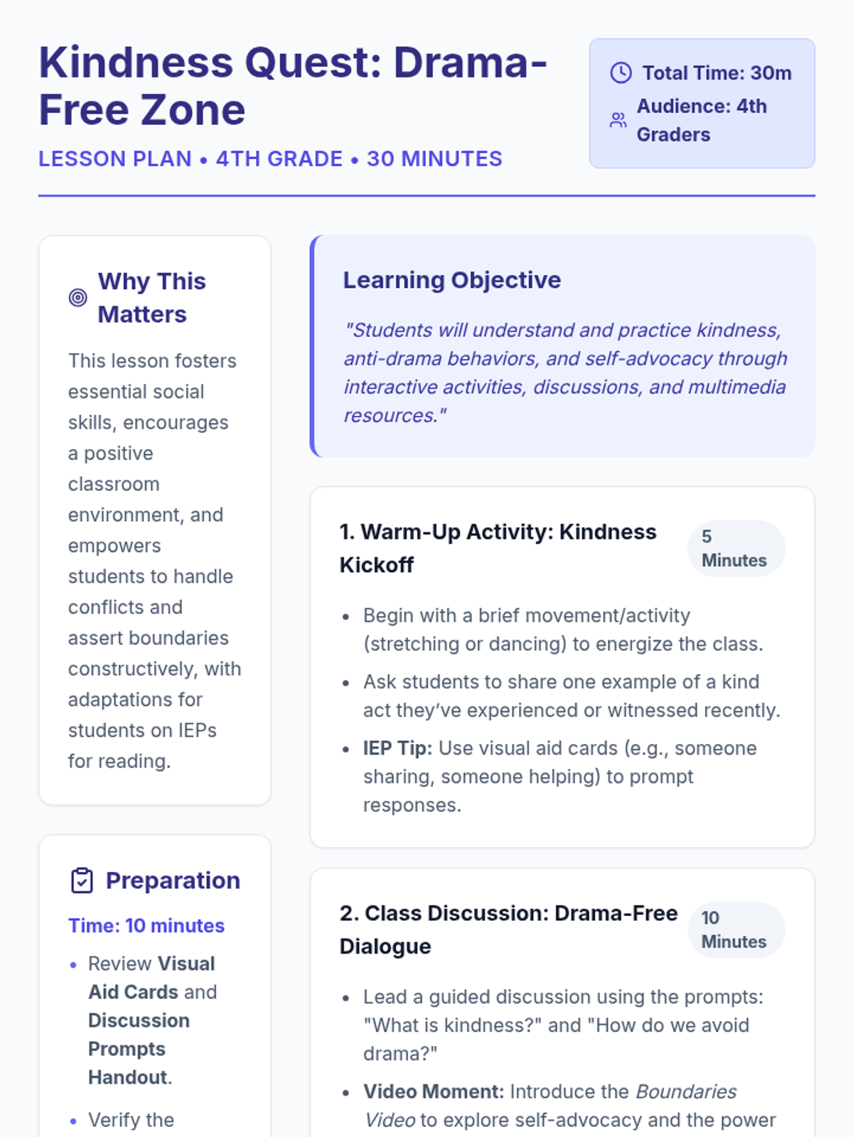 A 30-minute social-emotional learning lesson for 4th graders focused on kindness, anti-drama behaviors, and self-advocacy using interactive role-play and creative activities.