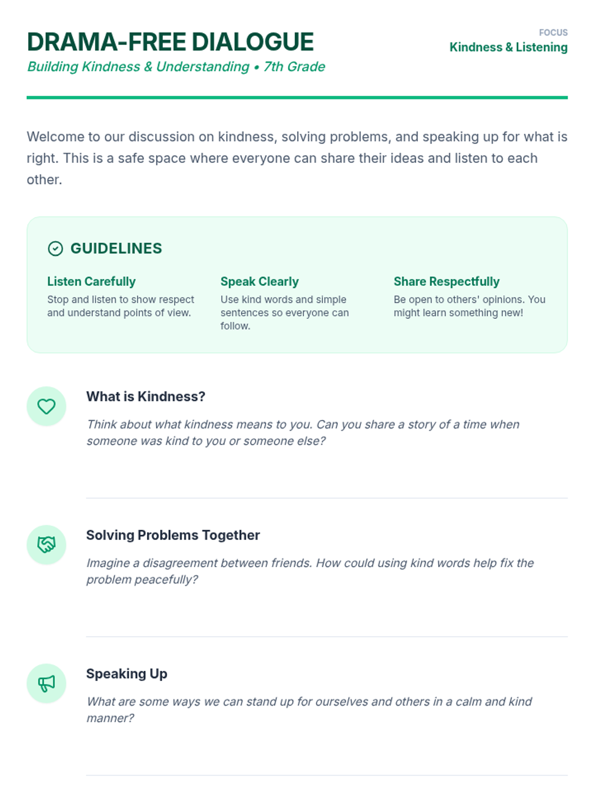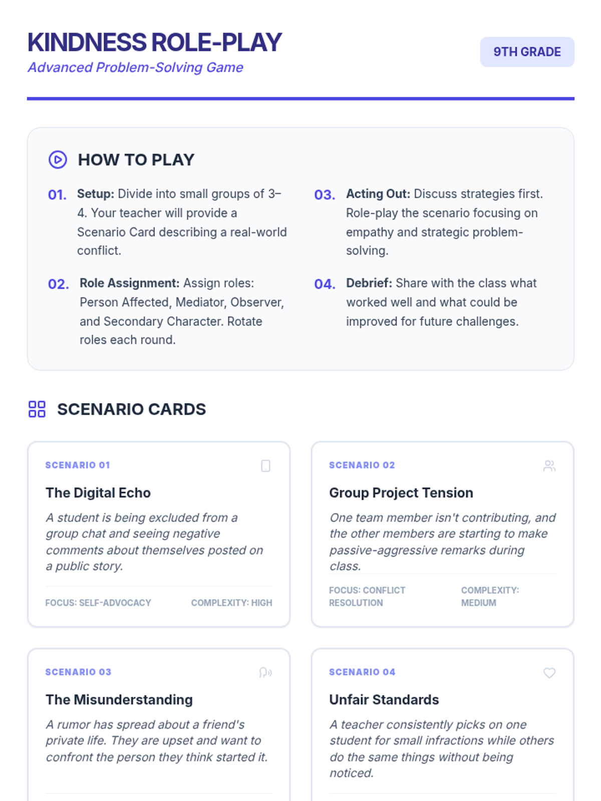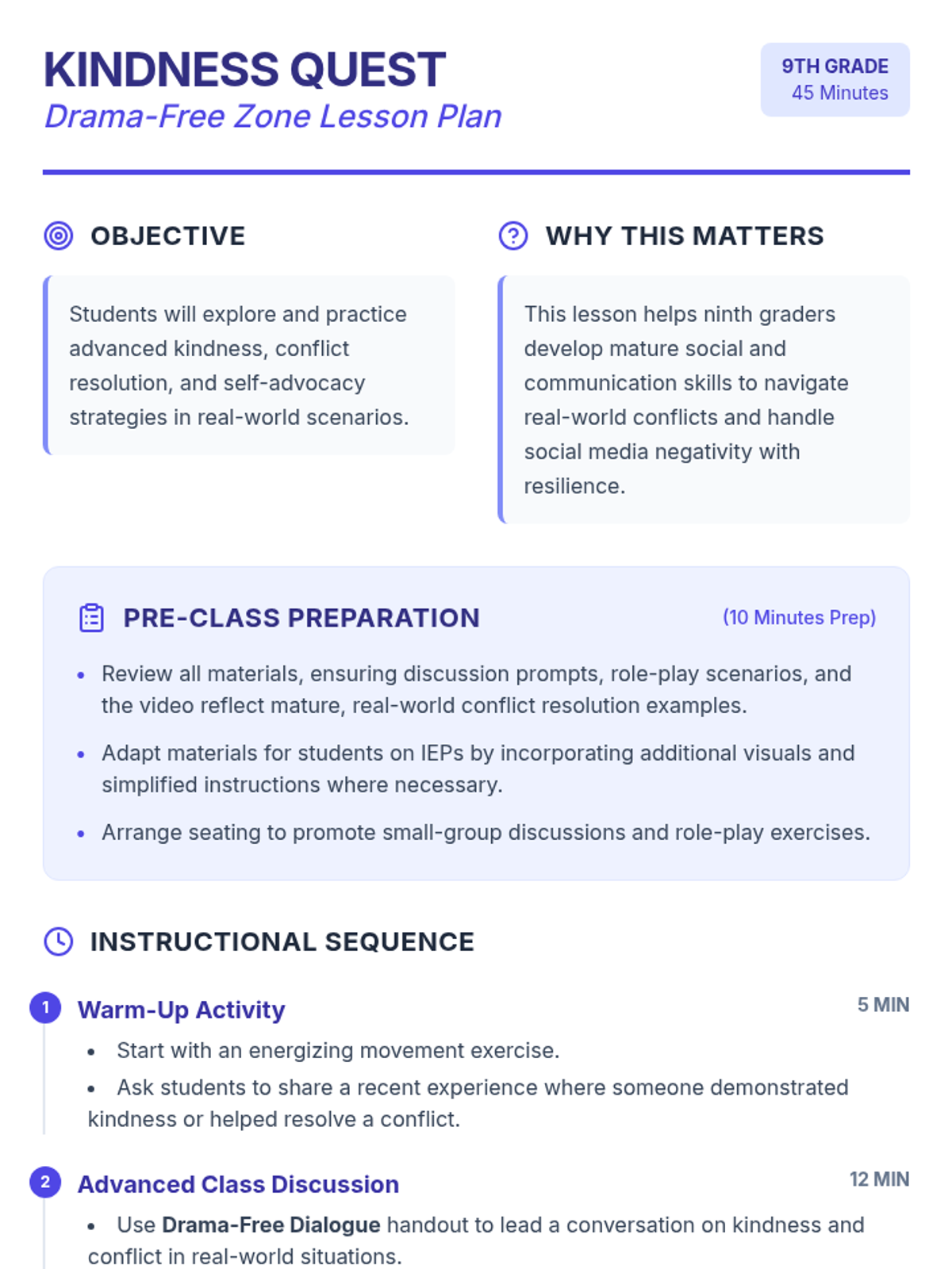 A 45-minute session for ninth graders focused on kindness, conflict resolution, and self-advocacy. This lesson helps students develop essential social skills to handle conflicts constructively and navigate social media negativity with resilience.