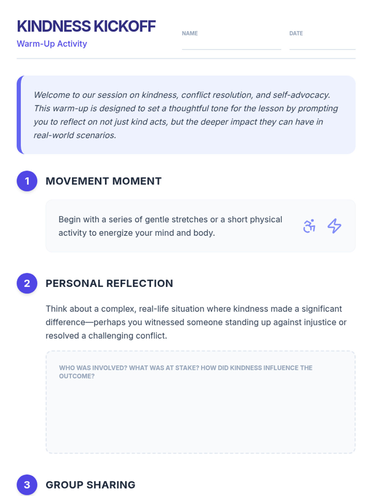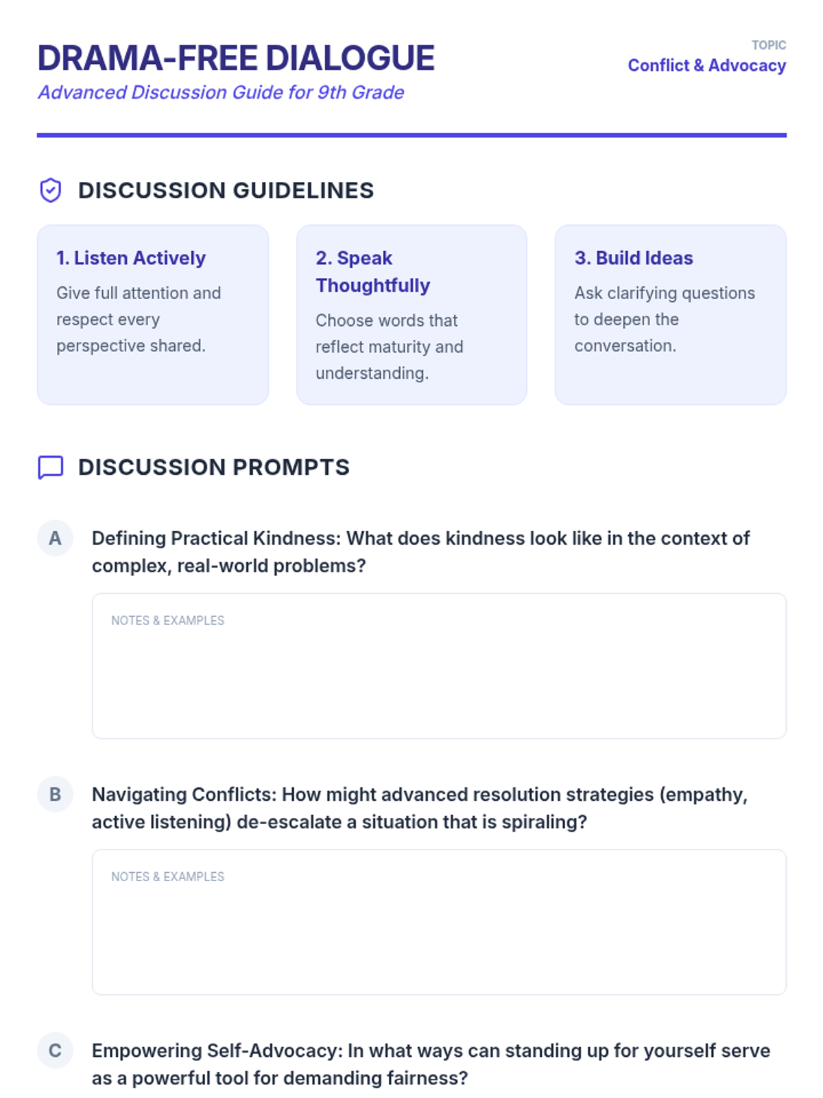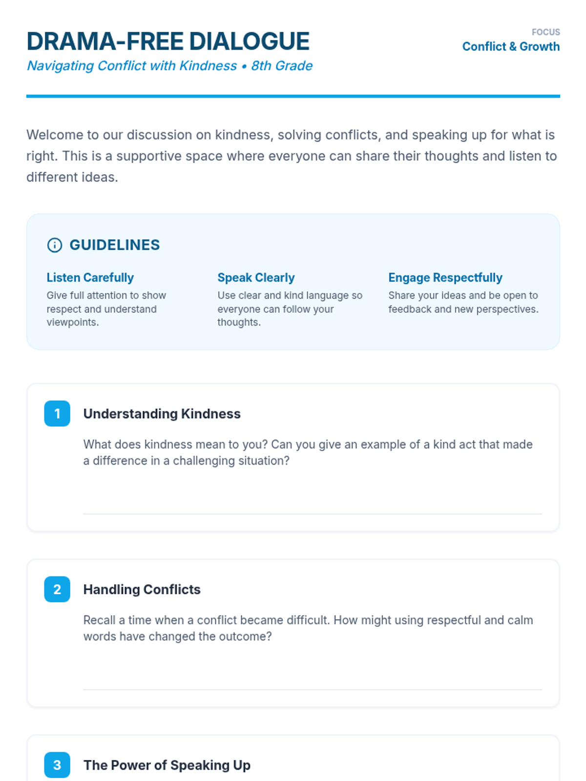 A 45-minute session for ninth graders focused on kindness, conflict resolution, and self-advocacy. This lesson helps students develop essential social skills to handle conflicts constructively and navigate social media negativity with resilience.