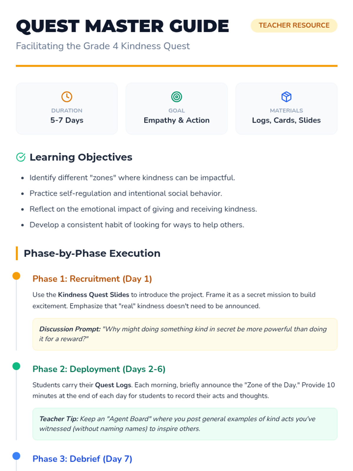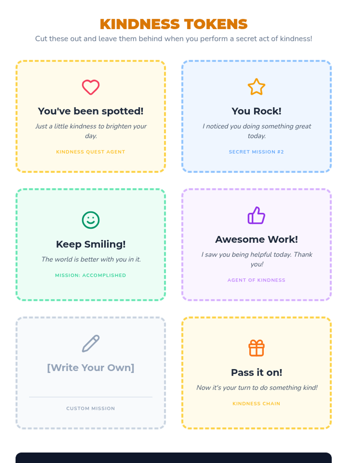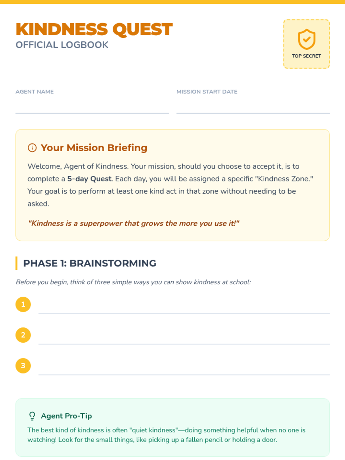 A multi-day hands-on project where students become 'Kindness Detectives' to complete a series of secret missions to improve their school community.