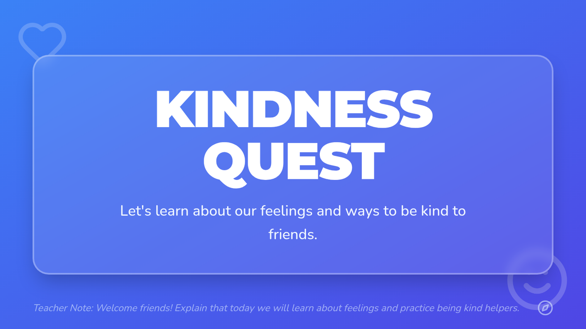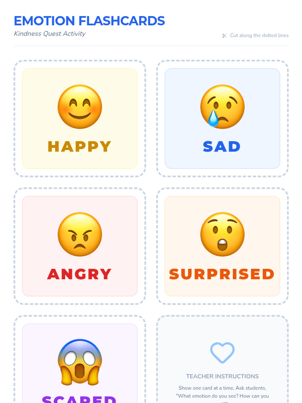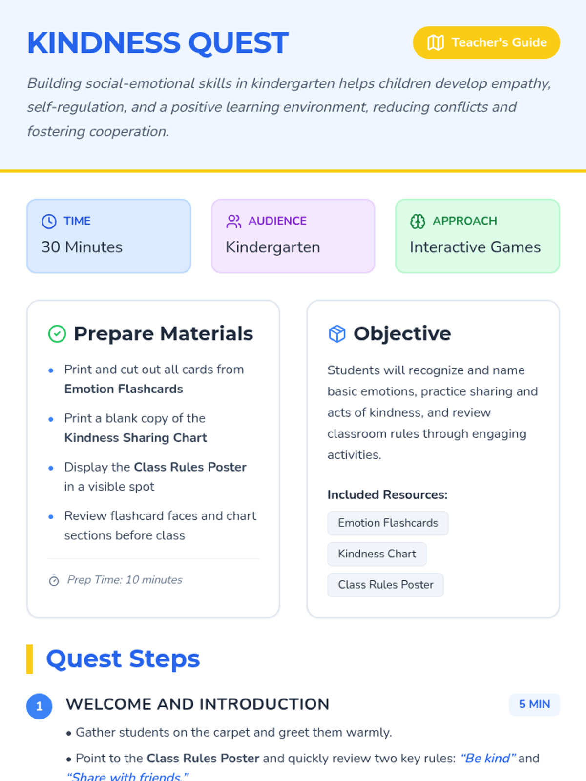 A foundational 30-minute social-emotional lesson for kindergarteners focused on recognizing emotions, practicing kindness, and following classroom rules. Students explore feelings through flashcards and collaborate on a kindness chart to build empathy and positive classroom culture.