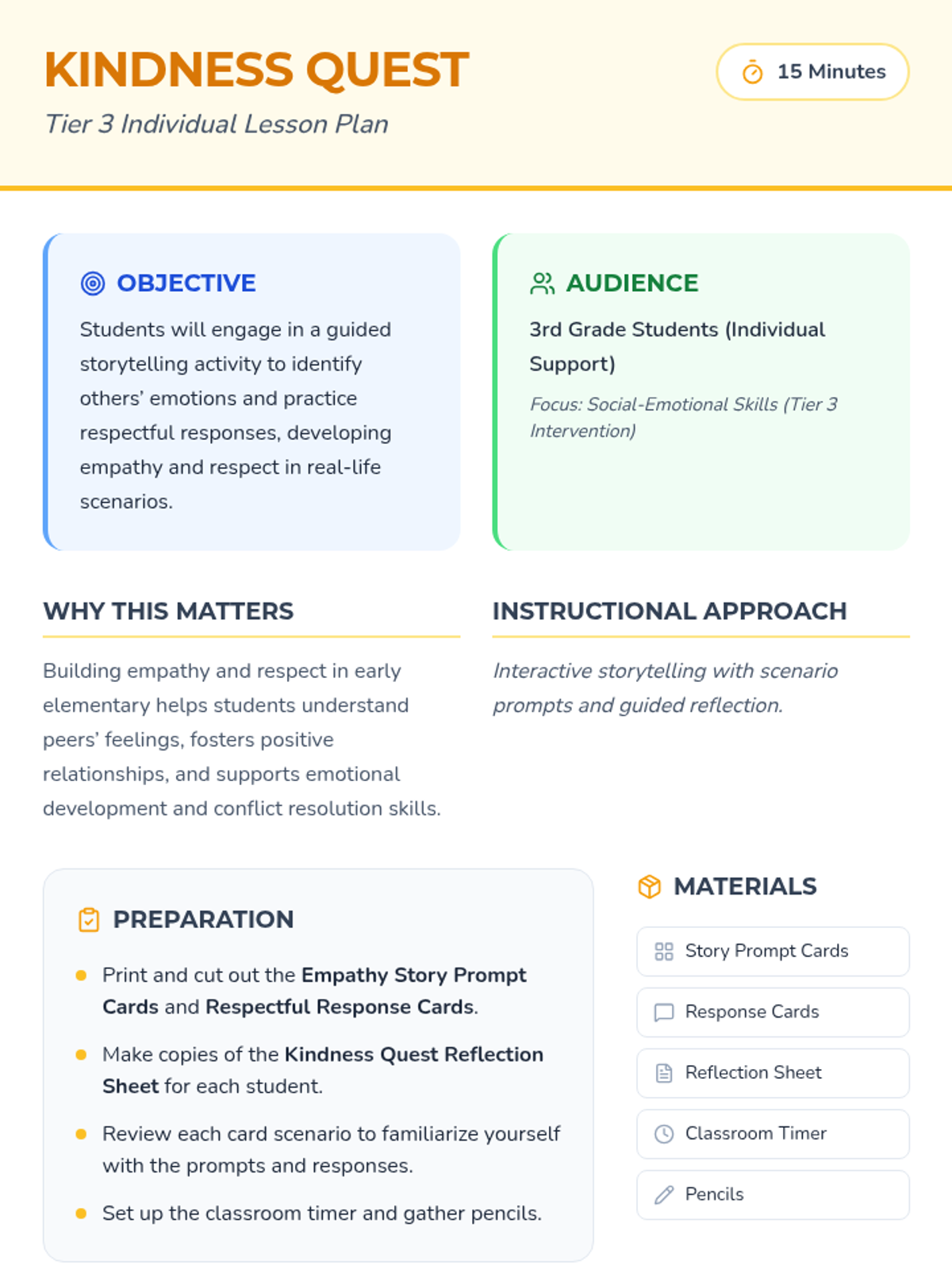 A 15-minute Tier 3 individual lesson for 3rd graders focusing on empathy and respect through storytelling and scenario-based practice.