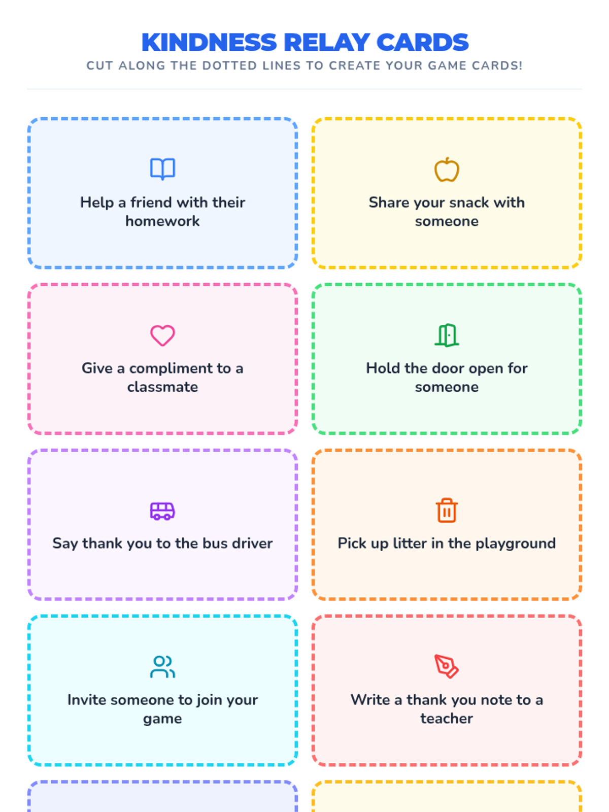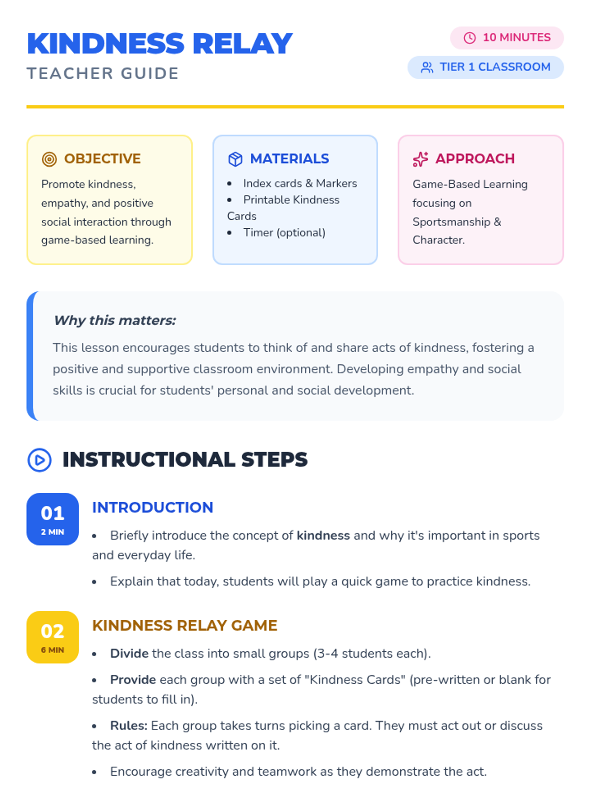 A quick and engaging 10-minute game designed to promote empathy and social skills by sharing and acting out acts of kindness.