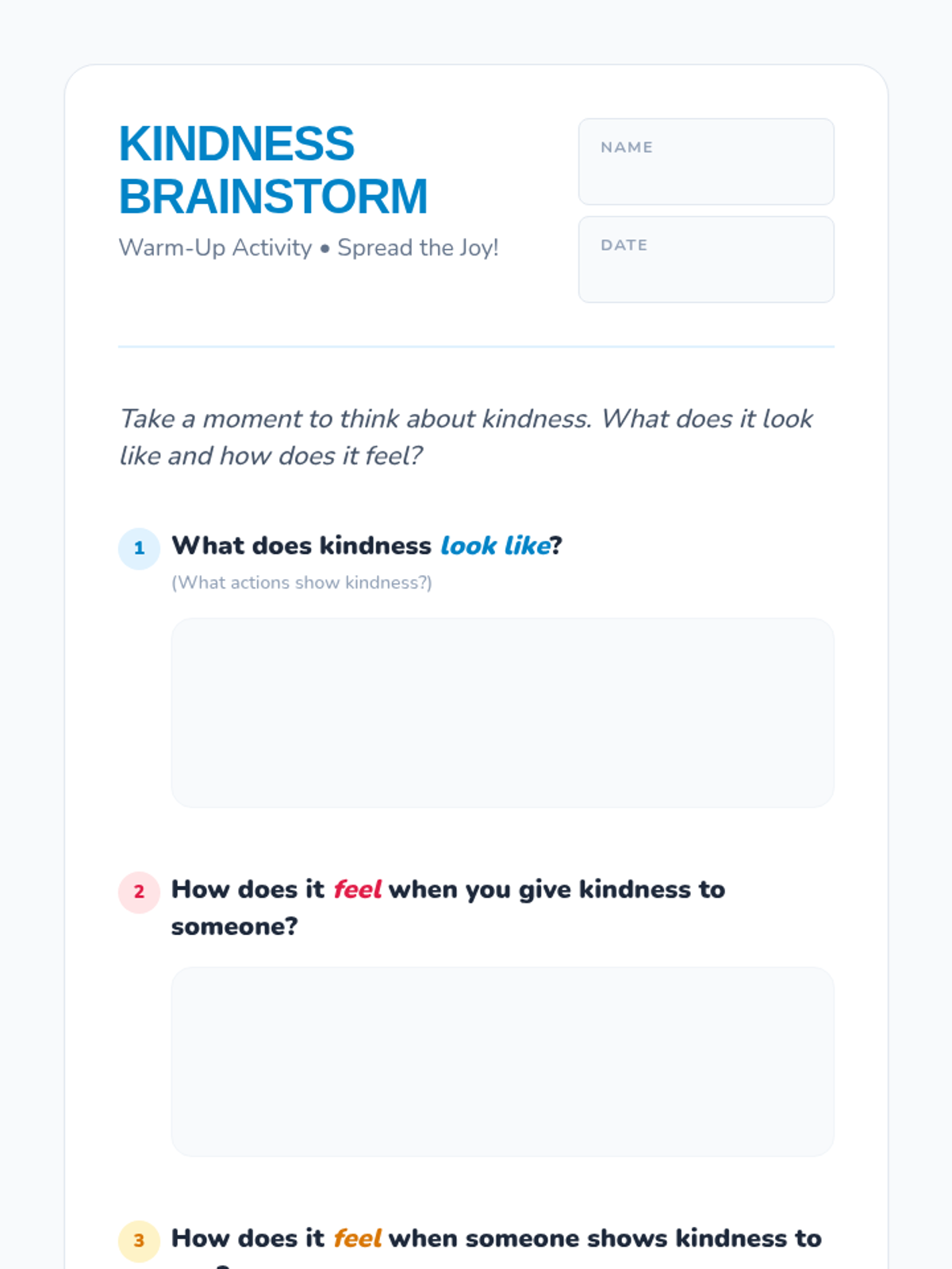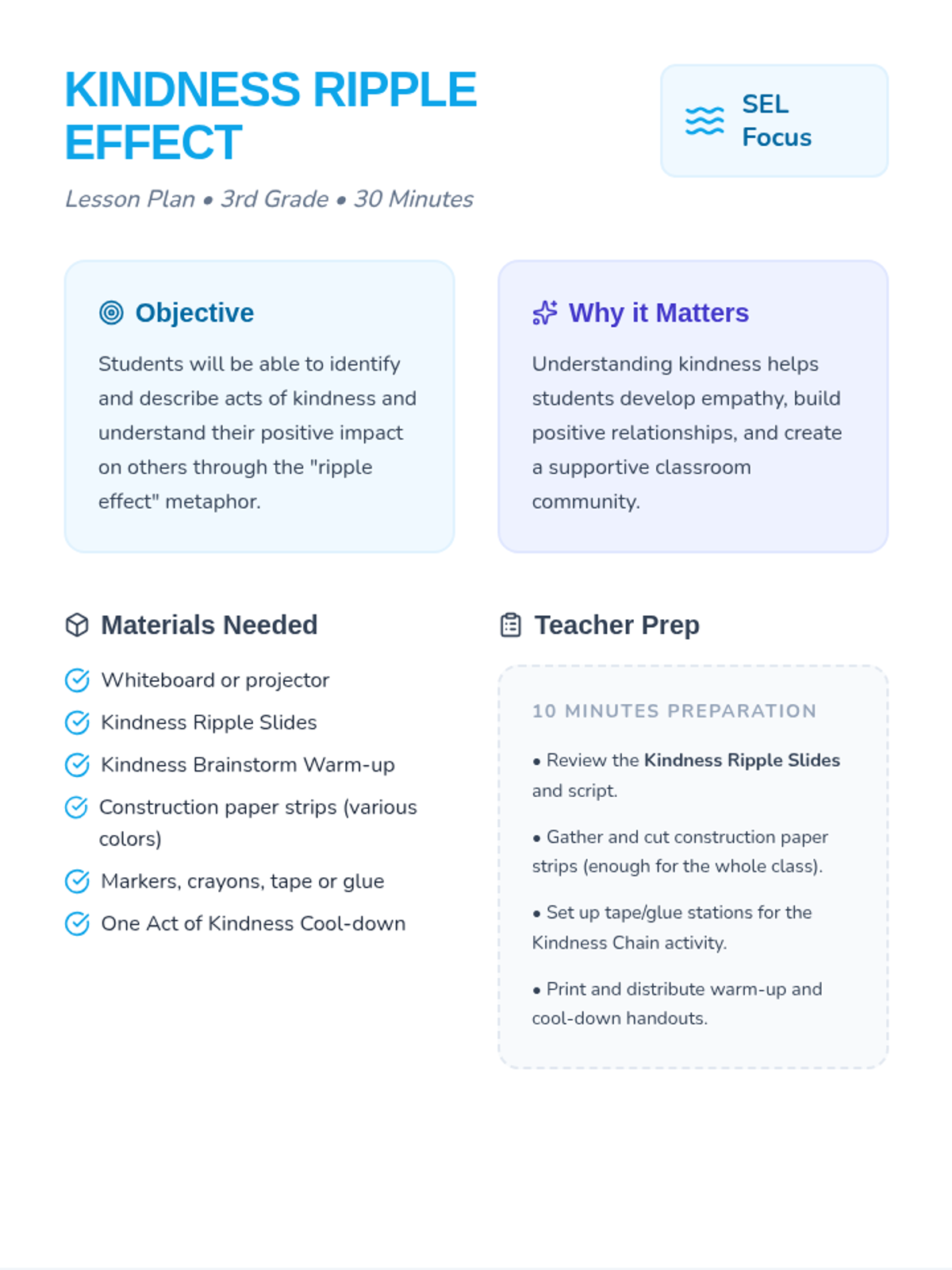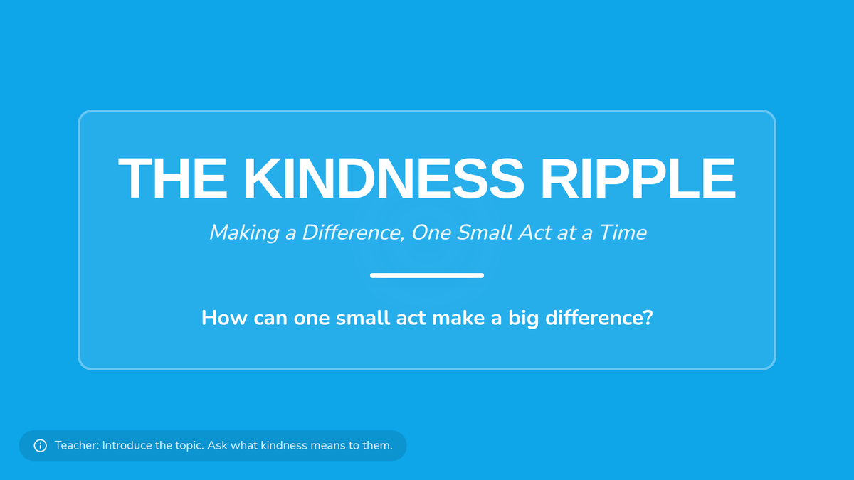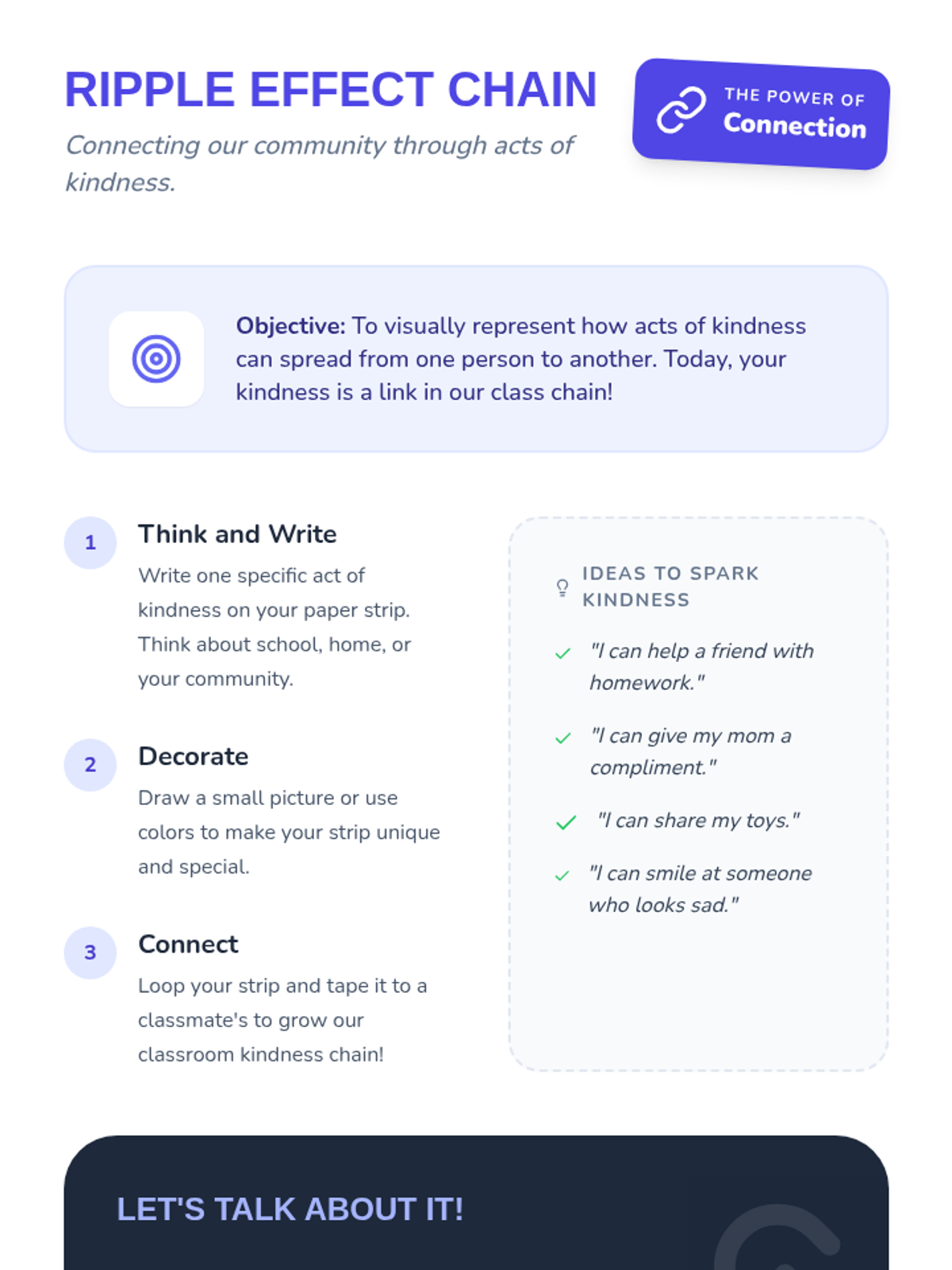 Students explore how small acts of kindness spread like ripples in water, creating a classroom kindness chain to visualize their collective impact.