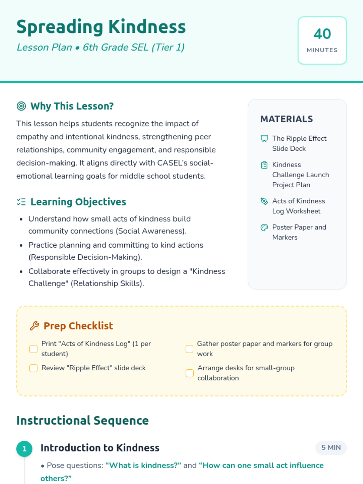 In this SEL-focused lesson for 6th graders, students explore how small acts of kindness create a ripple effect in their community through interactive discussions and collaborative project planning. Students develop CASEL competencies in relationship skills and social awareness.