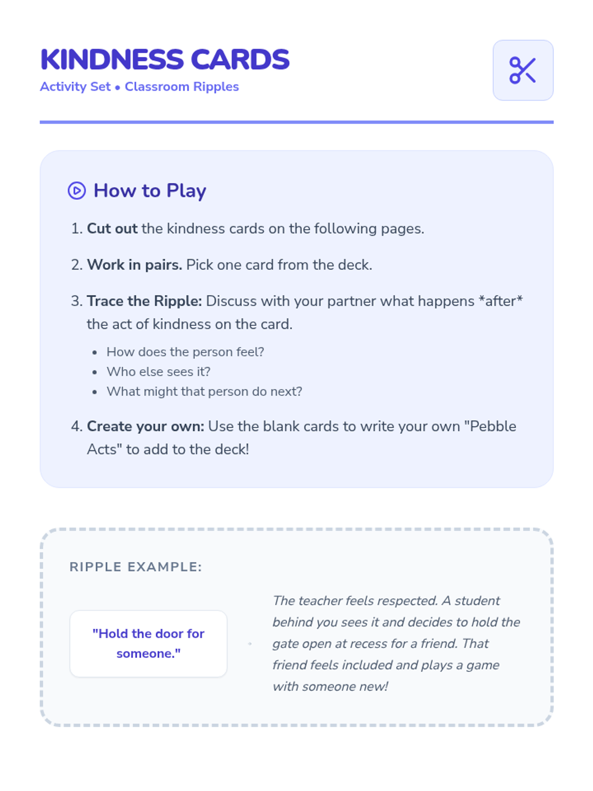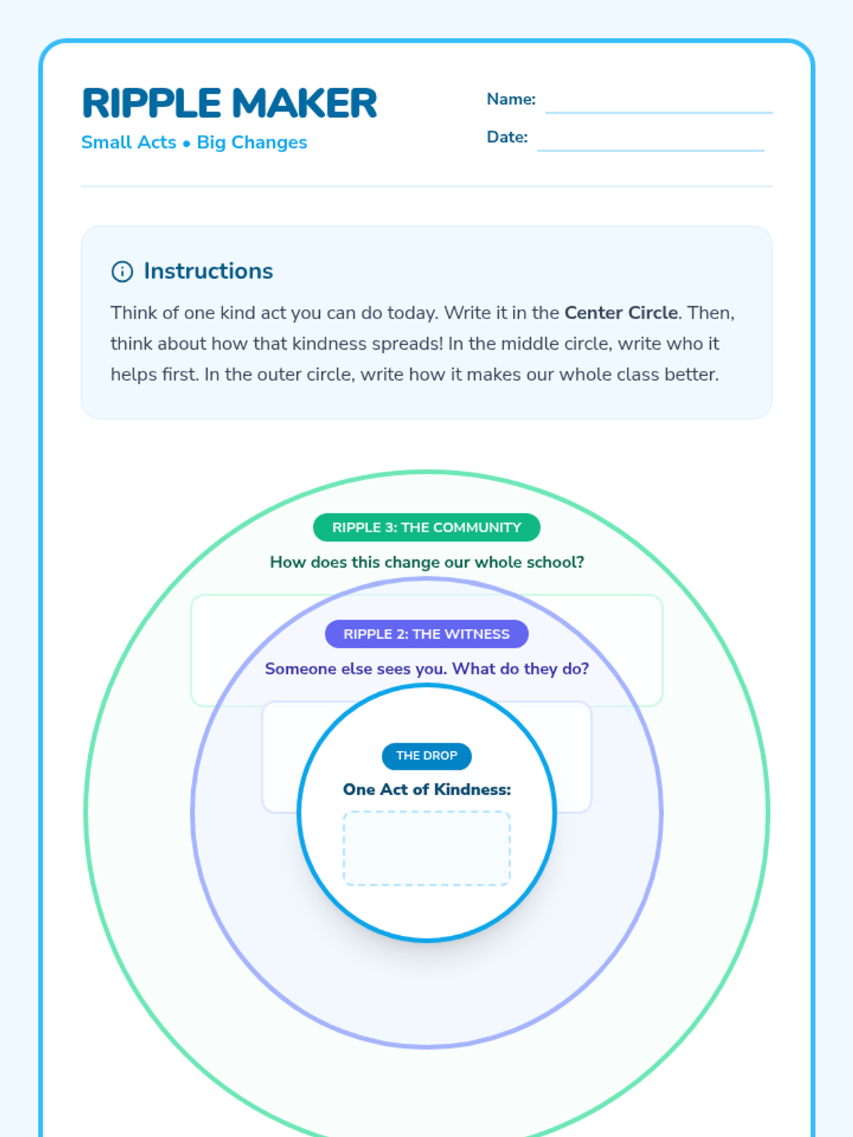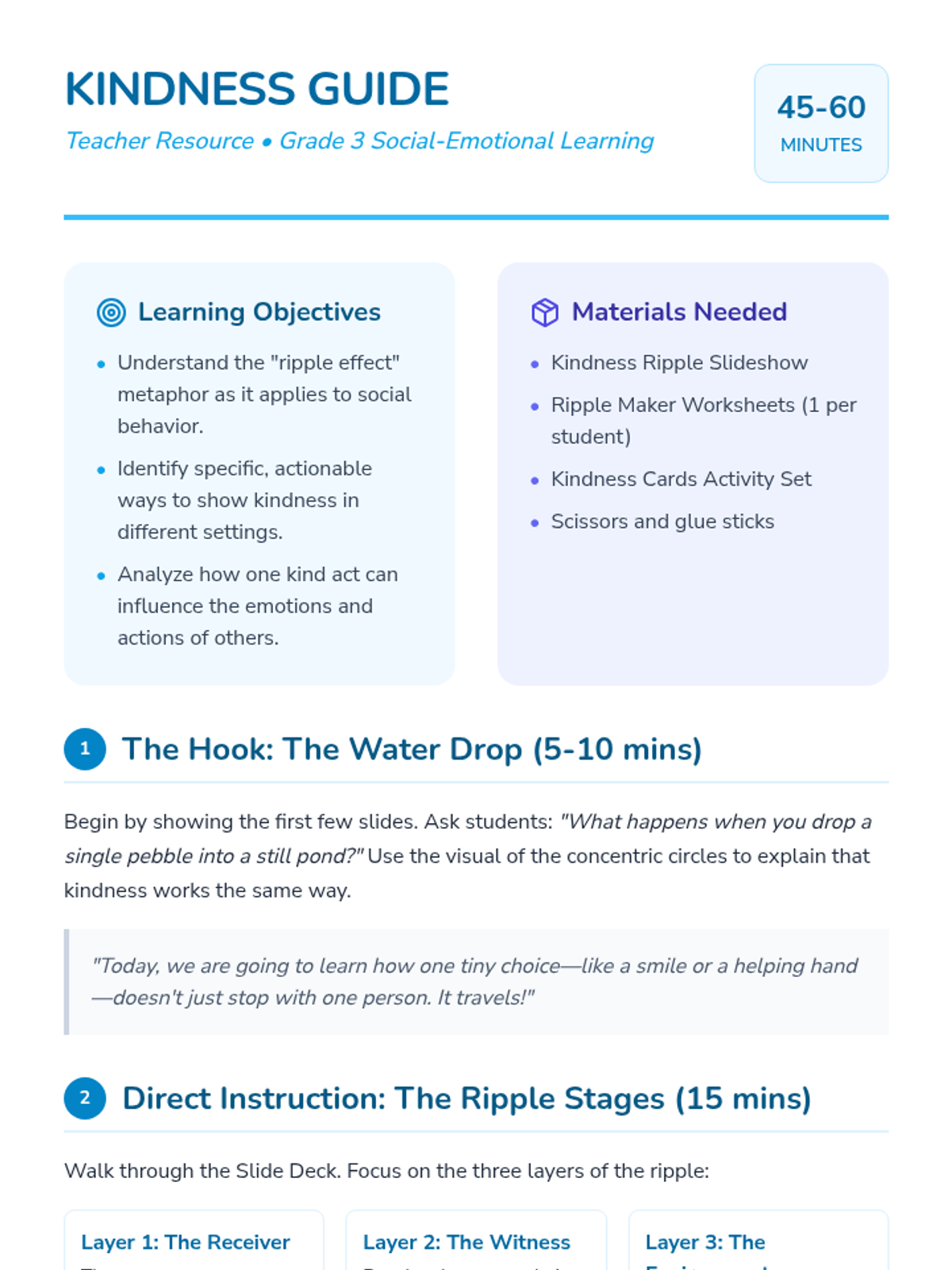 A heartwarming lesson for 3rd graders on how small acts of kindness create a positive chain reaction in their classroom and community. Students will explore the 'ripple' metaphor through storytelling, interactive slides, and a creative mapping activity.