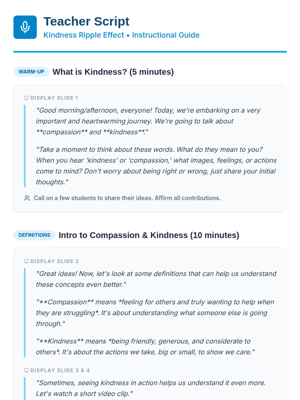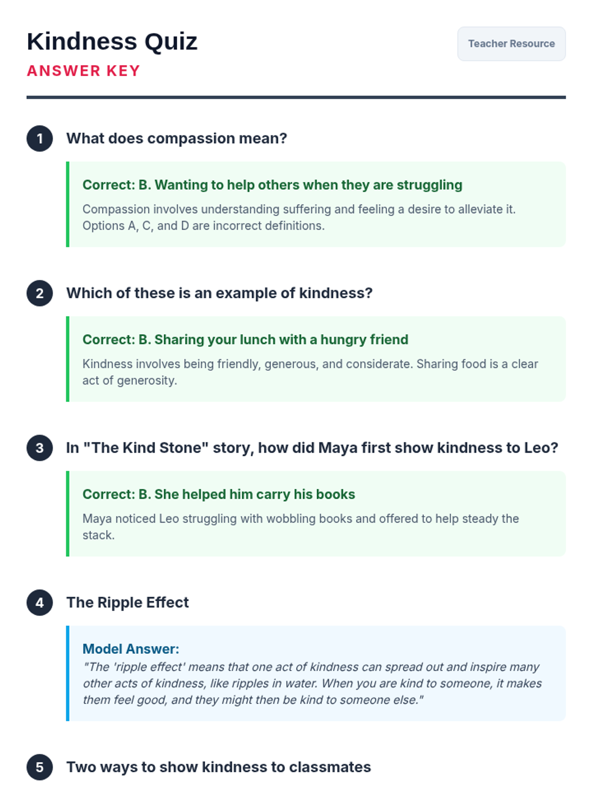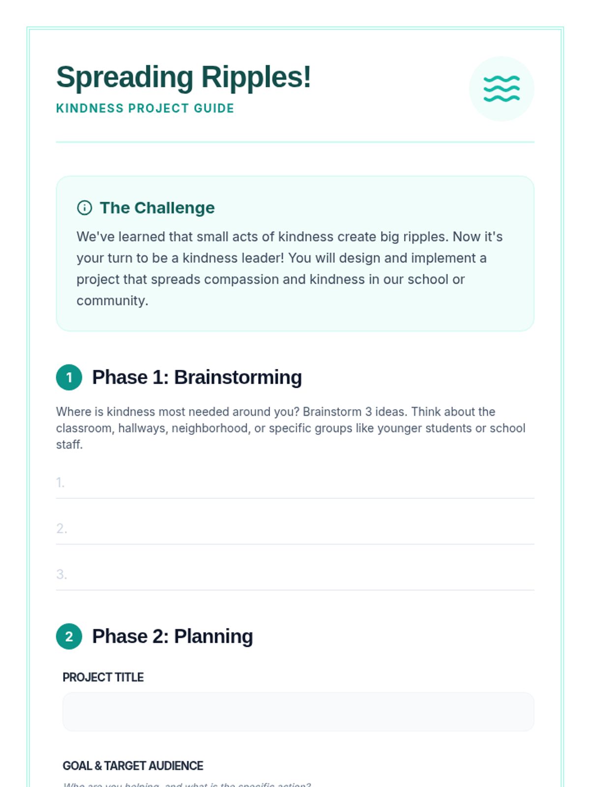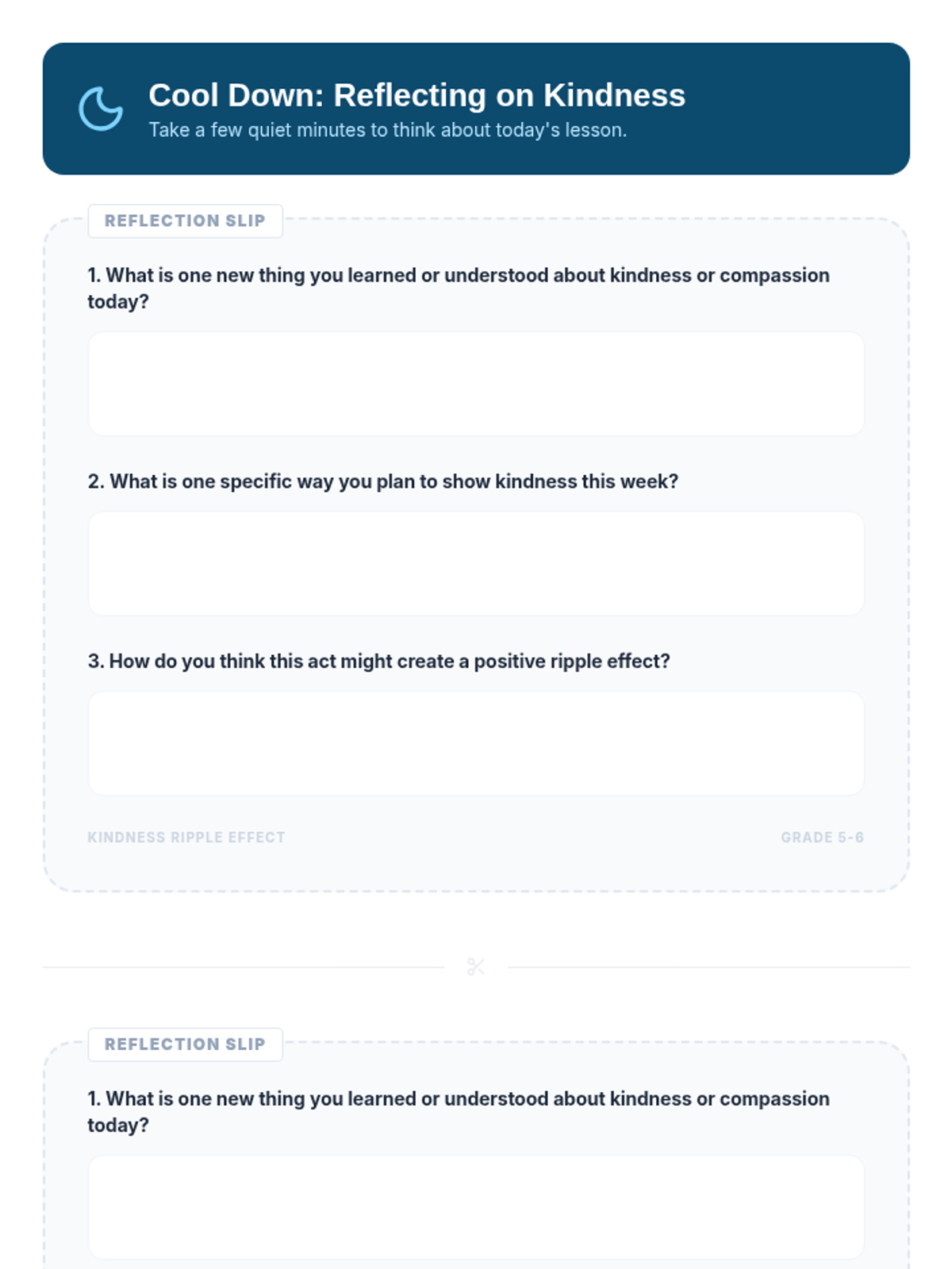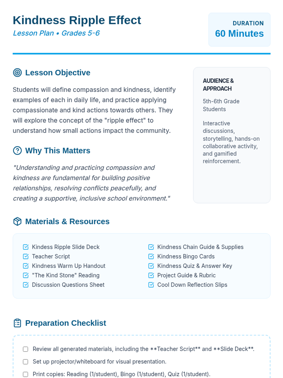 A 60-minute session for 5th-6th graders exploring compassion and kindness through the metaphor of a ripple effect. Students engage in a story, hands-on activity, and ongoing project to foster empathy and positive community relationships.