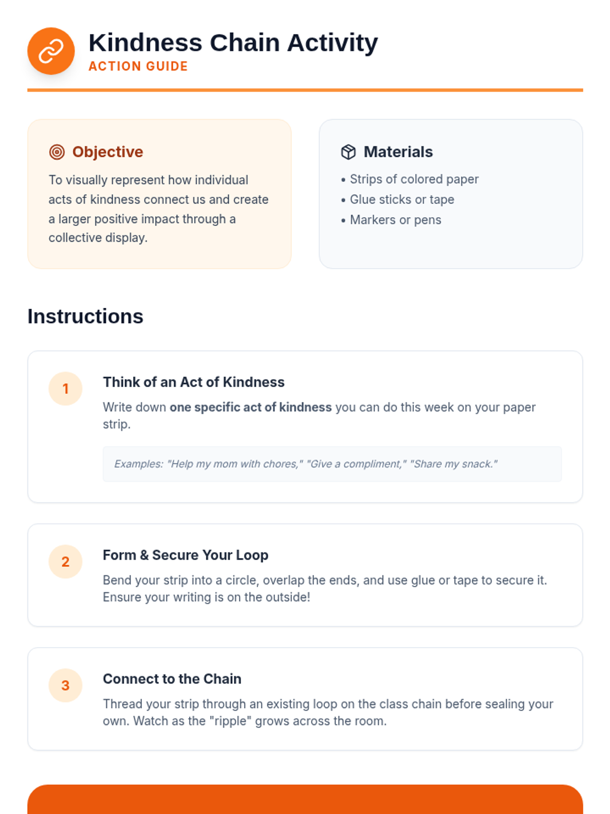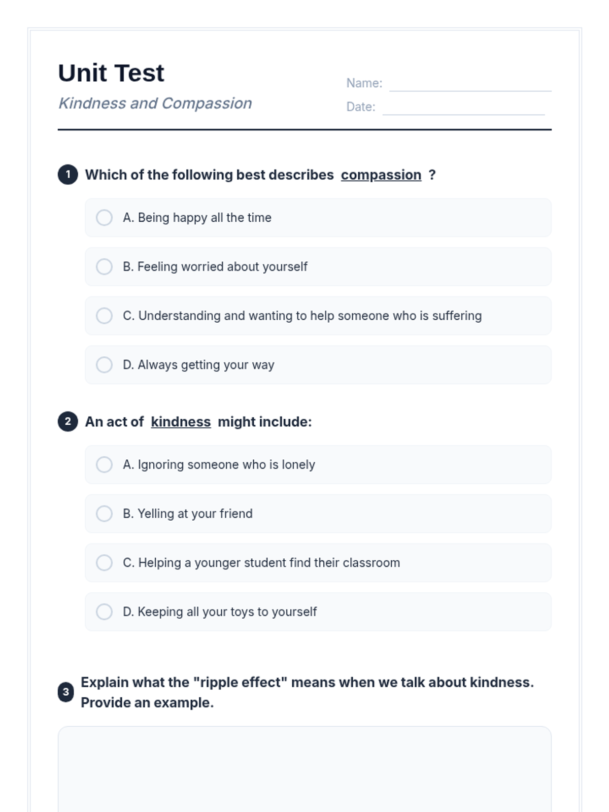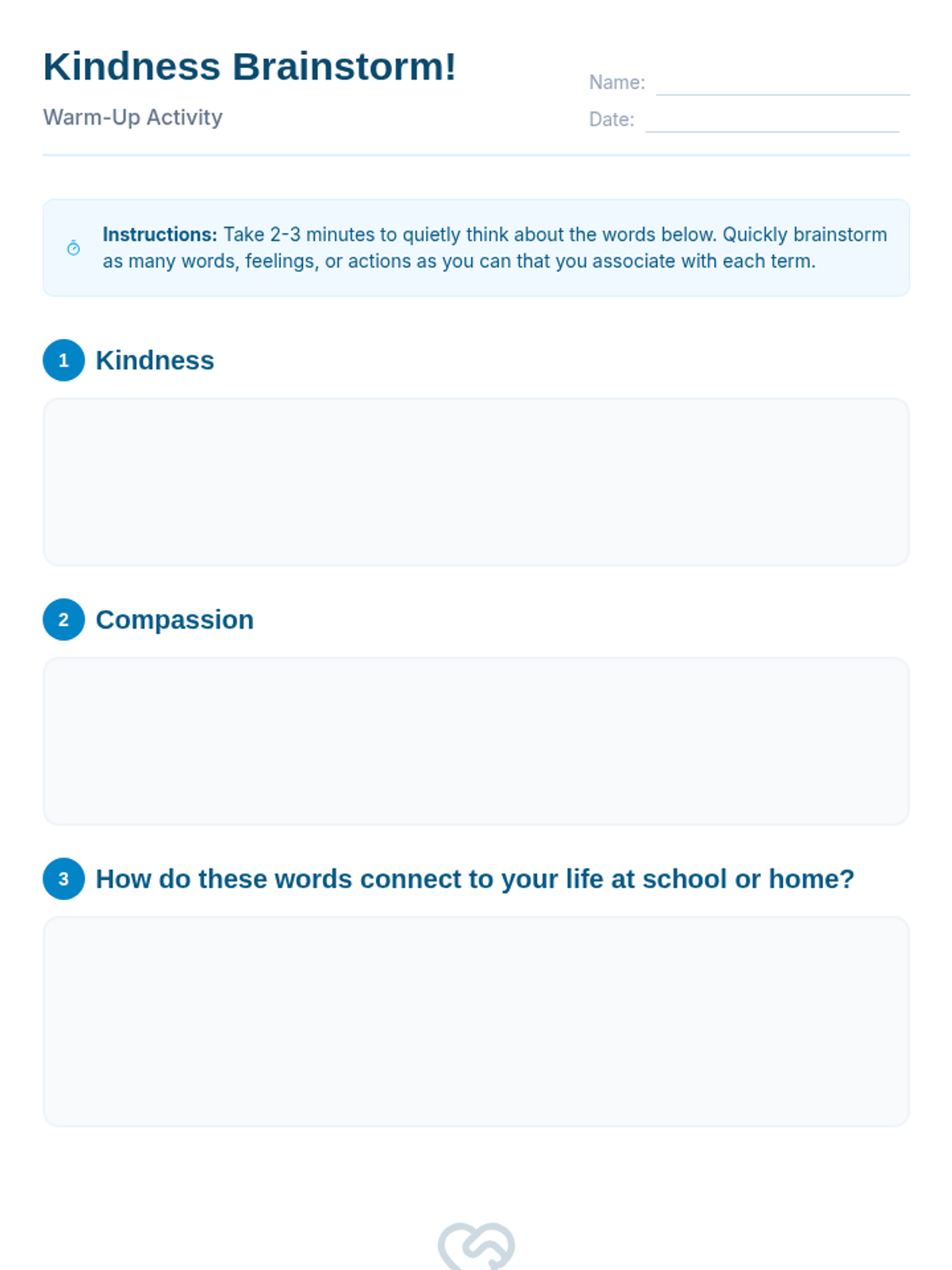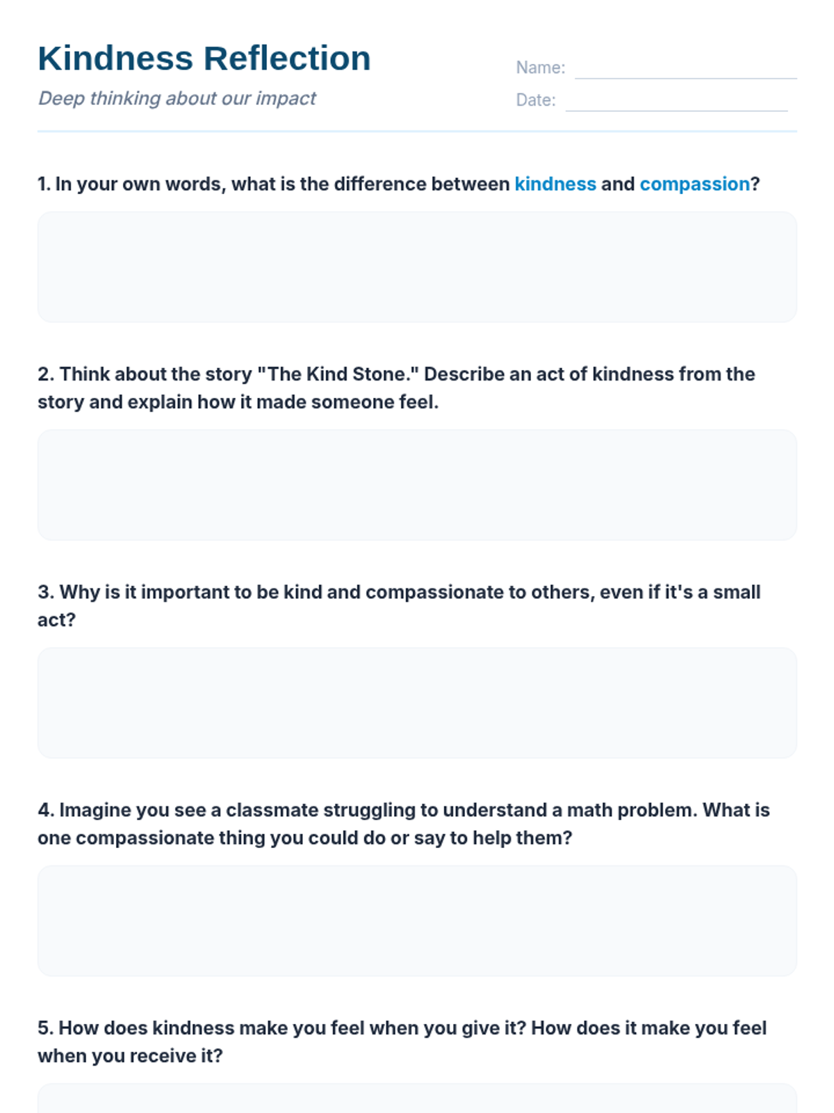 A 60-minute session for 5th-6th graders exploring compassion and kindness through the metaphor of a ripple effect. Students engage in a story, hands-on activity, and ongoing project to foster empathy and positive community relationships.