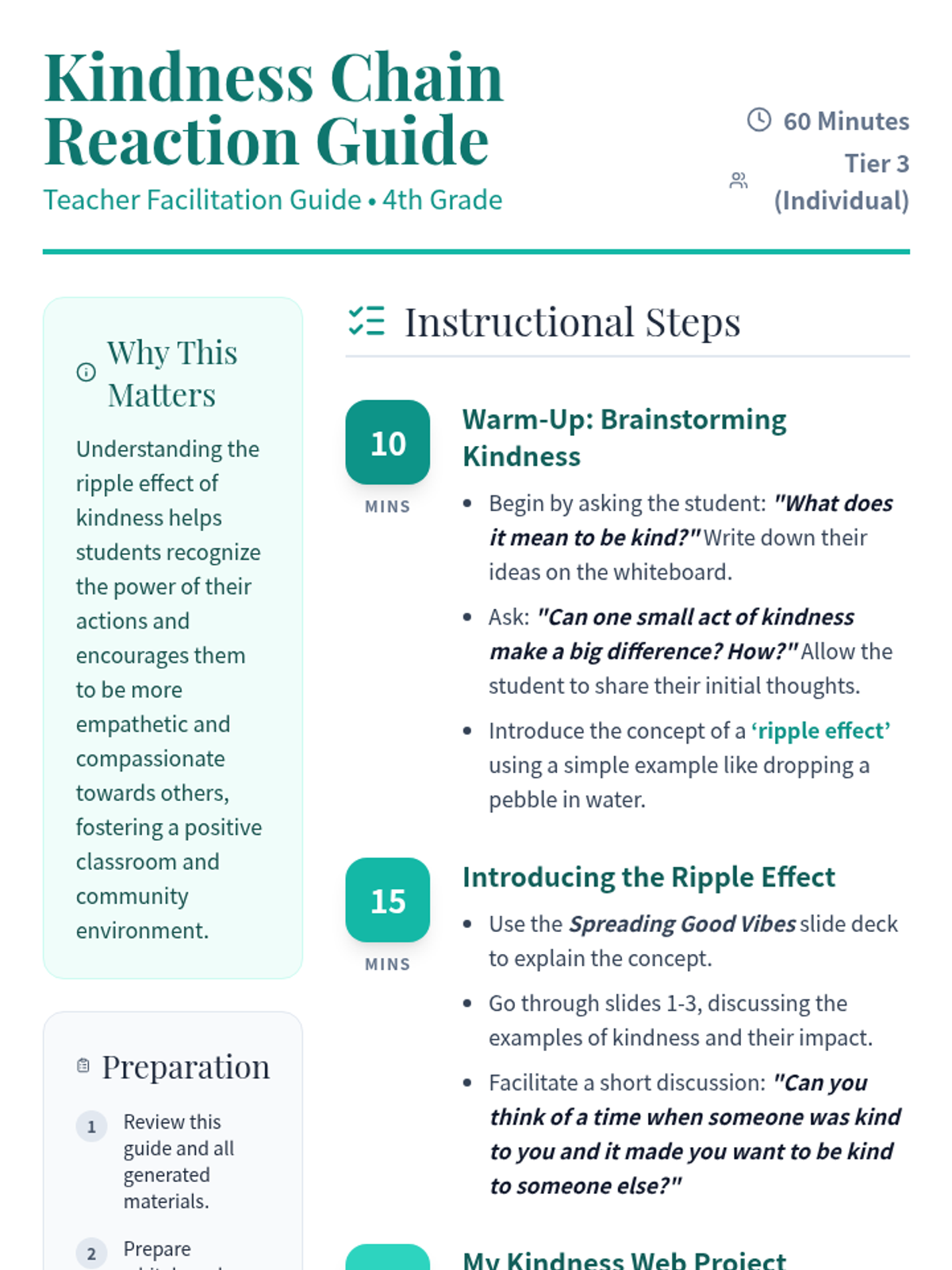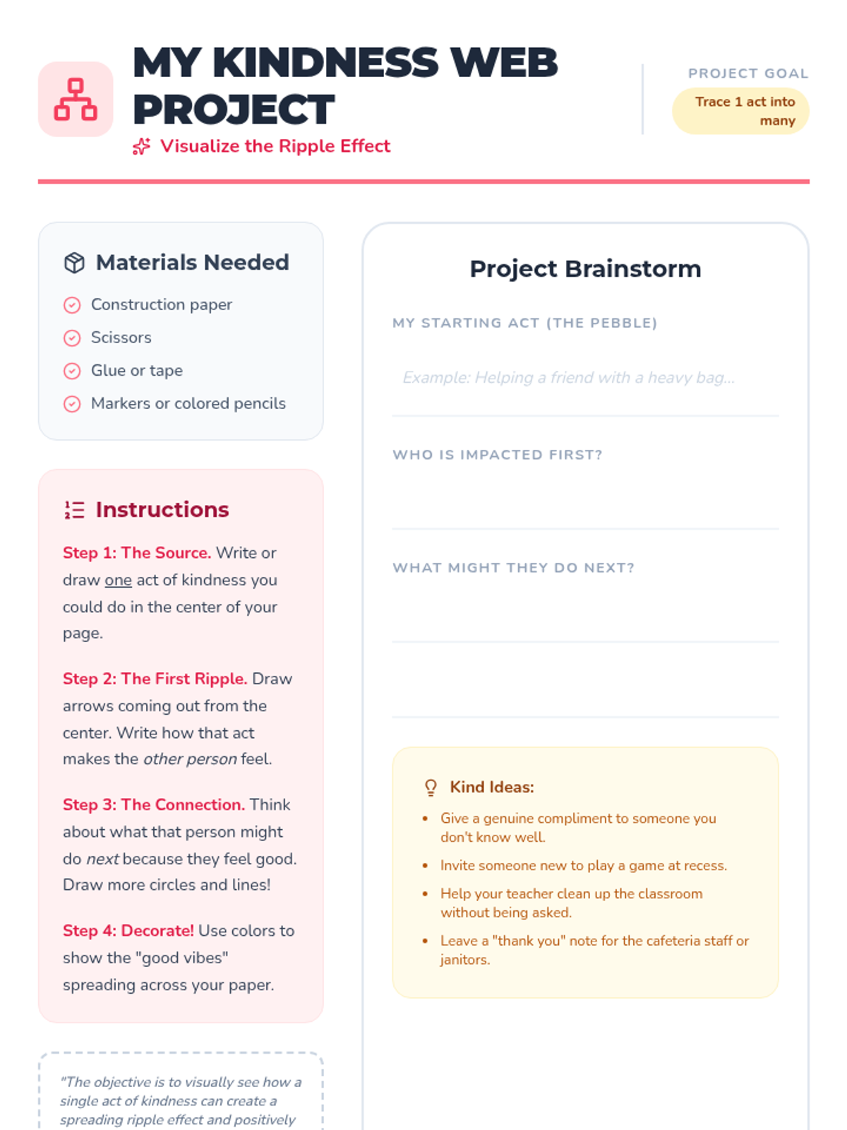 A lesson exploring the 'ripple effect' of kindness, demonstrating how small acts can create positive chain reactions. Designed for 4th-grade students to foster empathy and community through discussion and a hands-on project.