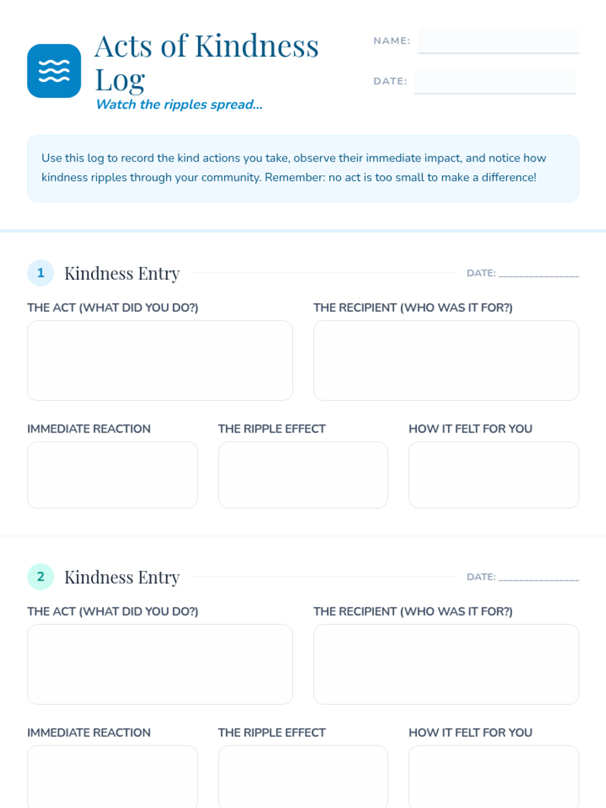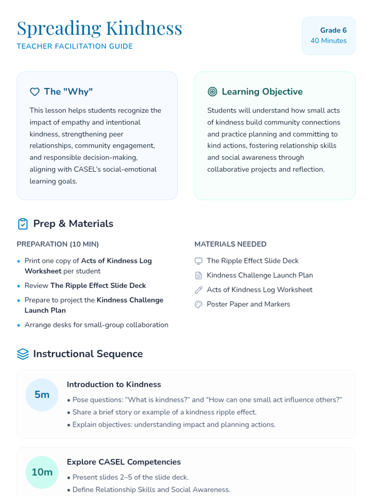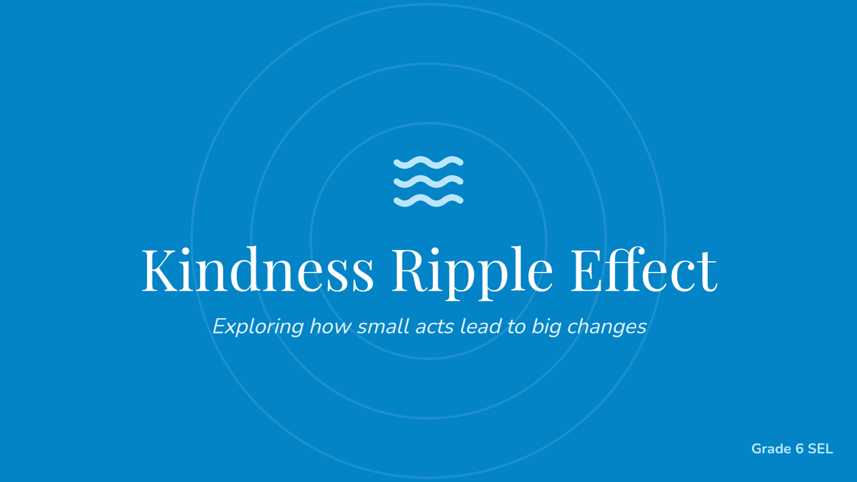 An SEL-focused lesson for 6th graders exploring how small acts of kindness create a ripple effect. Includes a detailed lesson plan, presentation slides, a group project template, and a personal kindness log.