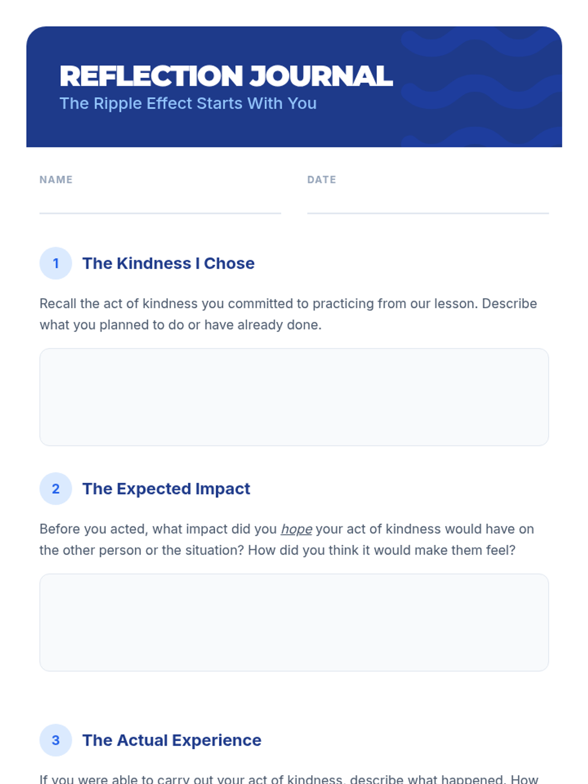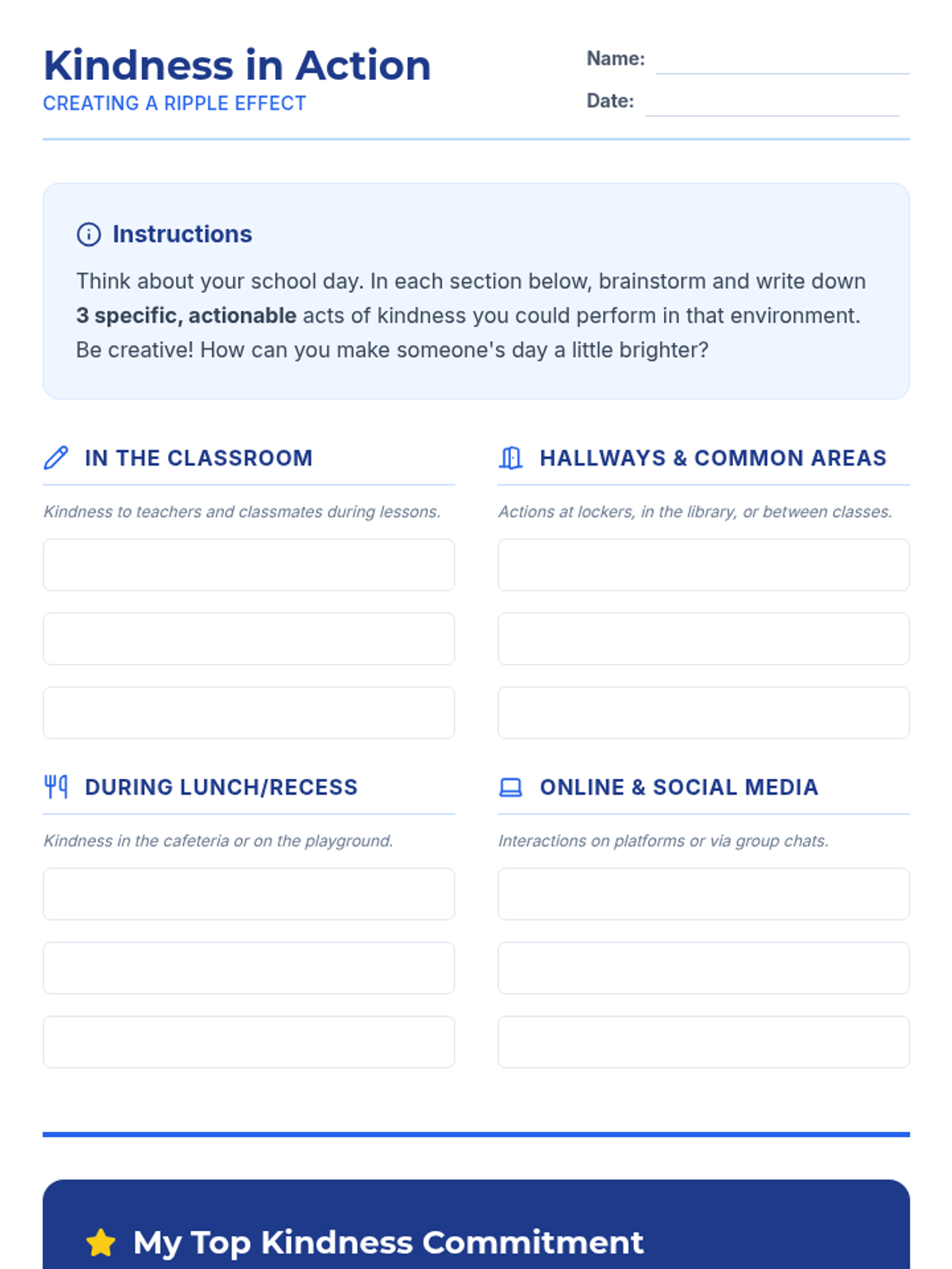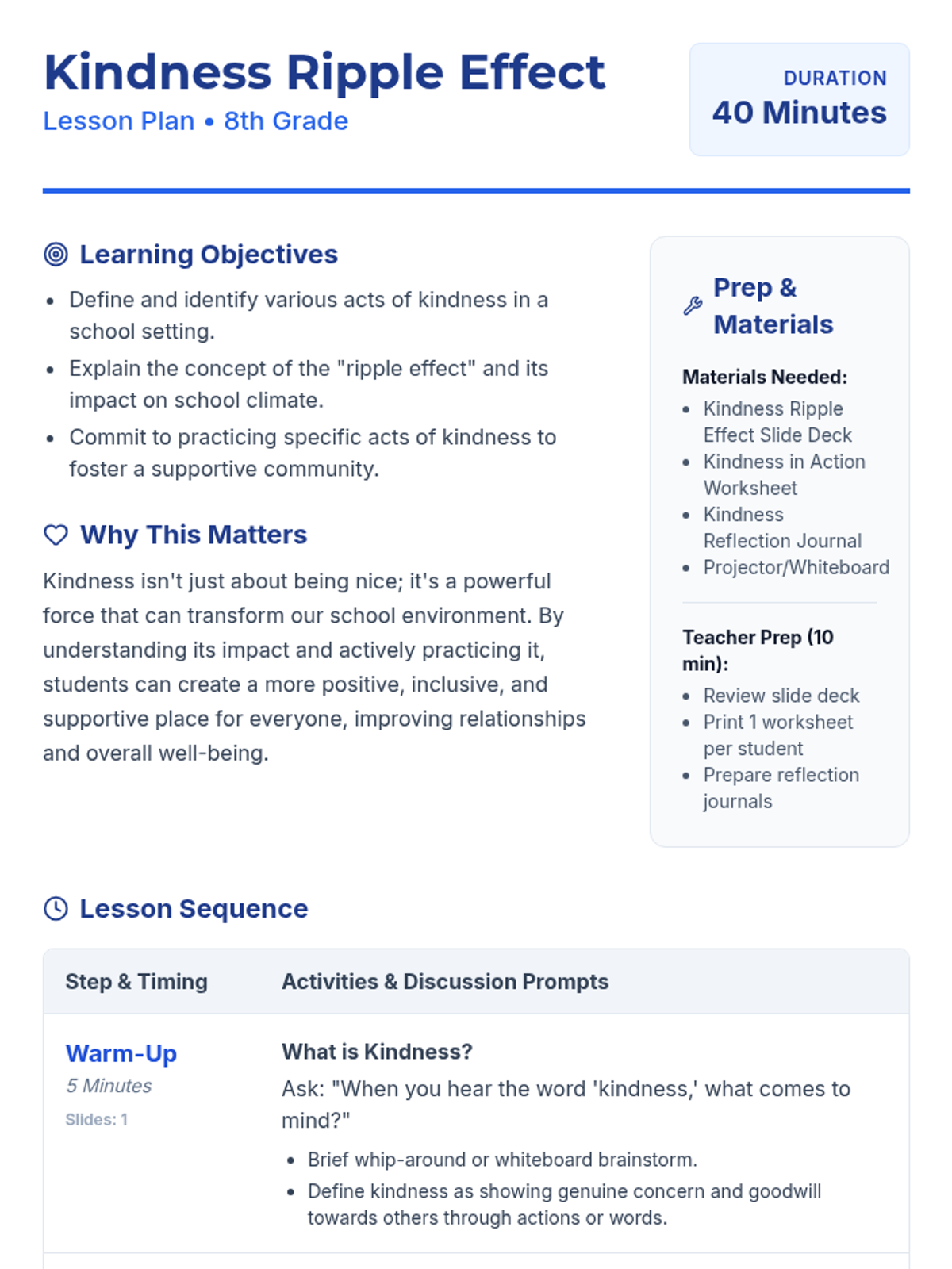 This lesson explores how individual acts of kindness can create a ripple effect, positively influencing the entire school climate. Students will identify practical ways to demonstrate kindness and understand their role in fostering a supportive community. For 8th-grade students, 1 session, 40 minutes.